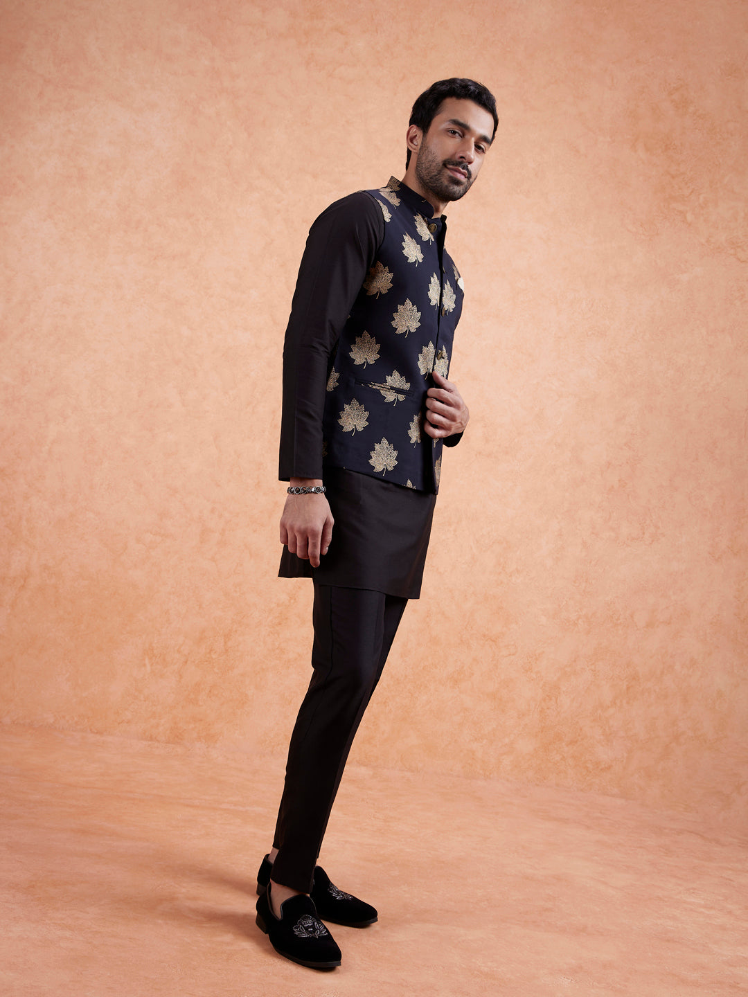 Black Silk Blend Golden Leaf Jacket Kurta Set