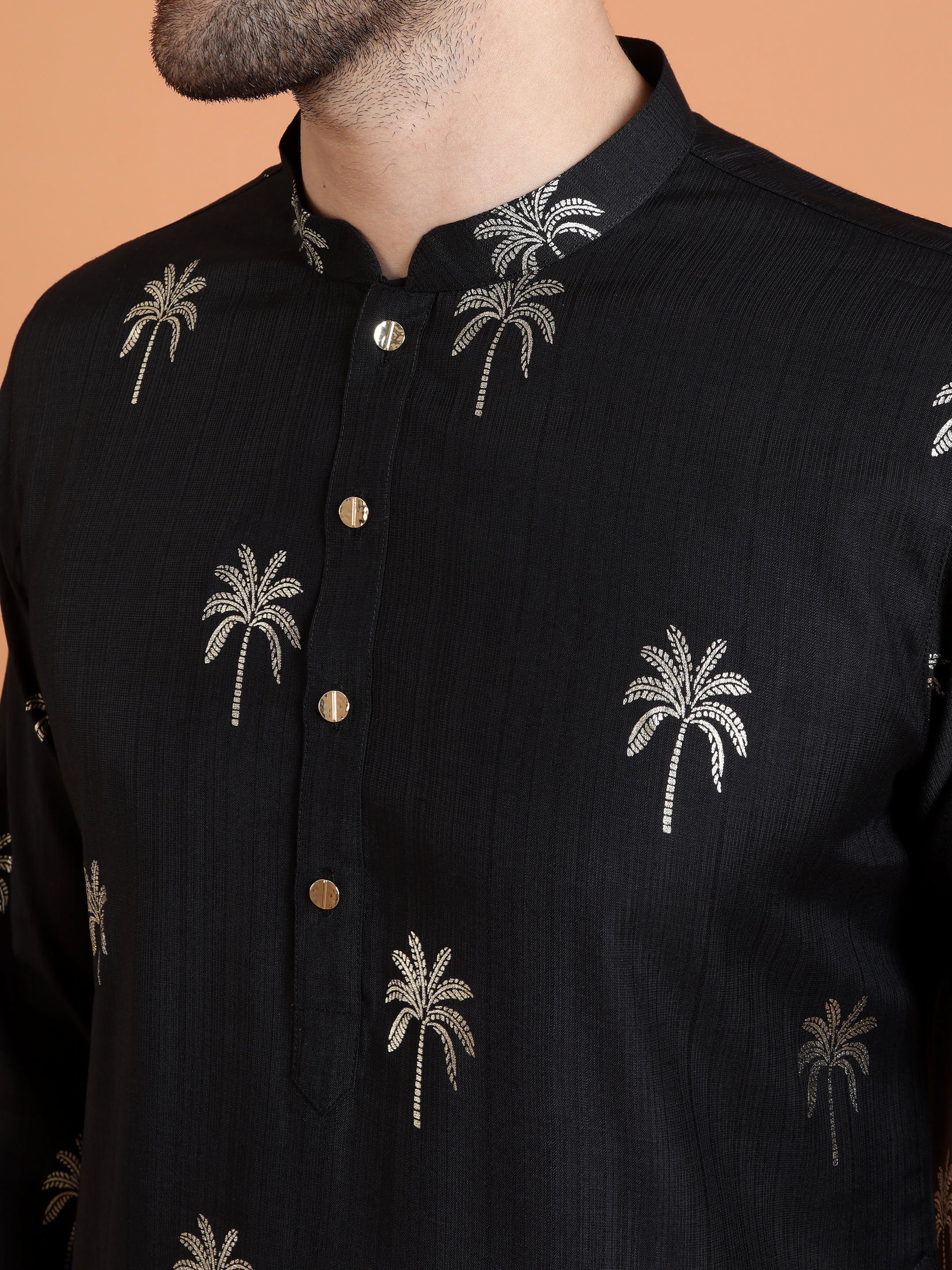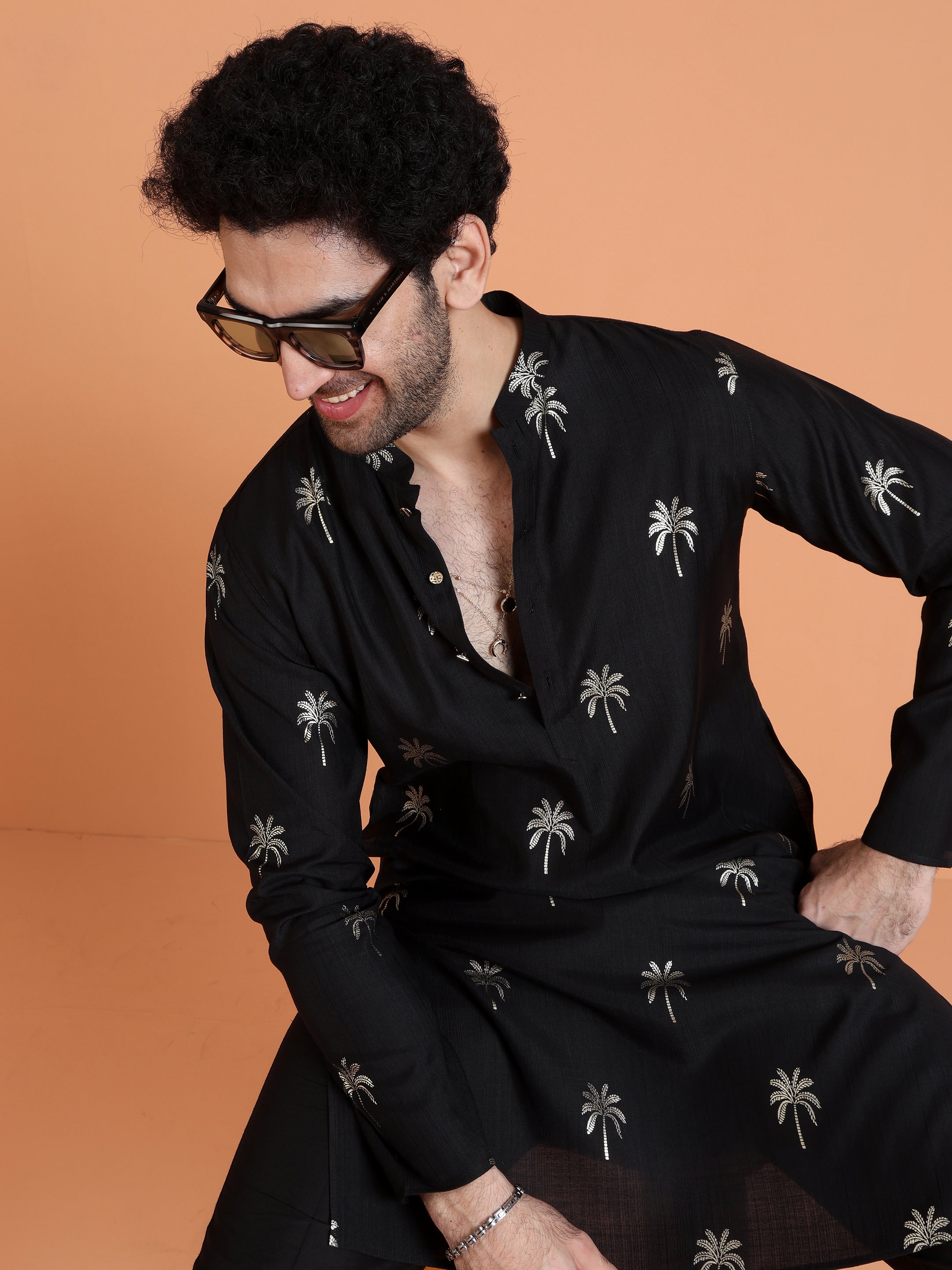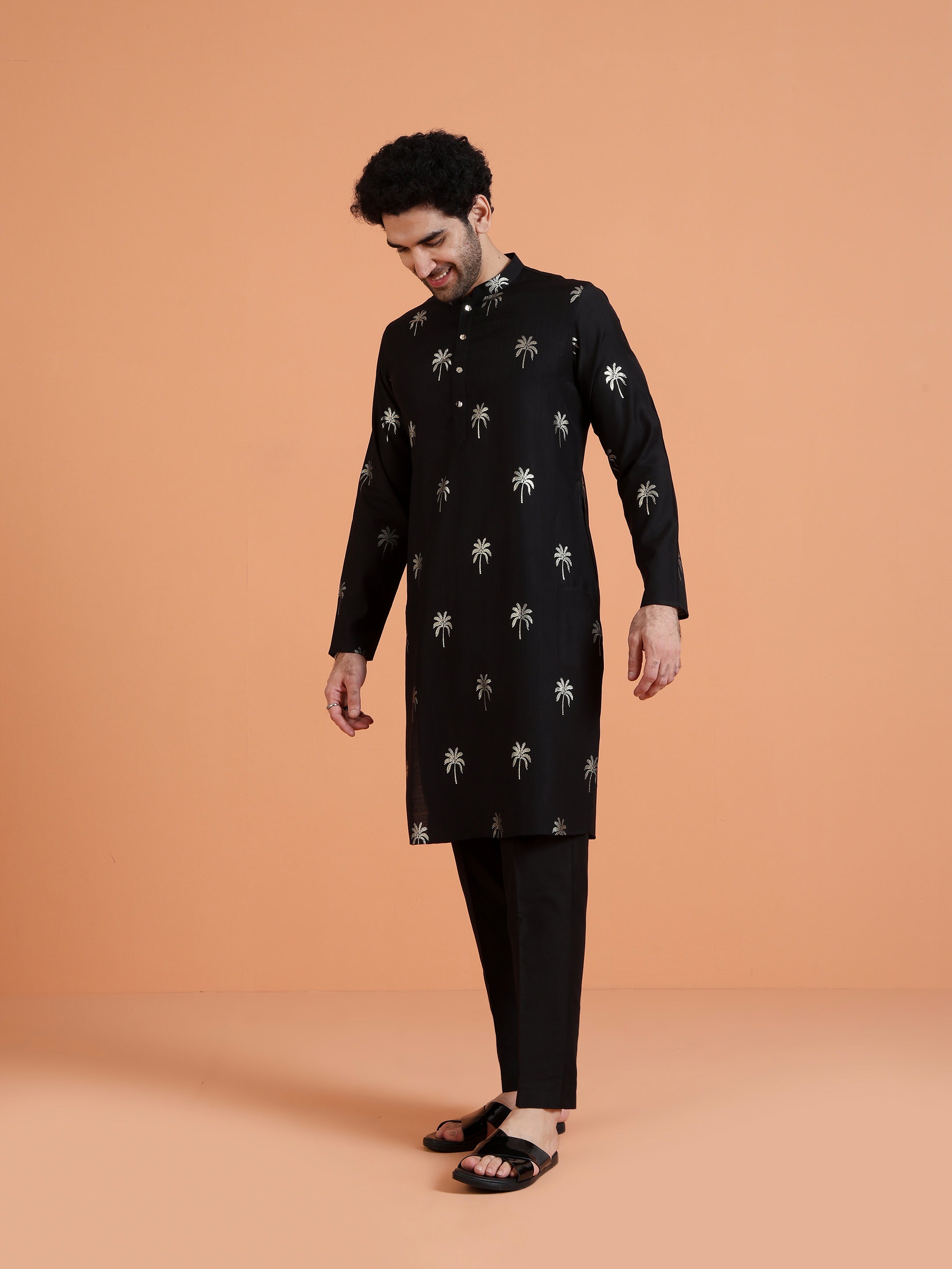 Kisah Black Embroidered Kurta in silk blend with palm motif embroidery. A festive ethnic wear for weddings and celebrations.