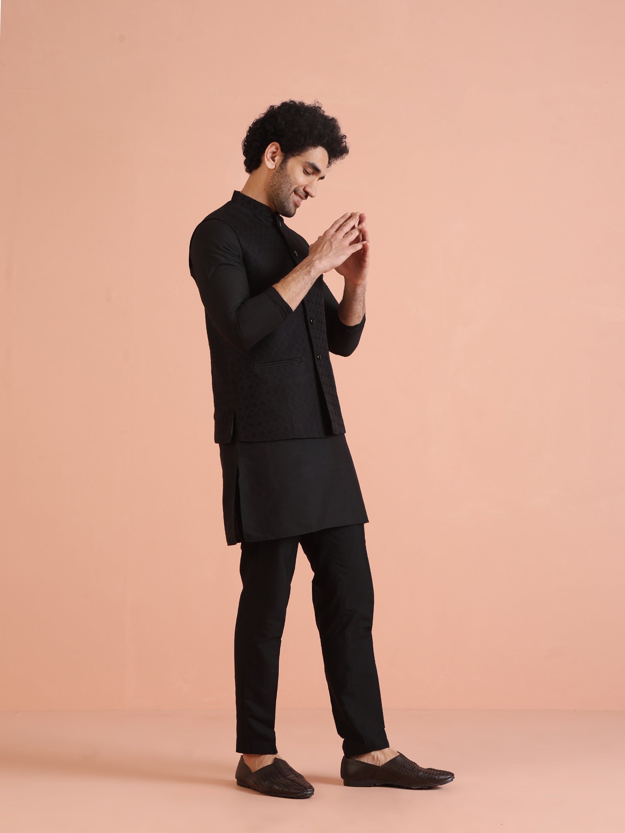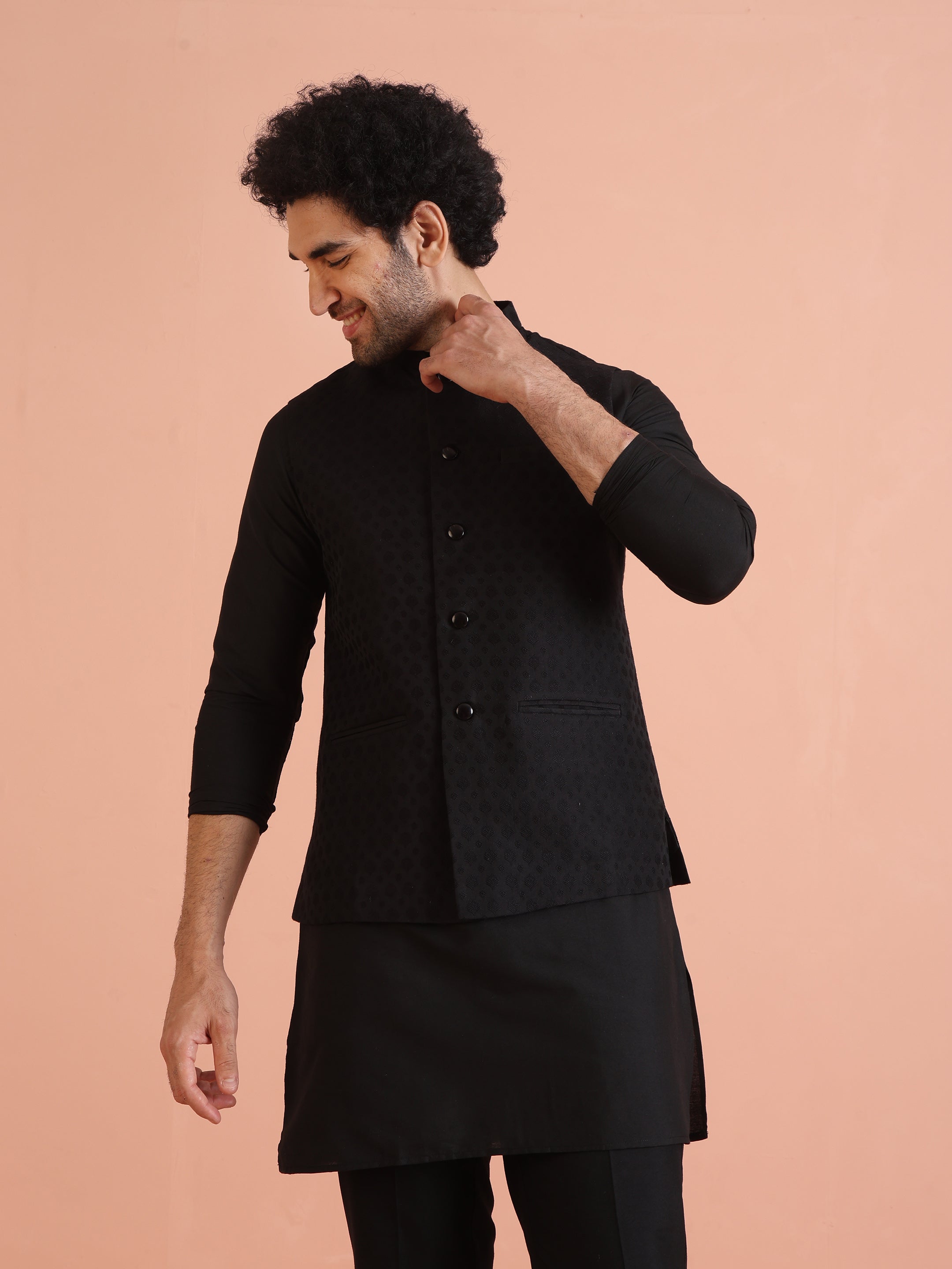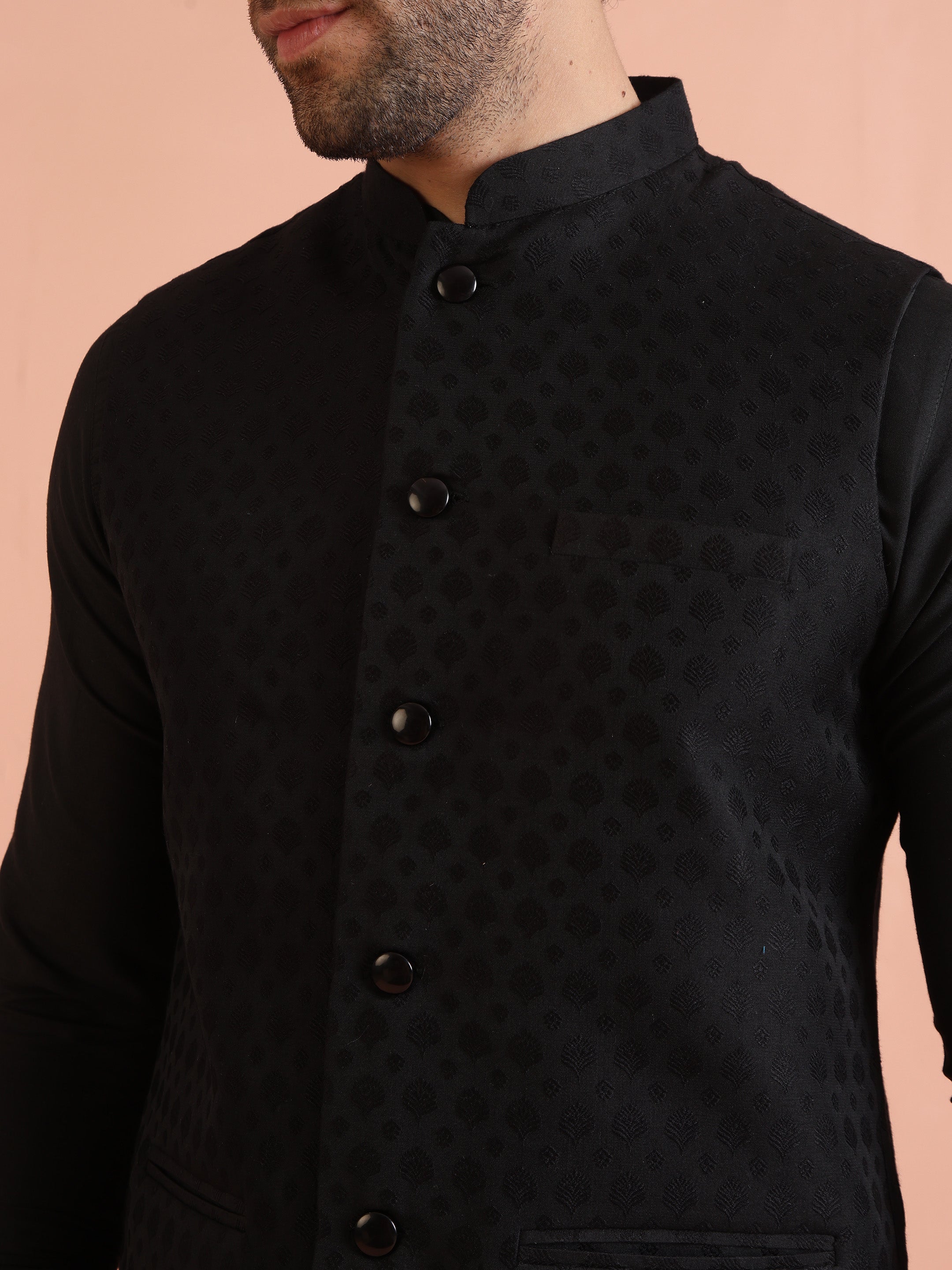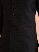 All-black jacquard woven Nehru jacket with matching kurta & trouser. A sleek men’s ethnicwear set for weddings, cocktail nights & festive occasions.