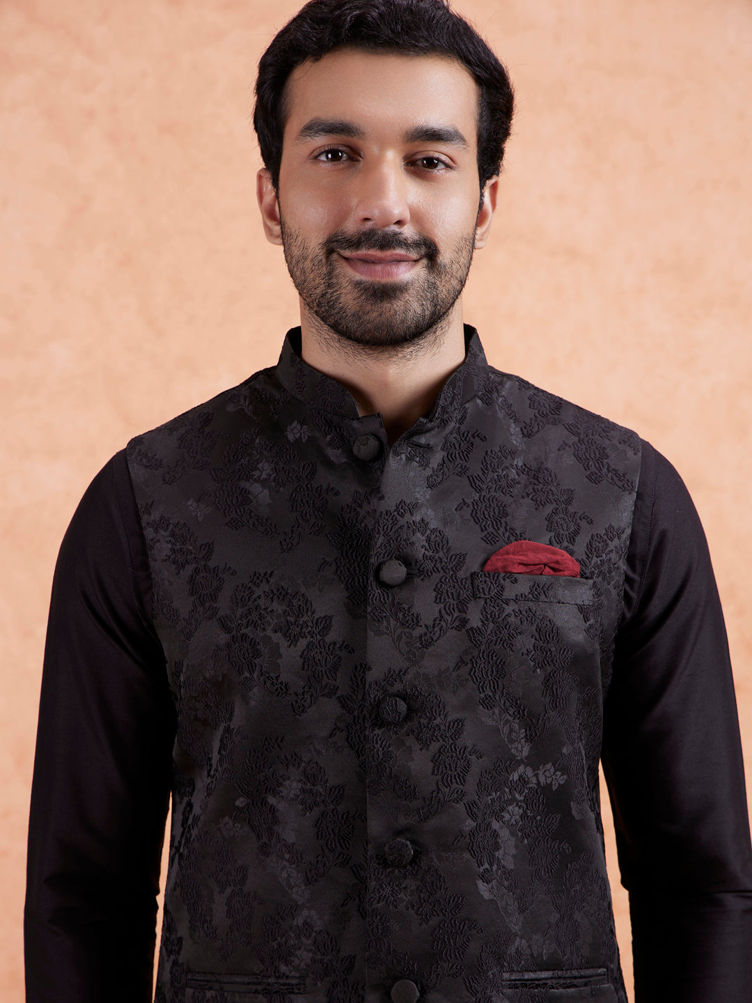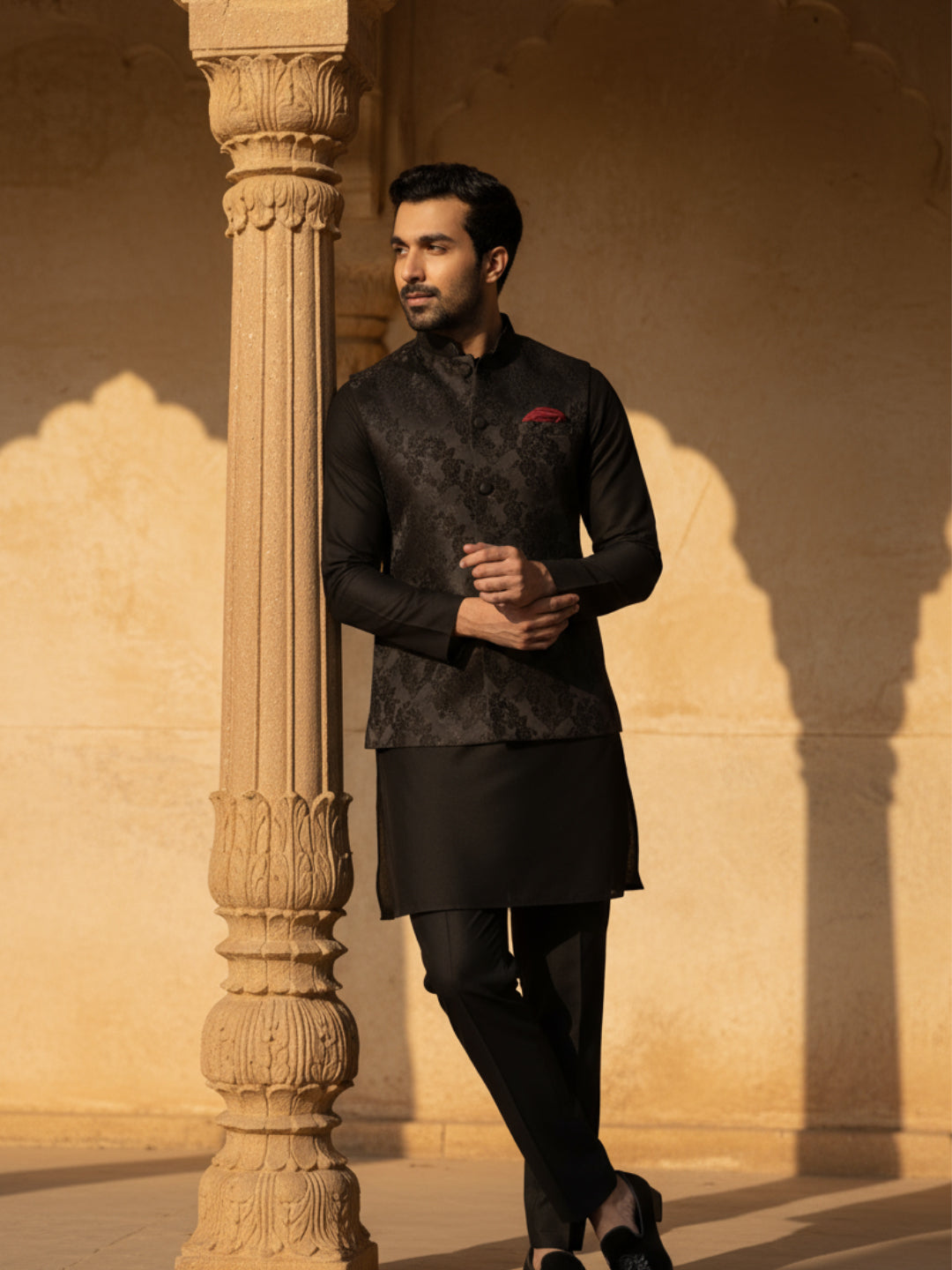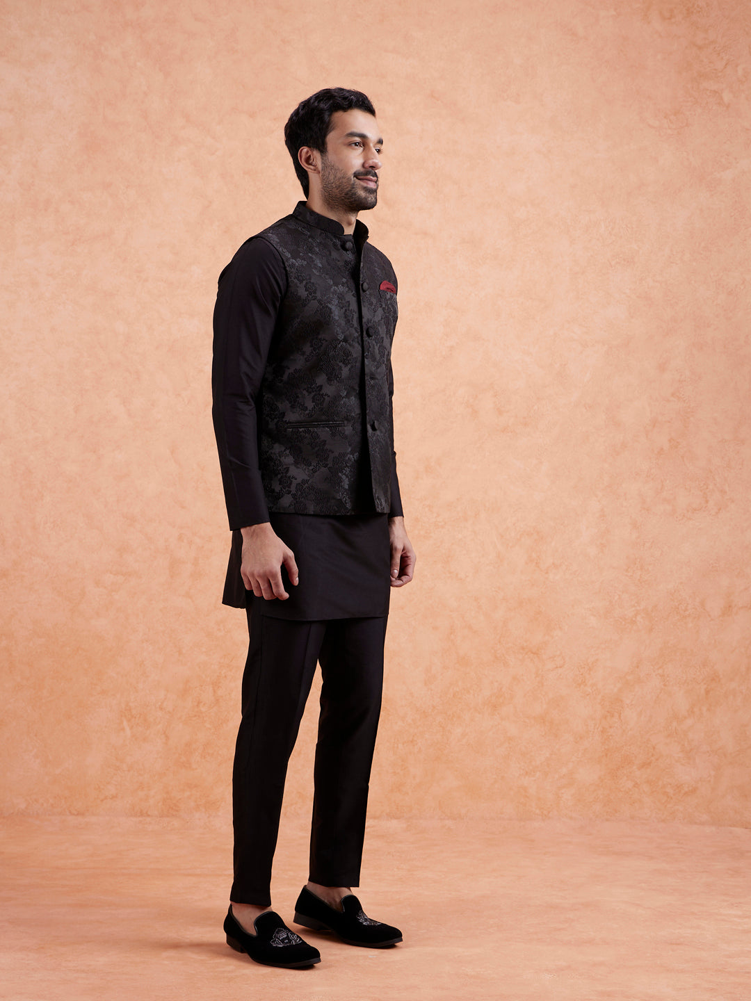 Black Silk Blend Jacquard Mid Kurta Jacket Trouser Set, Perfect festive ethnic wear for men, ideal festive and casual occasions.