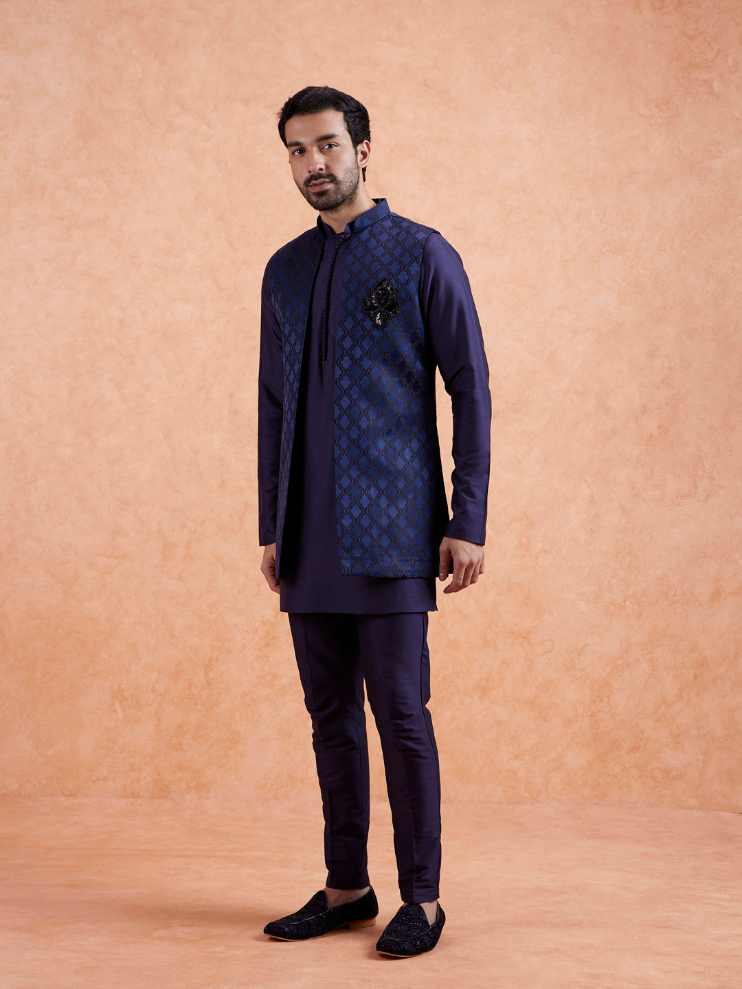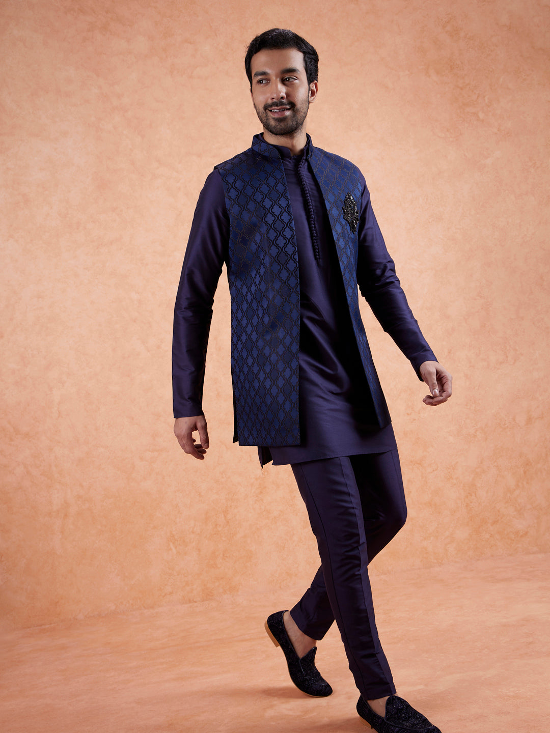 Blue Silk Blend Ethnic Motifs Mid Kurta Front Open Jacket Trouser Set, Perfect festive ethnic wear for men, ideal festive and casual occasions.
