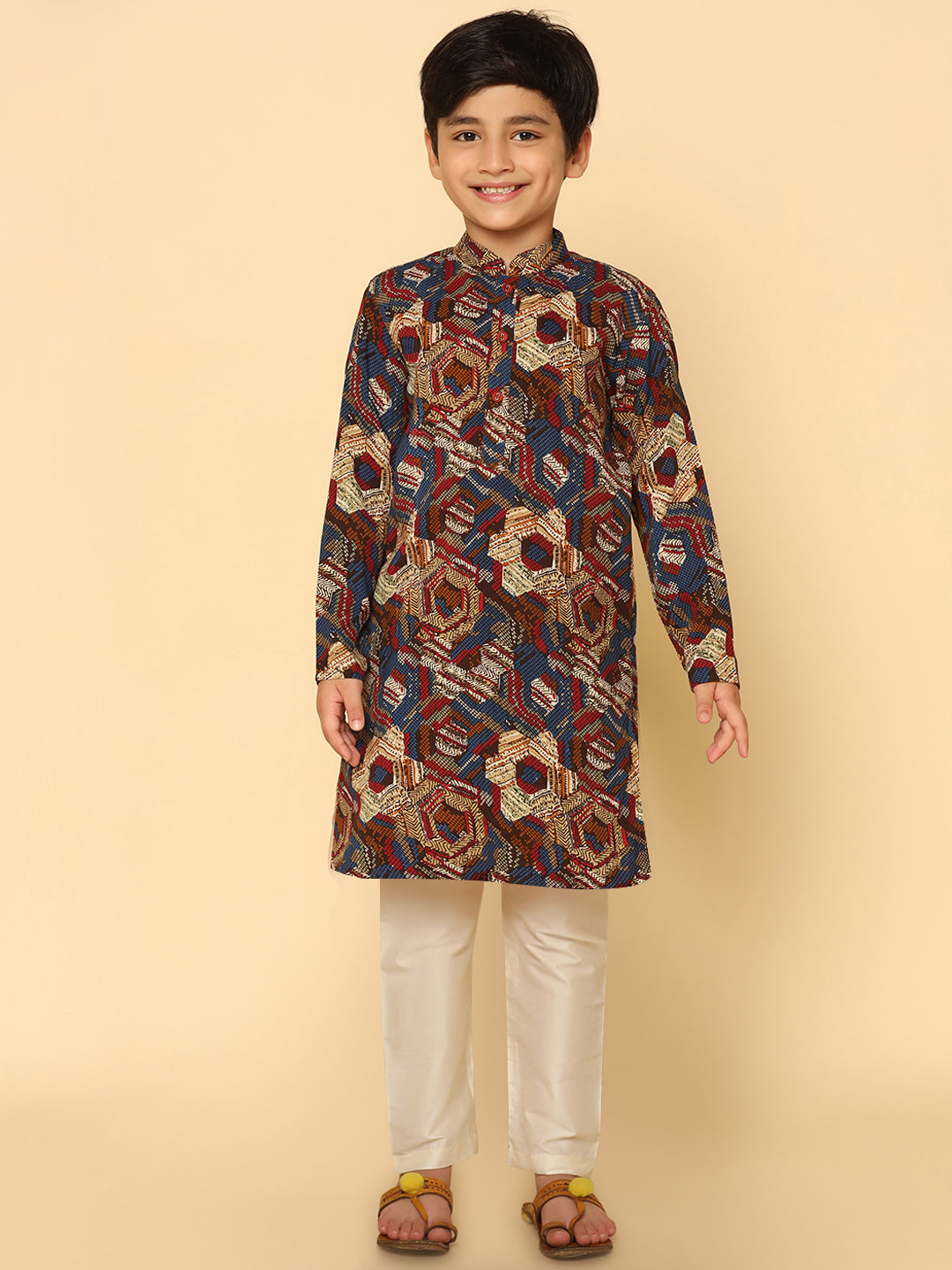 Boy's Multicolour Cotton Blend Printed Kurta Pyjama Set, Perfect festive ethnic wear for boy, ideal festive and casual occasions.