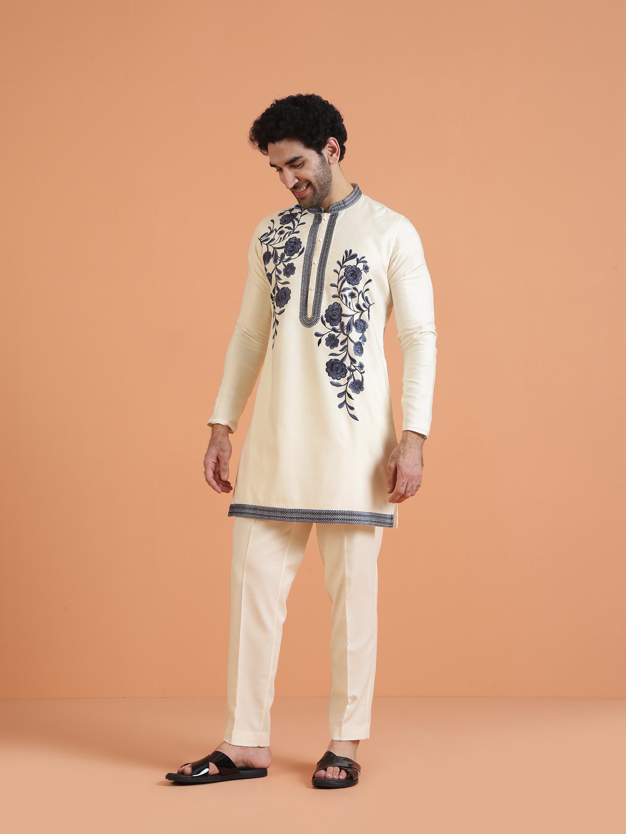 Kisah Cream Kurta with Navy Embroidery & Cream Trouser Set in silk blend. Elegant festive outfit with pockets, ideal for weddings and celebrations.