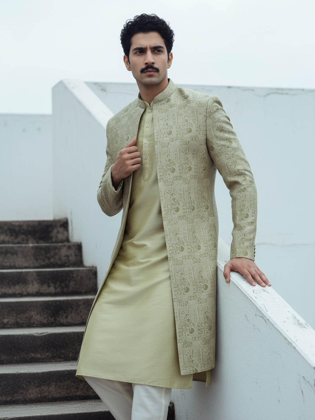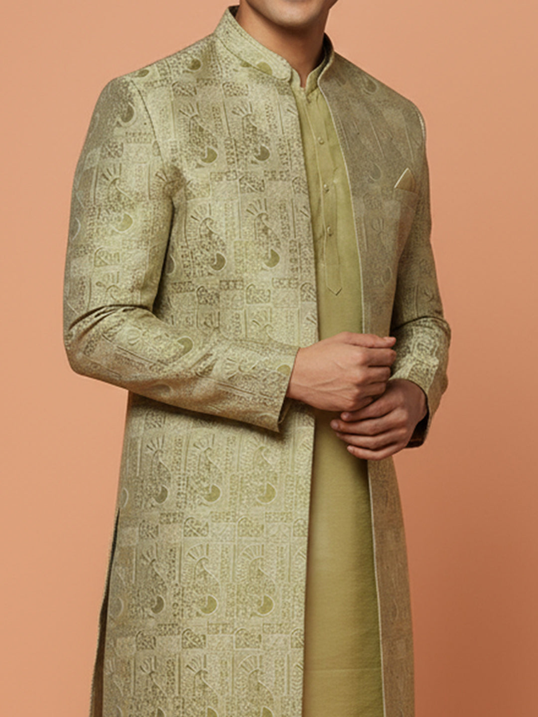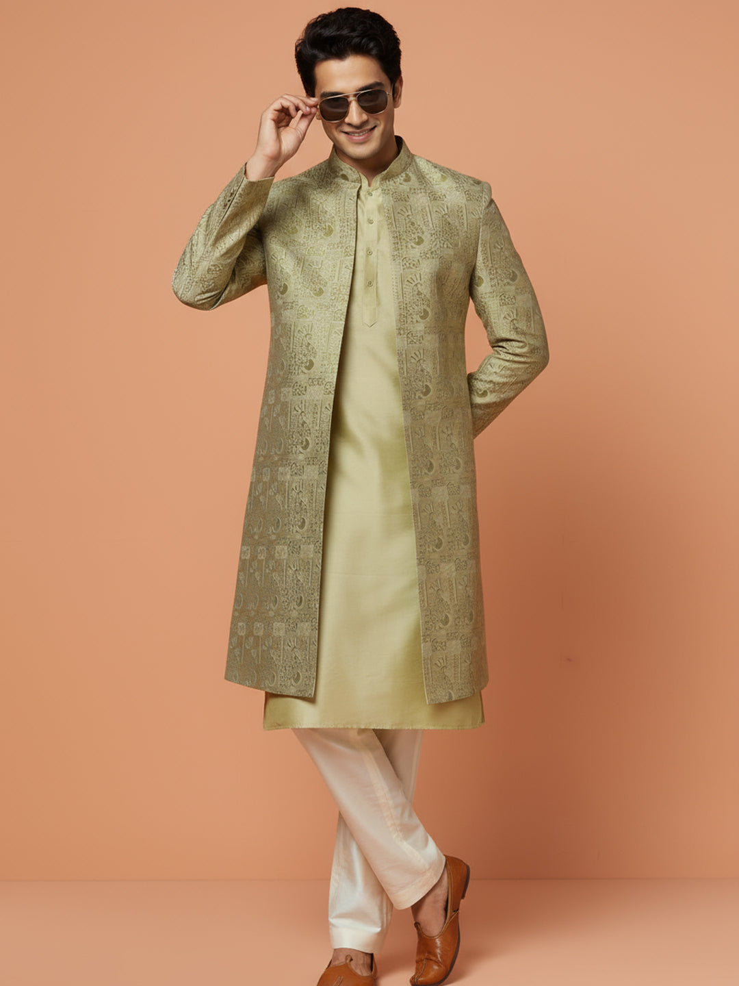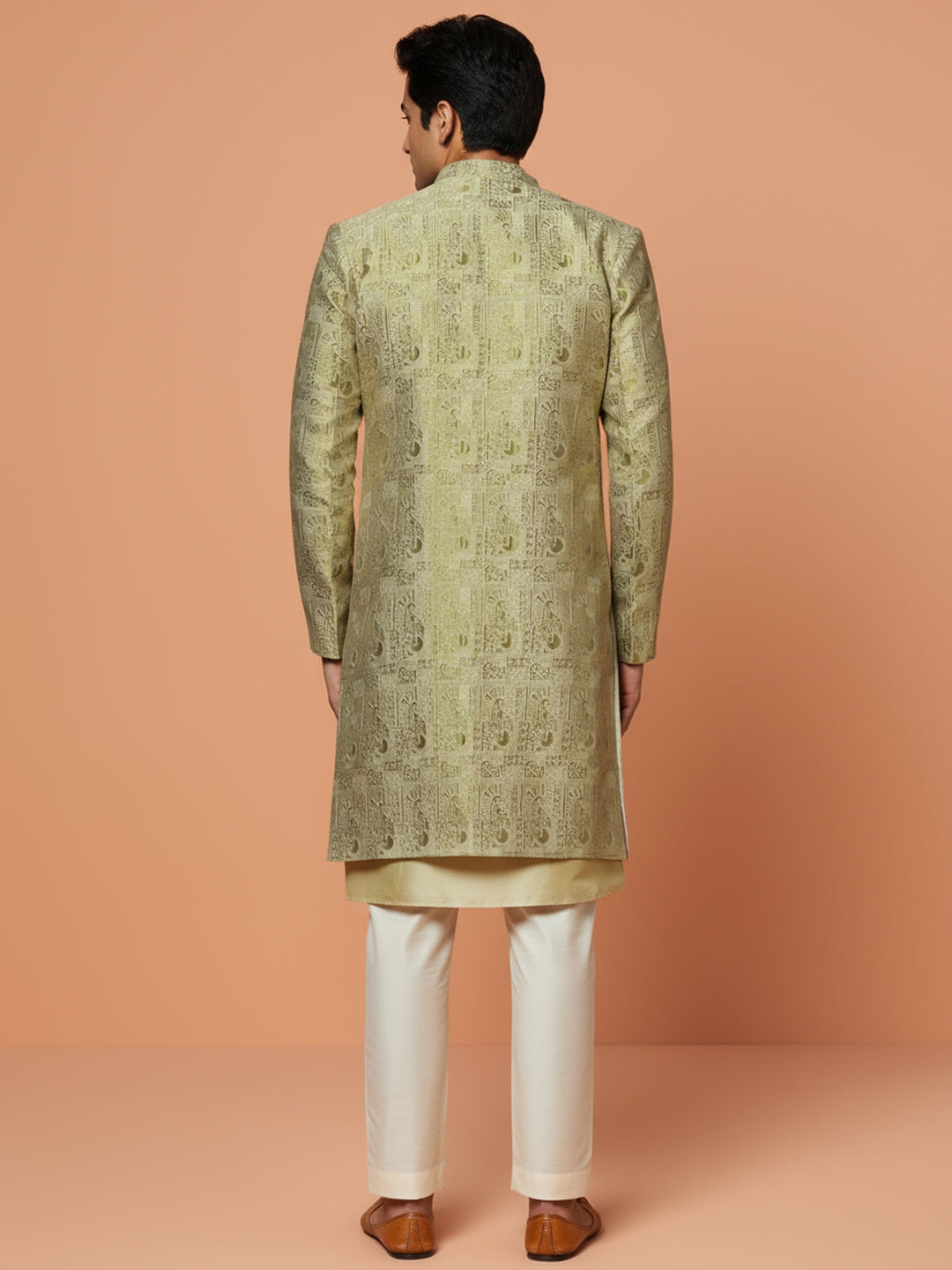 Gold brocade front-open sherwani with ivory wide-leg trouser — elegant, regal, and perfect for weddings or festive celebrations.