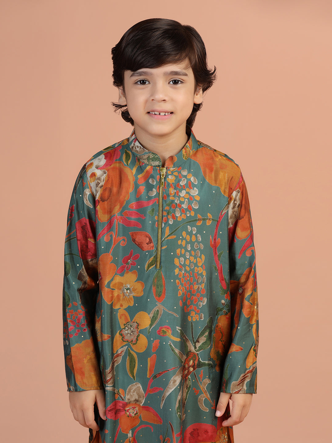 Stylish olive green floral printed satin kurta pyjama set for boys – vibrant, festive, and perfect for celebrations.