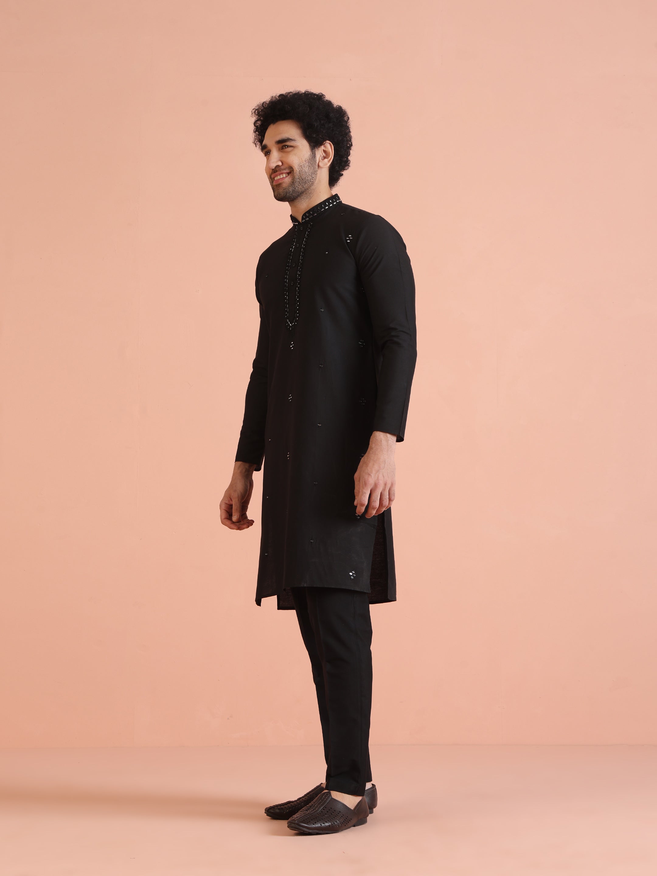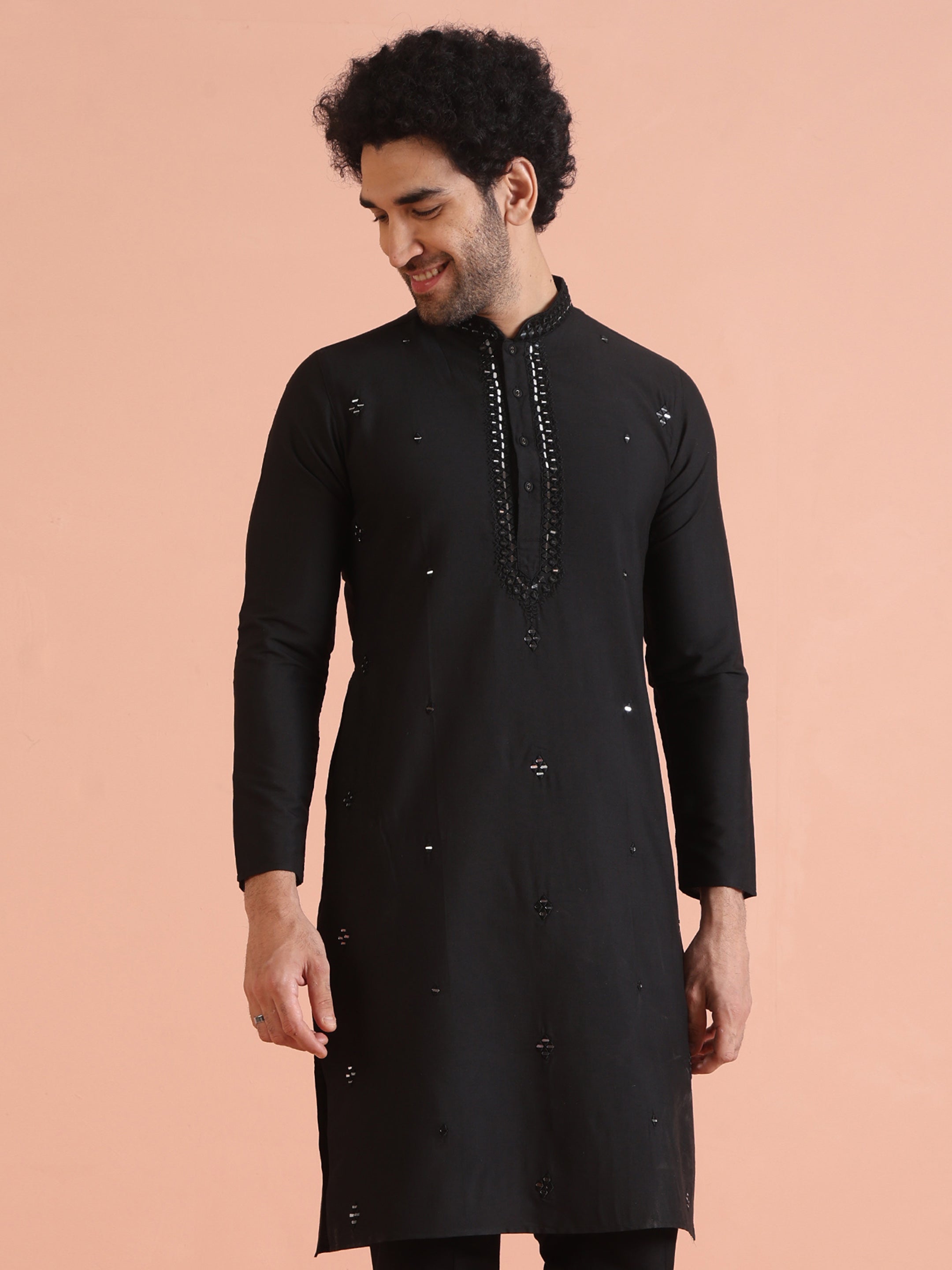 Elevate your ethnic collection with this black cotton blend kurta featuring mirror work embroidery. The regular fit ensures all-day comfort, ideal for festive occasions or casual traditional gatherings.