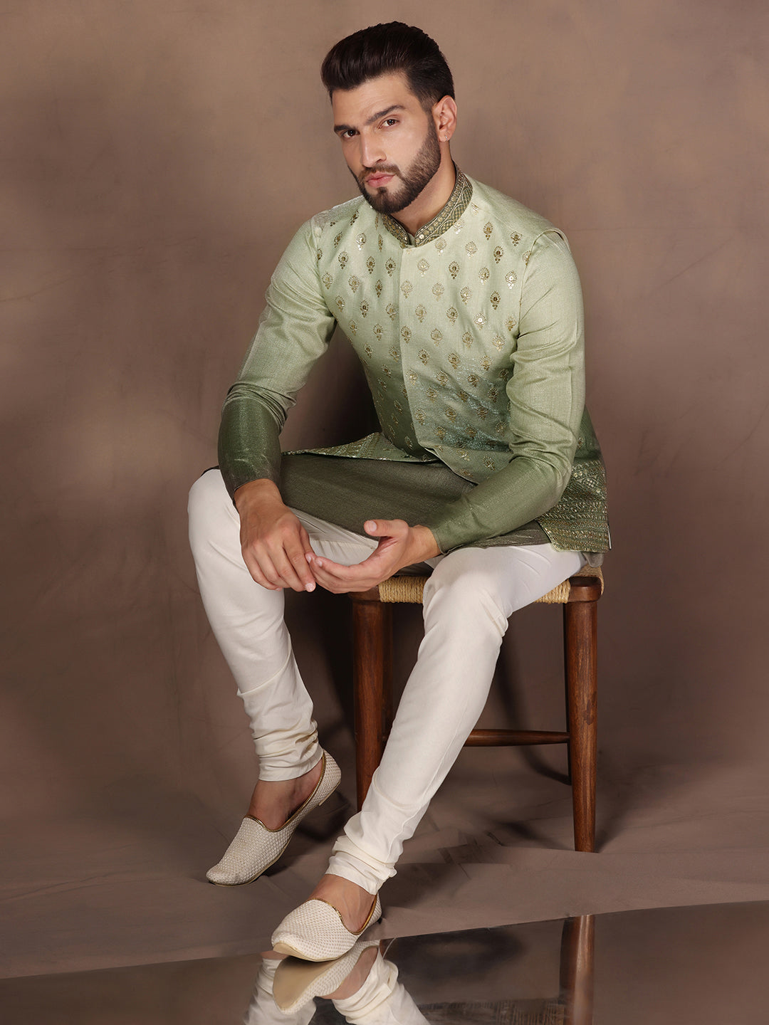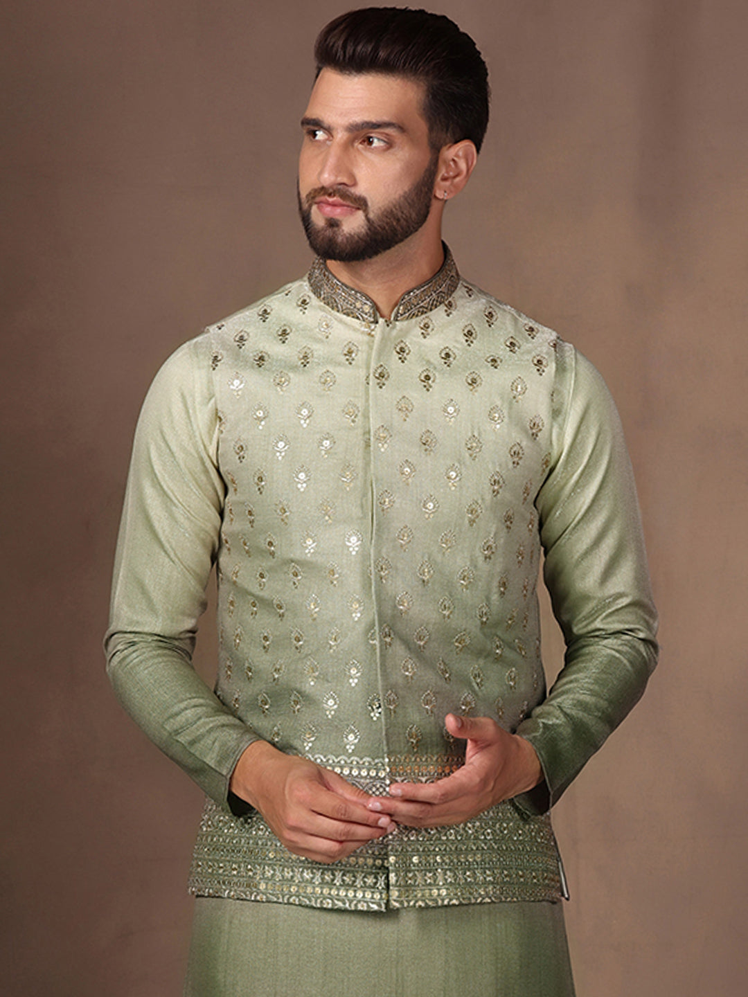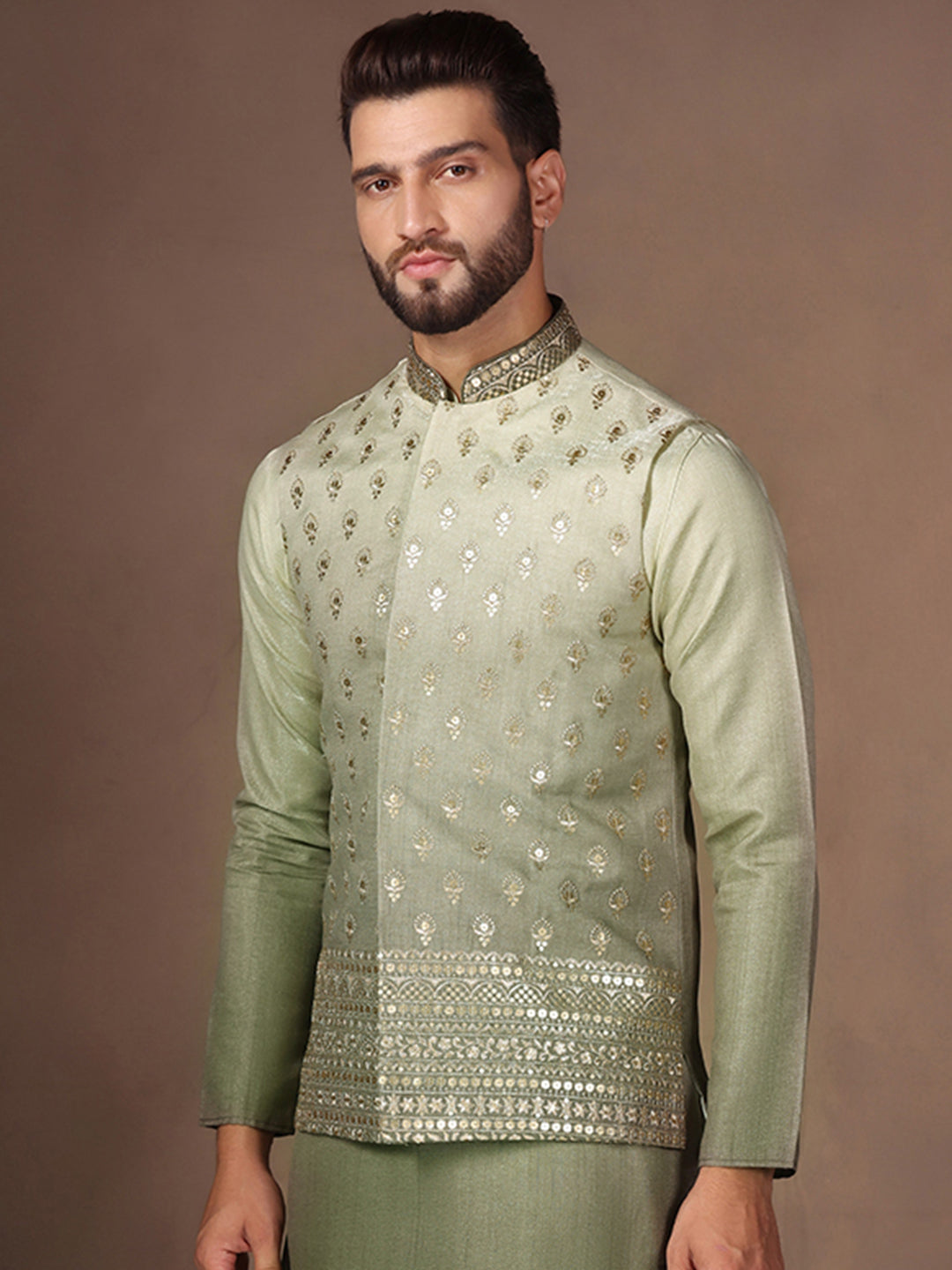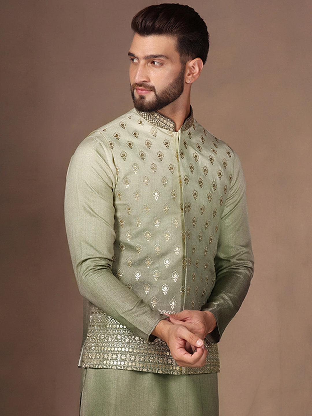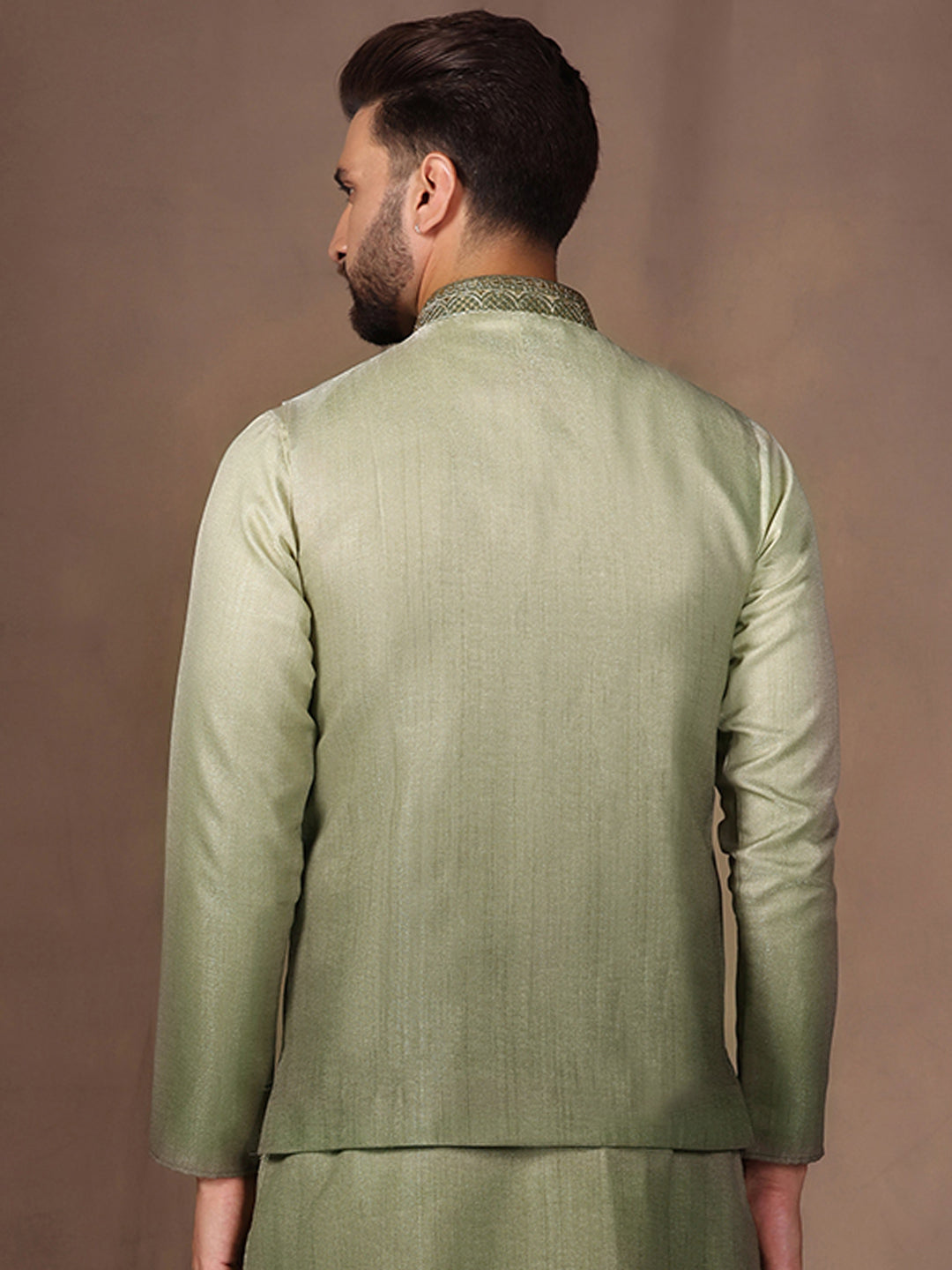 This green silk blend jacket features embroidered details and a regular fit. Perfect for traditional occasions, it adds a touch of elegance to your ethnic wardrobe.