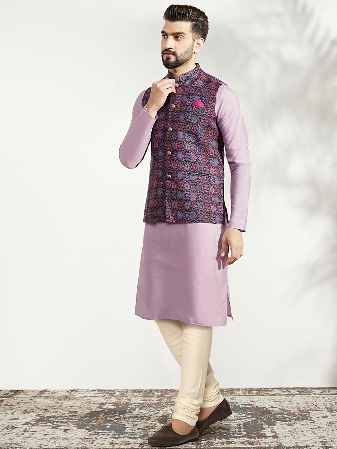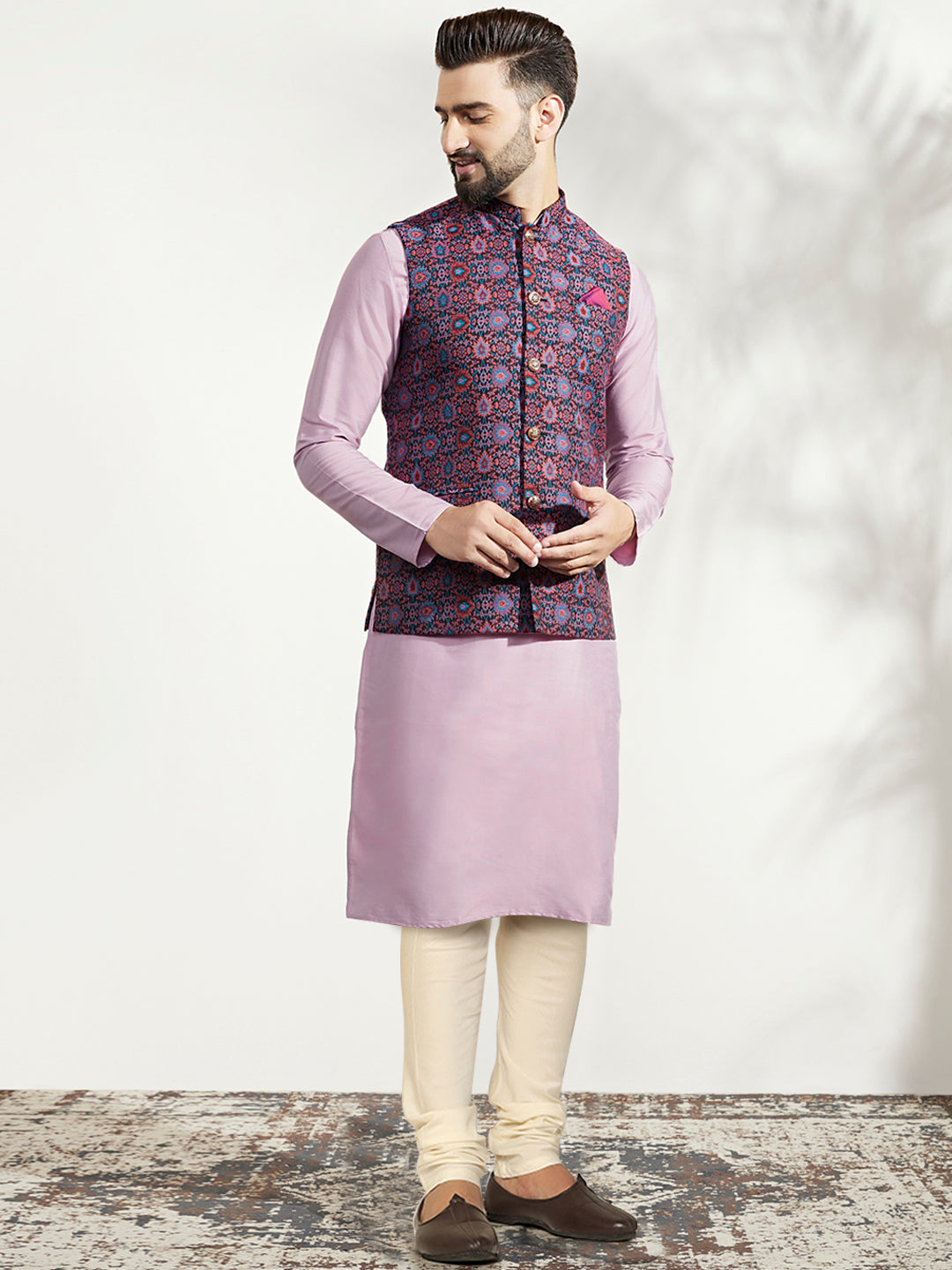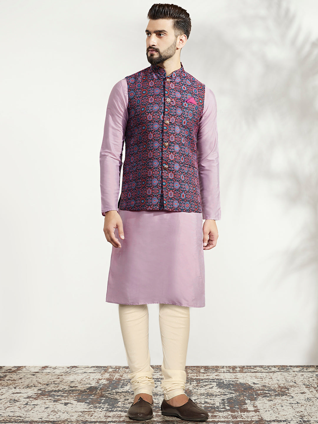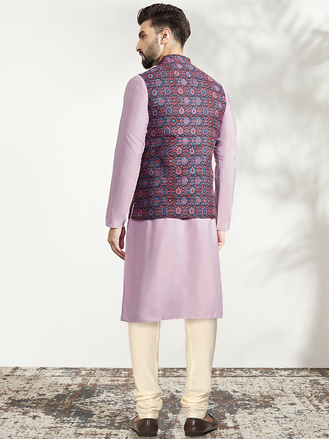Lavender Silk Blend Kurta with Multicolor Printed Nehru Jacket Set