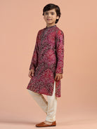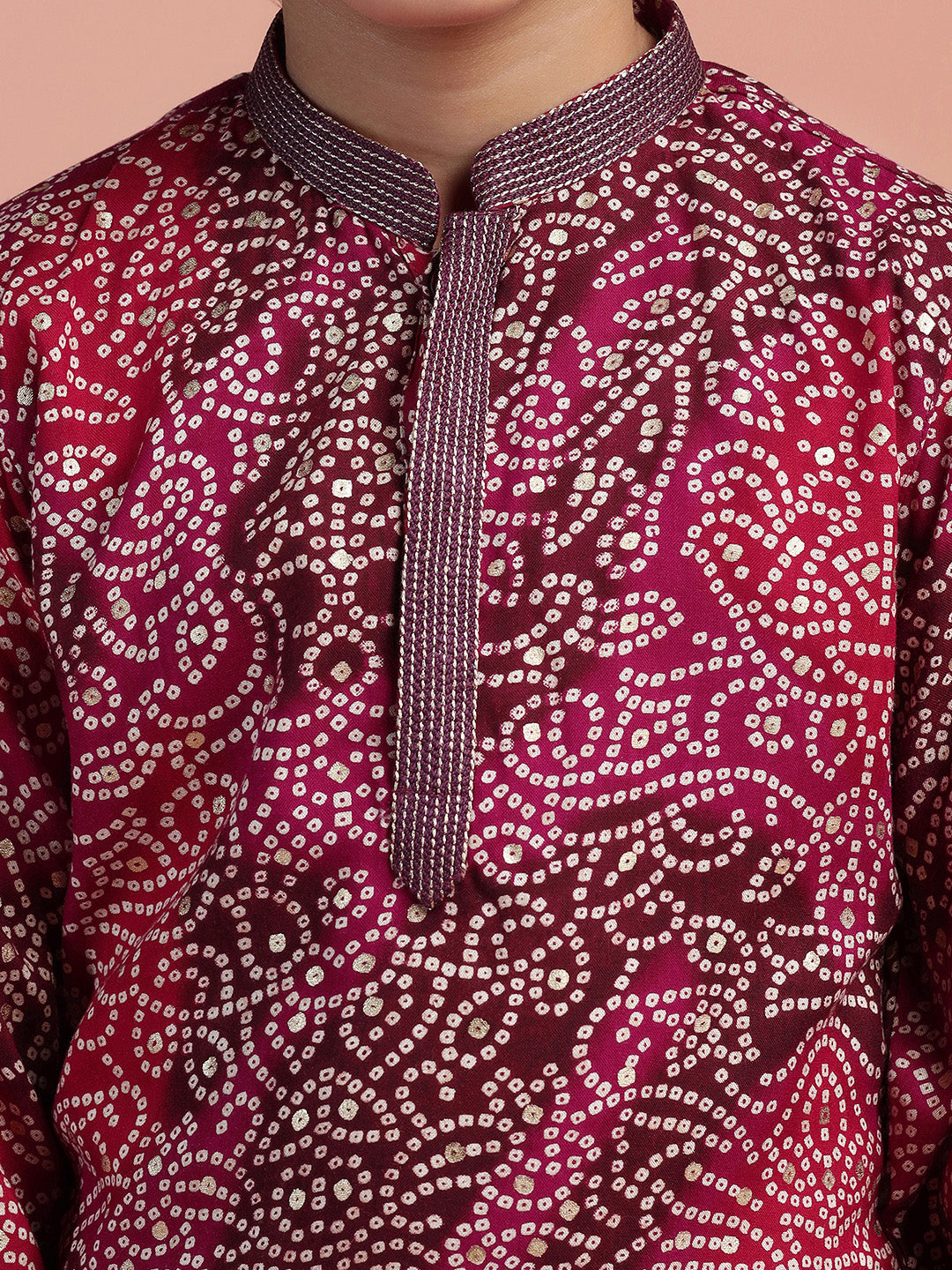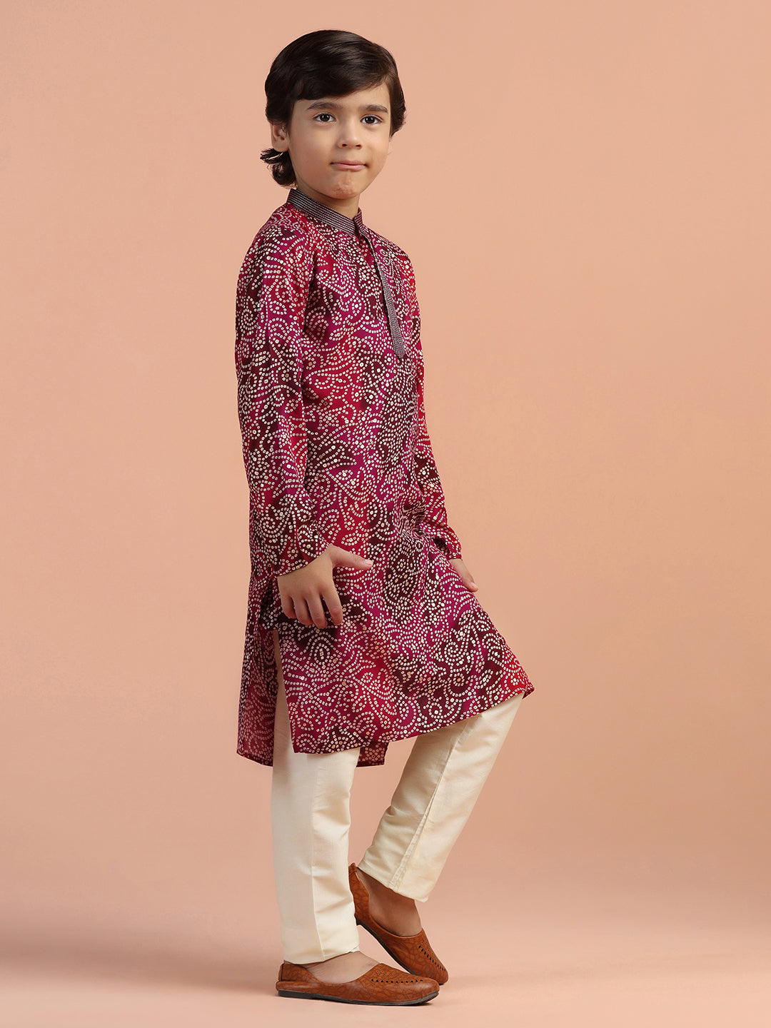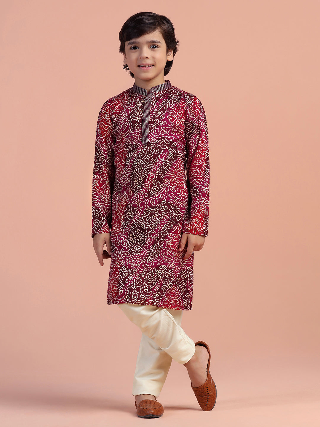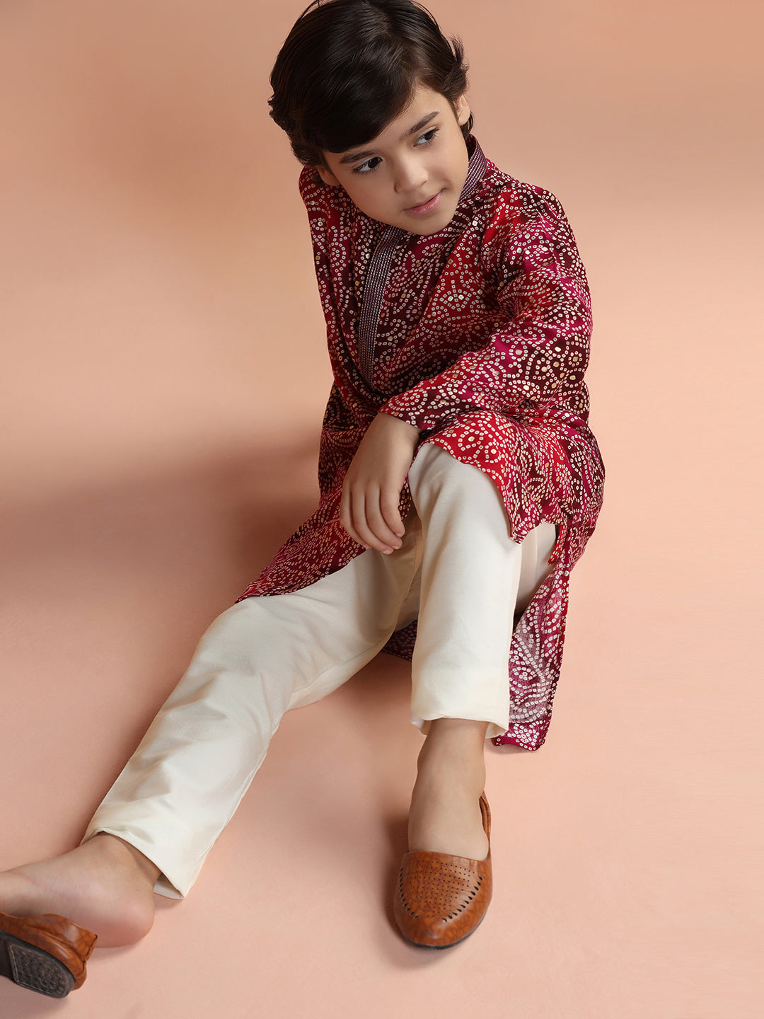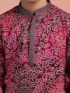 Boys’ maroon Bandhani printed kurta in soft cotton blend – ideal festive outfit for weddings, pujas, and traditional celebrations.