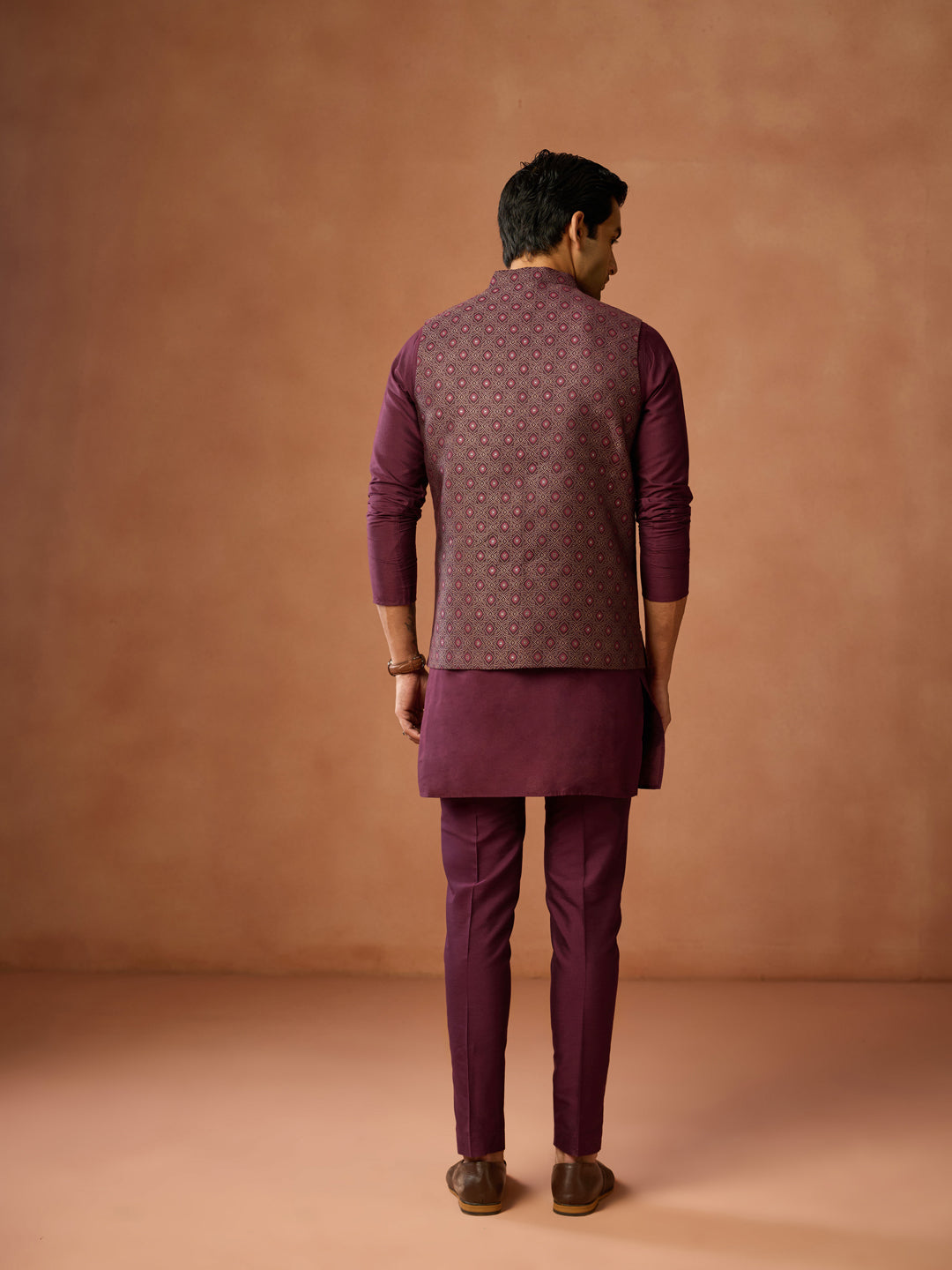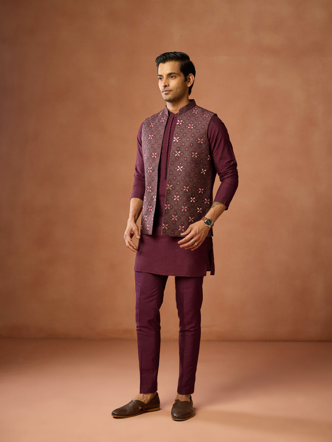 Maroon Poly Silk Jacquard Mid Kurta Front Open Jacket Trouser Set, Perfect festive ethnic wear for men, ideal festive and casual occasions.