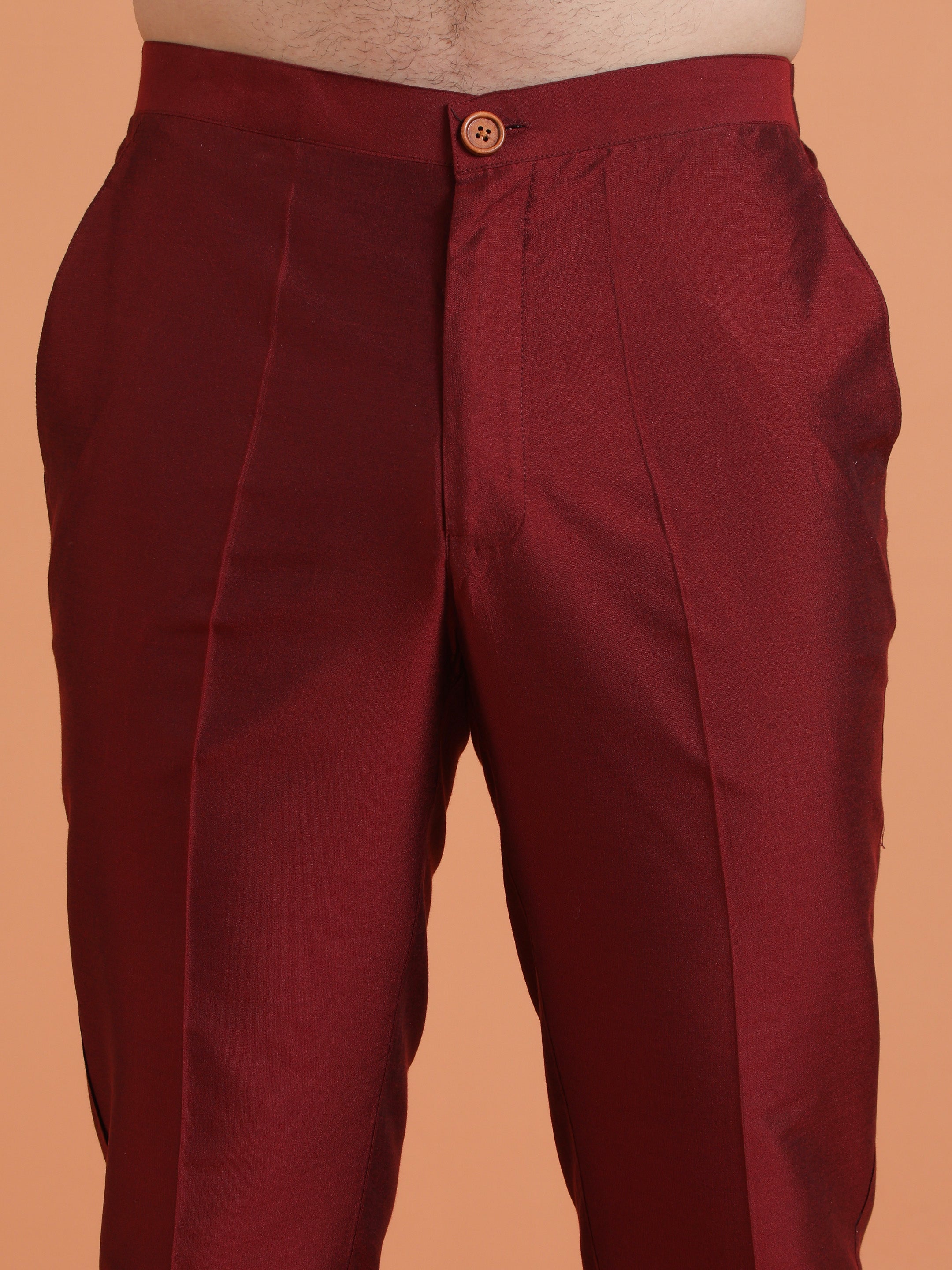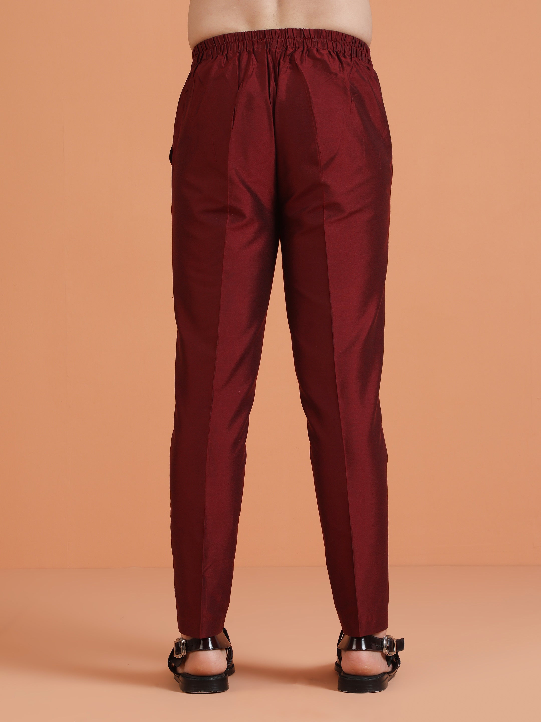 Kisah menss maroon silk blend solid trouser. Ethnic bottomwear designed for weddings and festive occasions. A versatile match for kurtas and jackets.