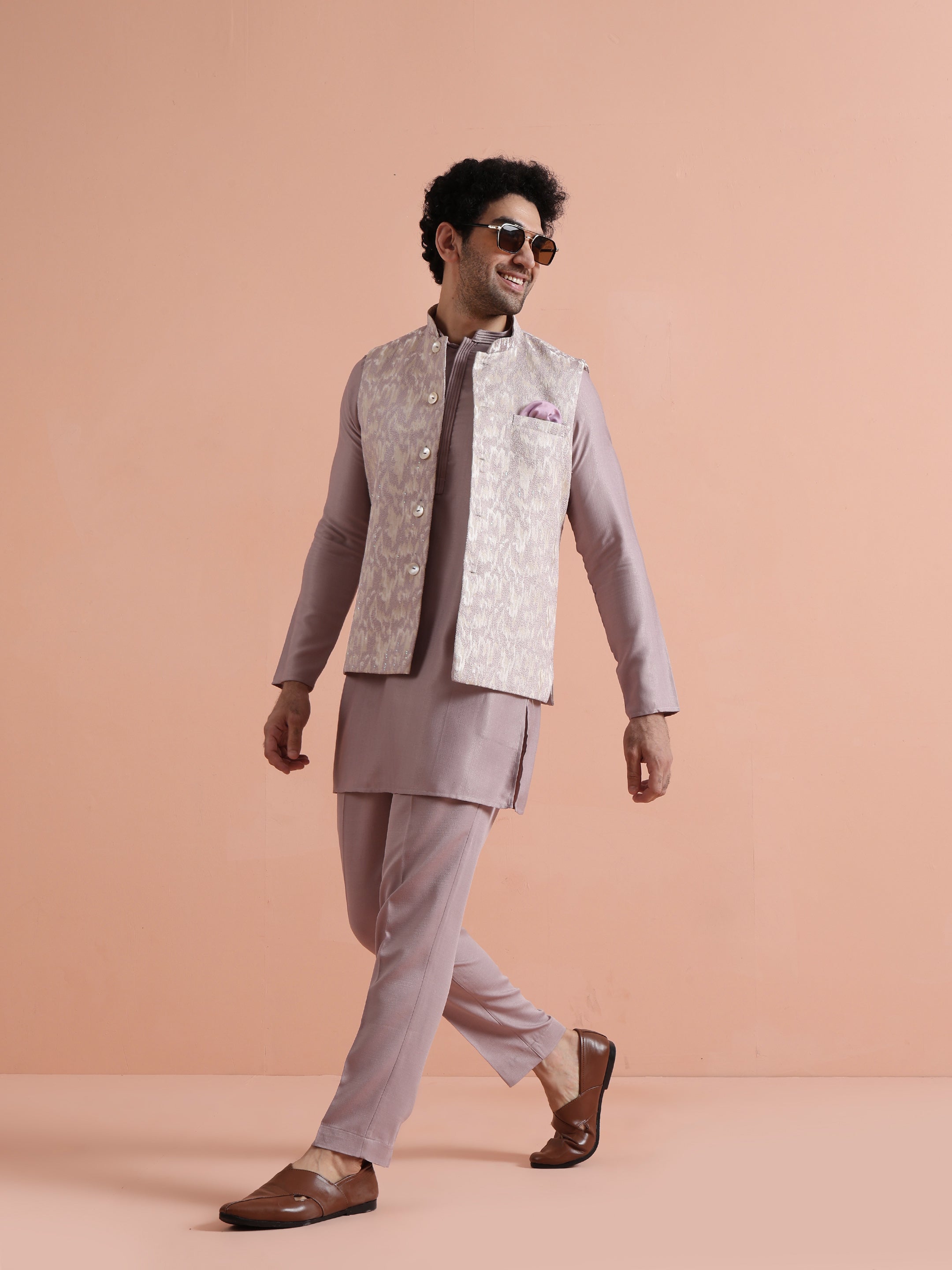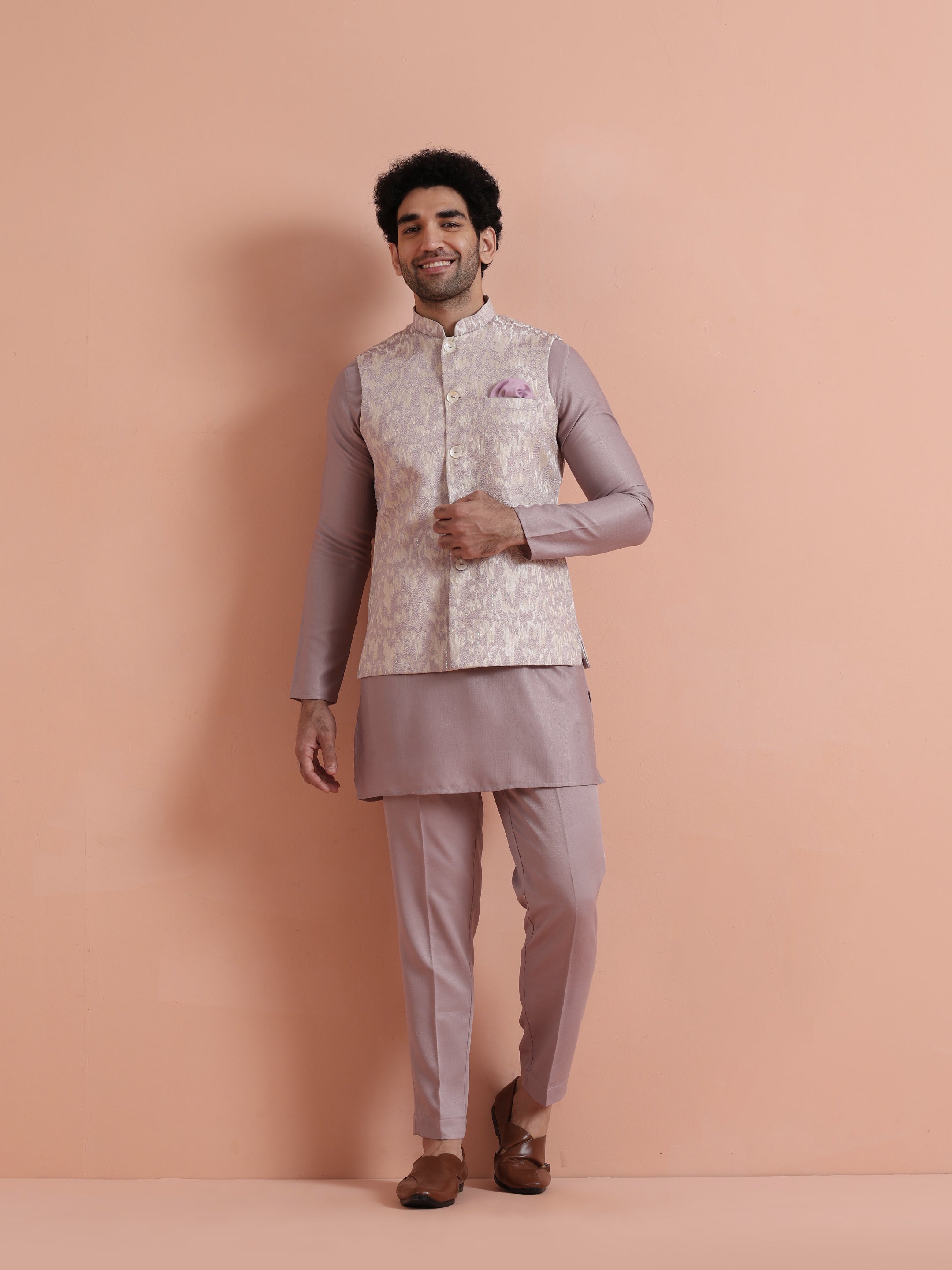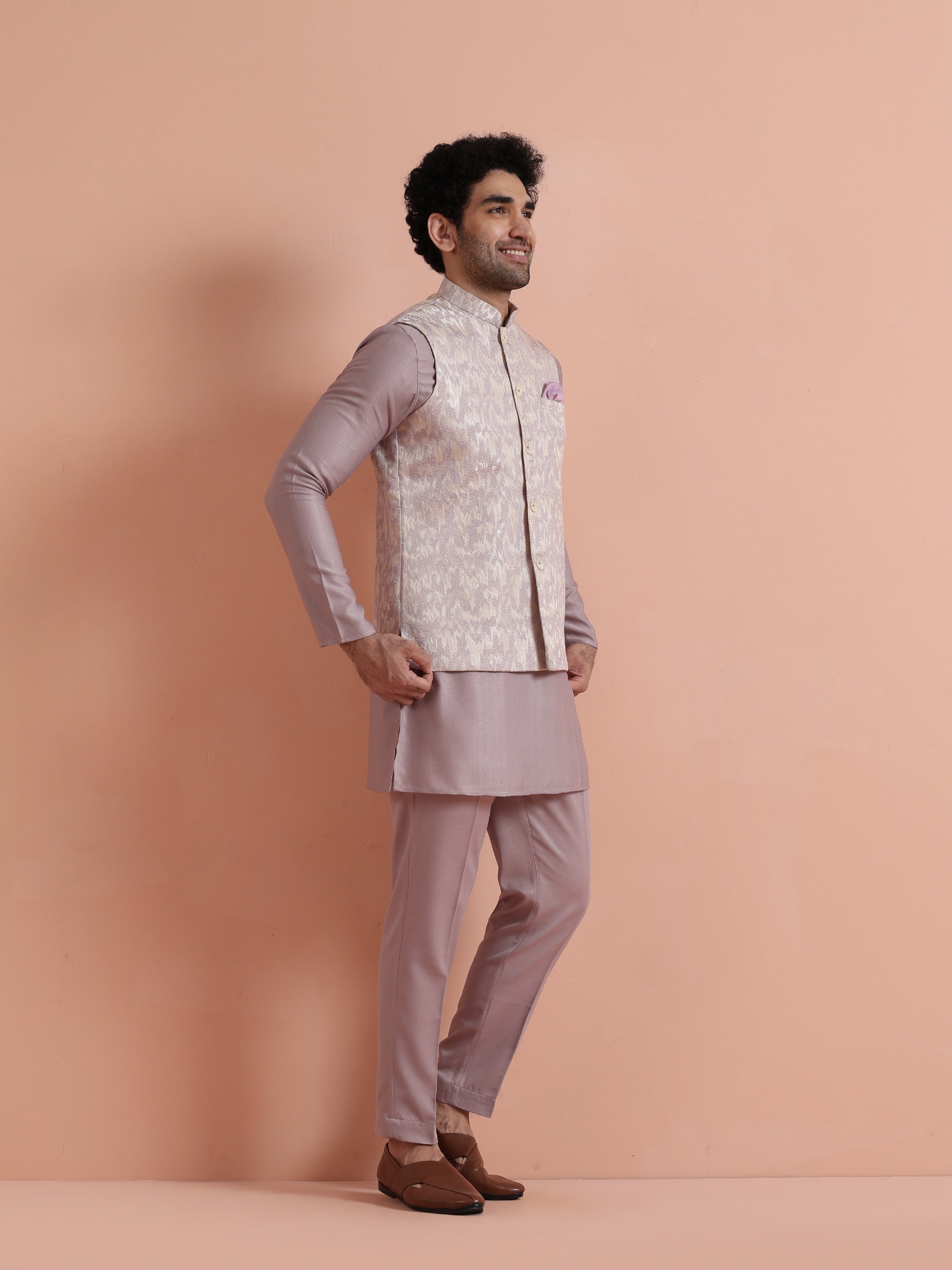 Mauve silk blend kurta with woven textured Nehru jacket and matching trouser stylish pastel kurta jacket set perfect for festive and wedding occasions.