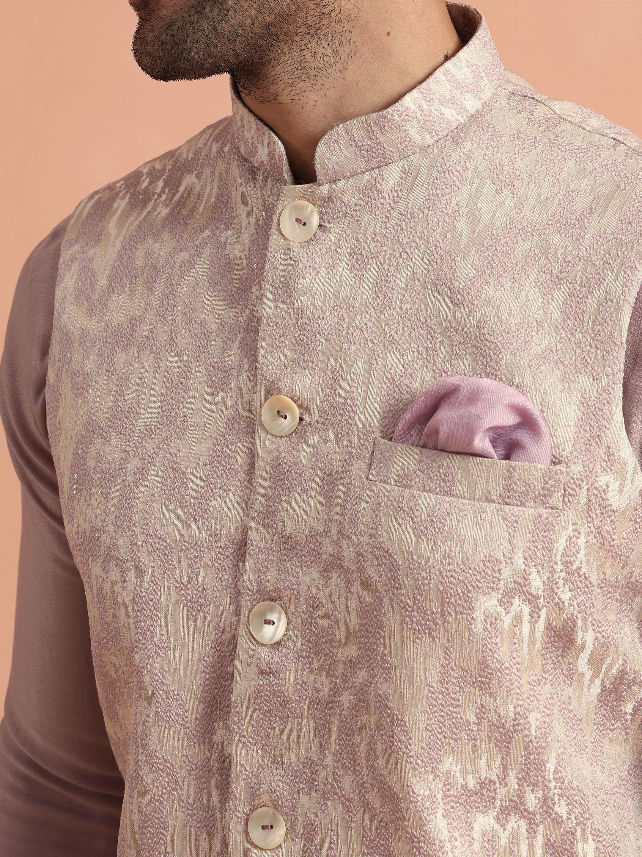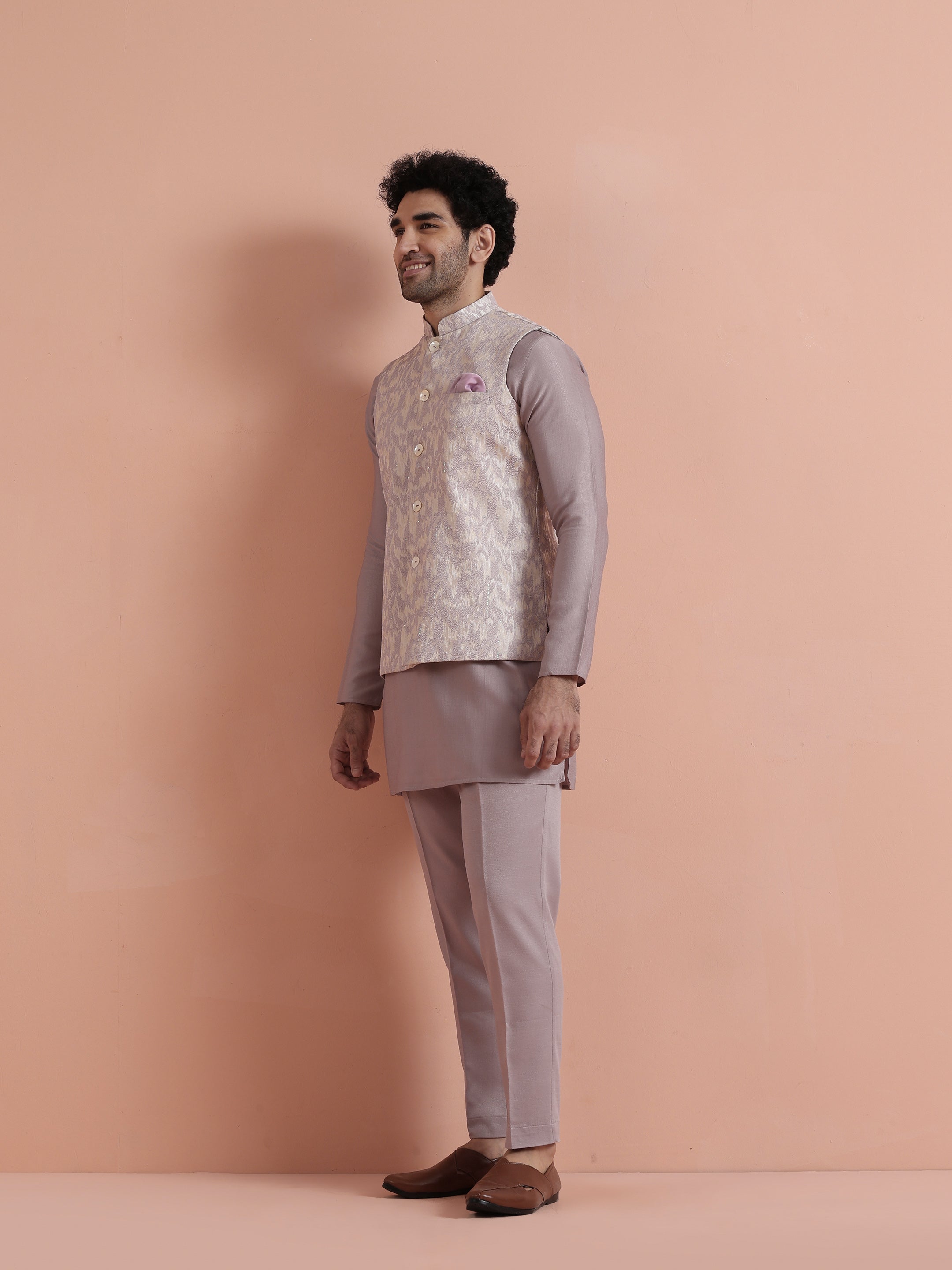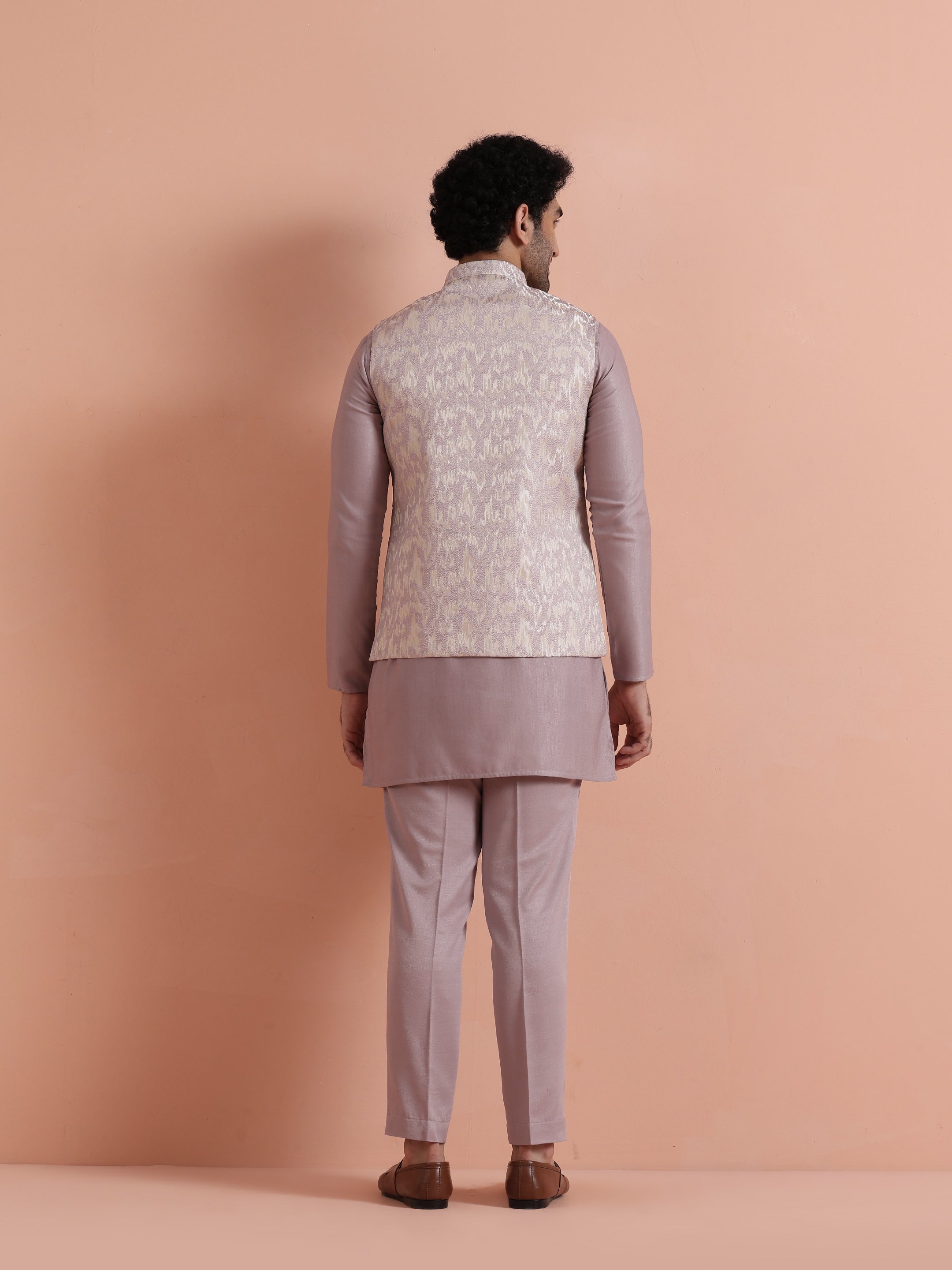 Mauve silk blend kurta with woven textured Nehru jacket and matching trouser stylish pastel kurta jacket set perfect for festive and wedding occasions.