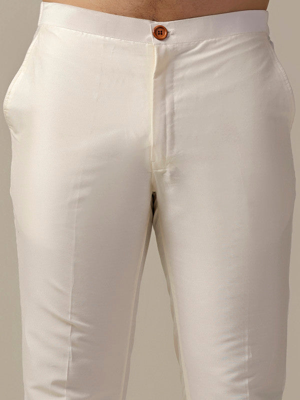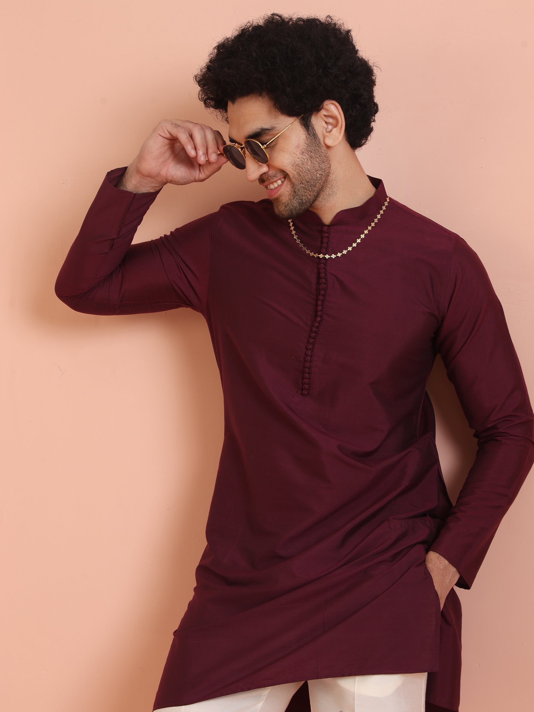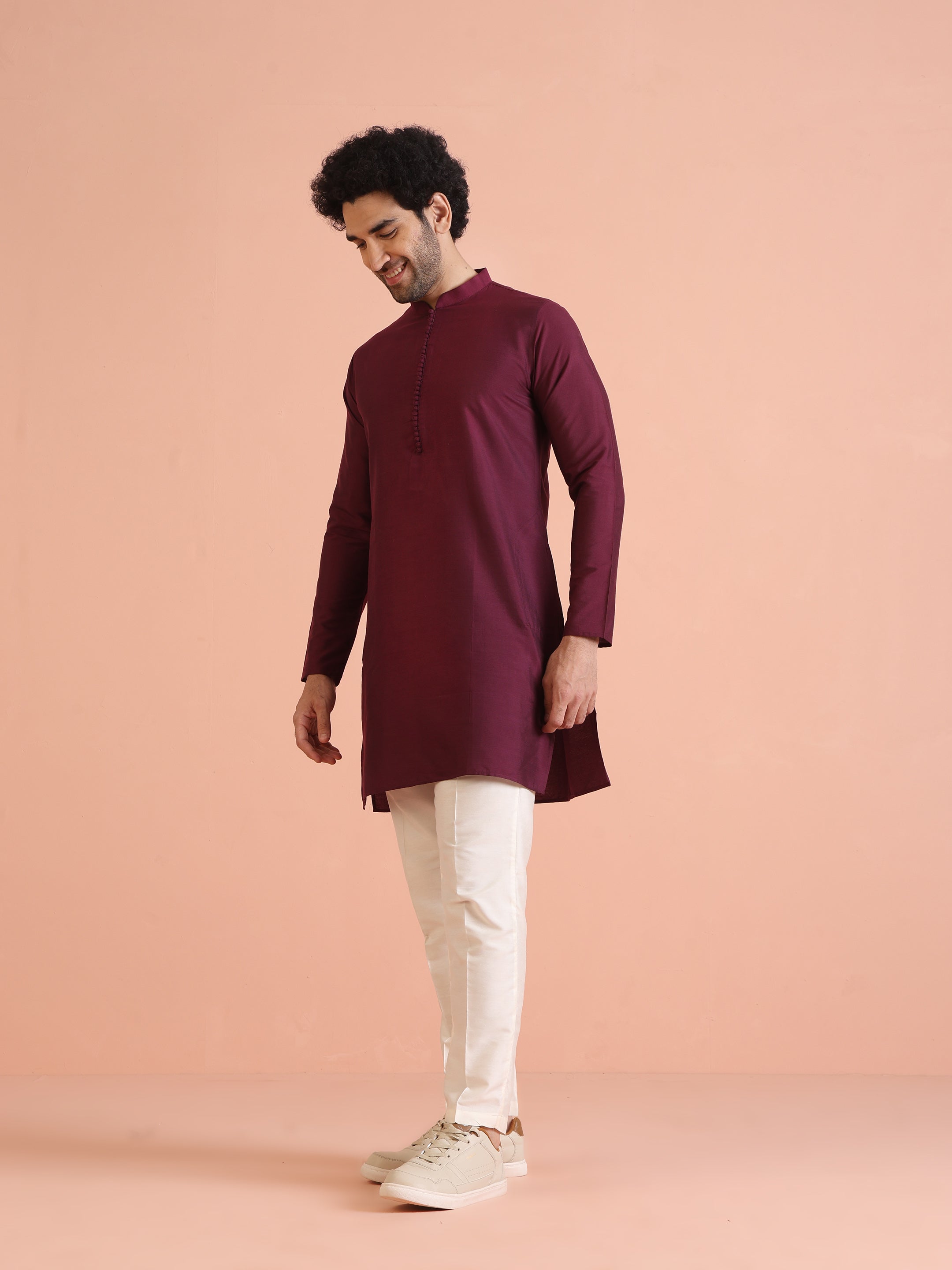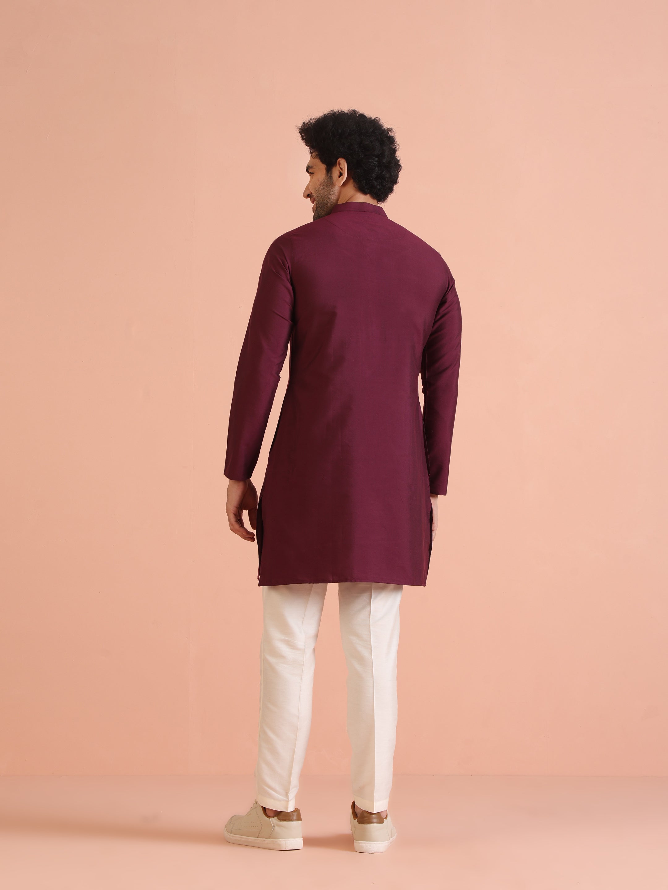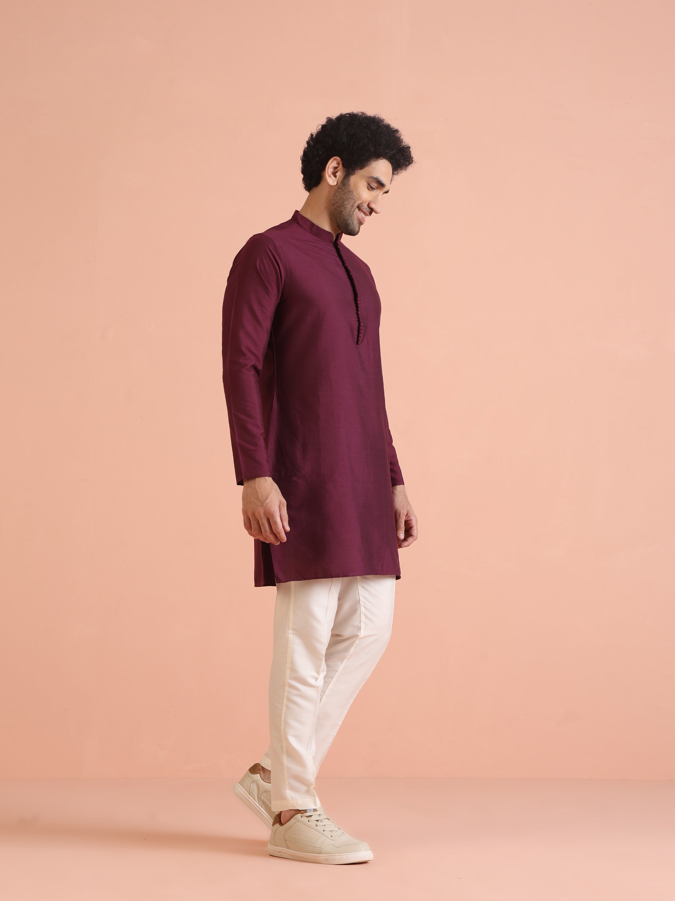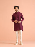 legant maroon solid kurta with cream trouser set. Perfect festive wear outfit with Mandarin collar design, crafted in comfortable cotton blend for style and comfort.