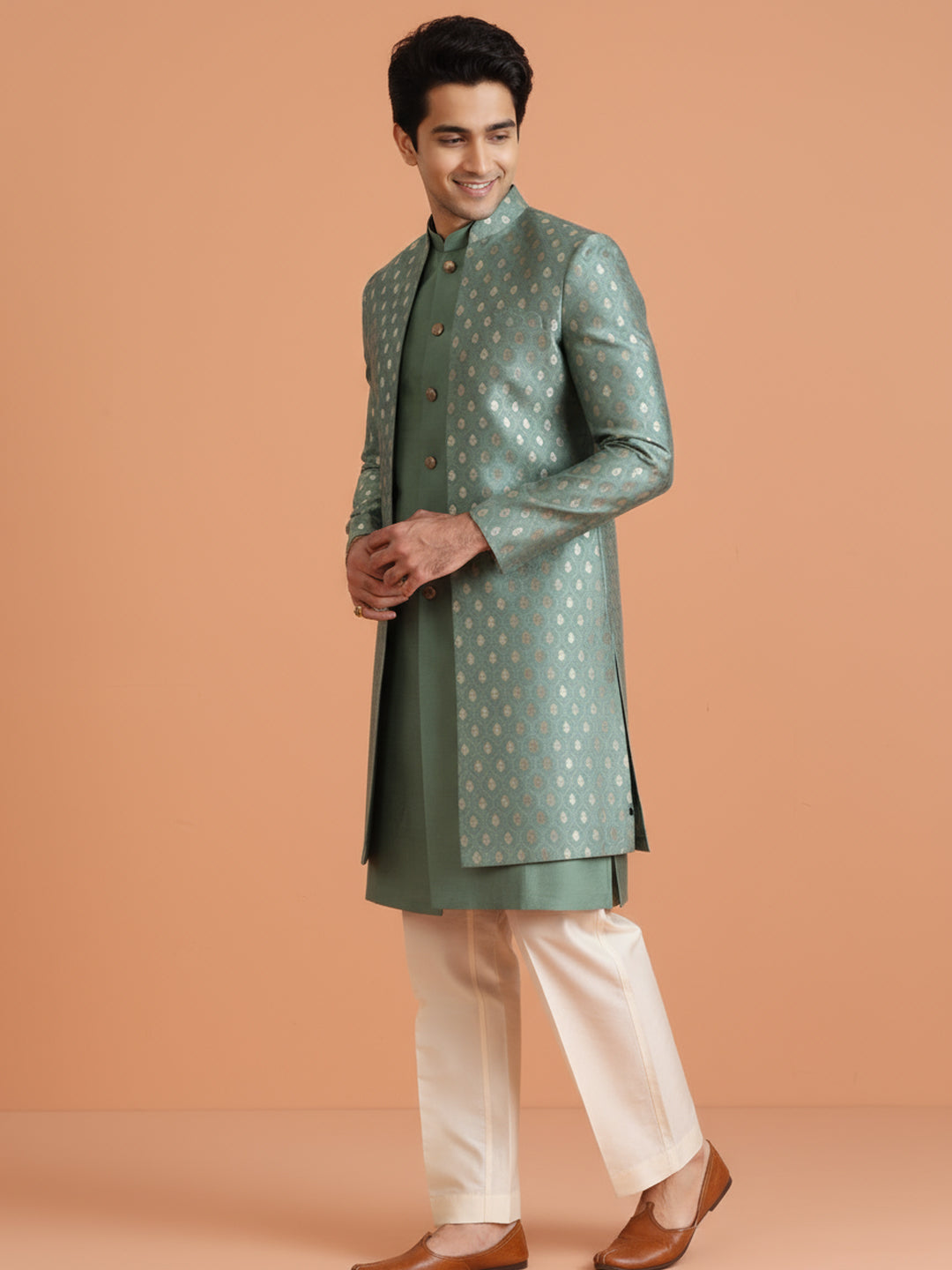 Mint green brocade front-open sherwani with ivory wide-leg trouser — perfect for weddings, engagements, and festive celebrations.