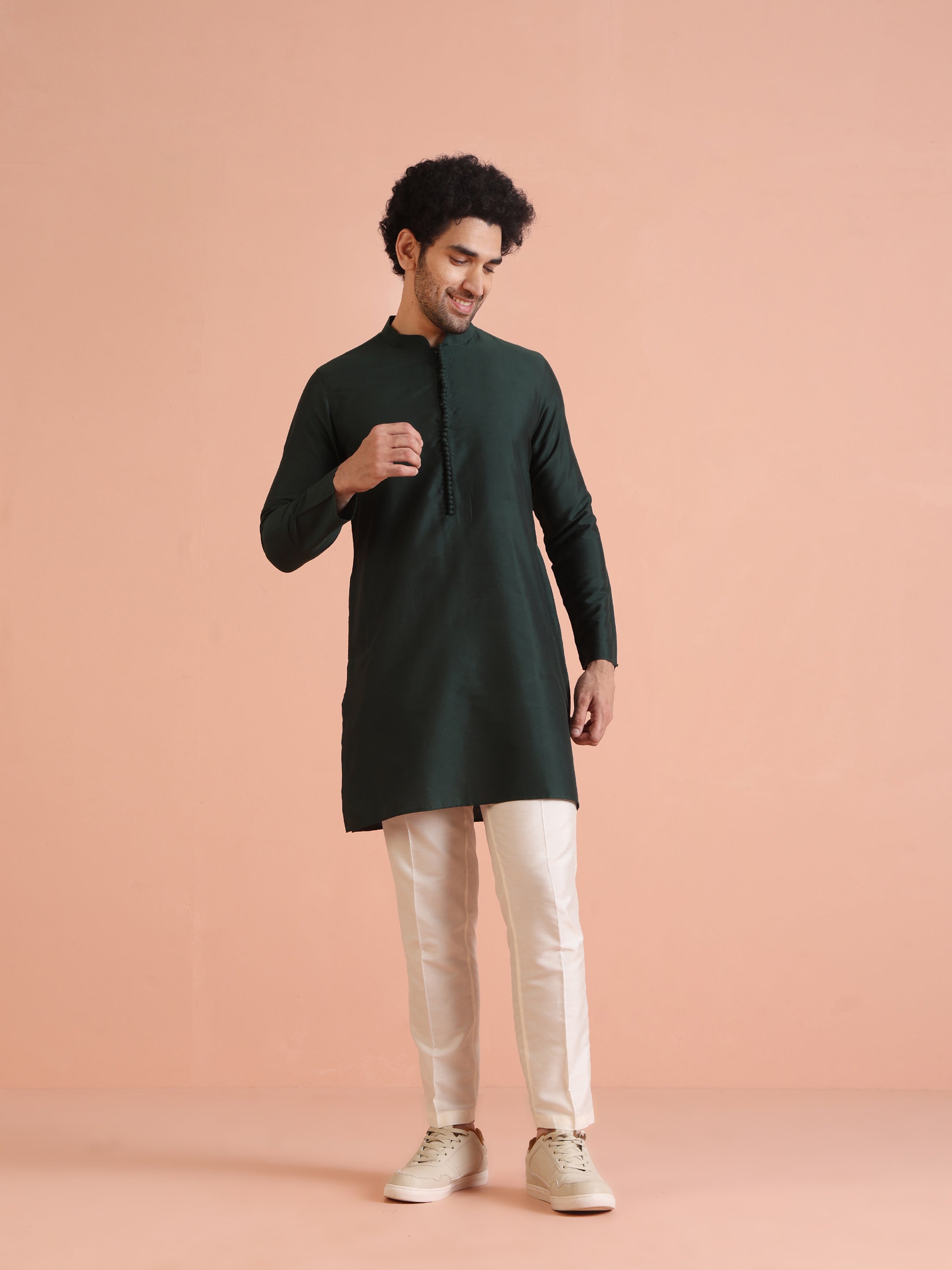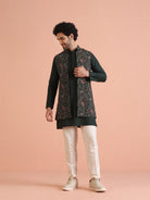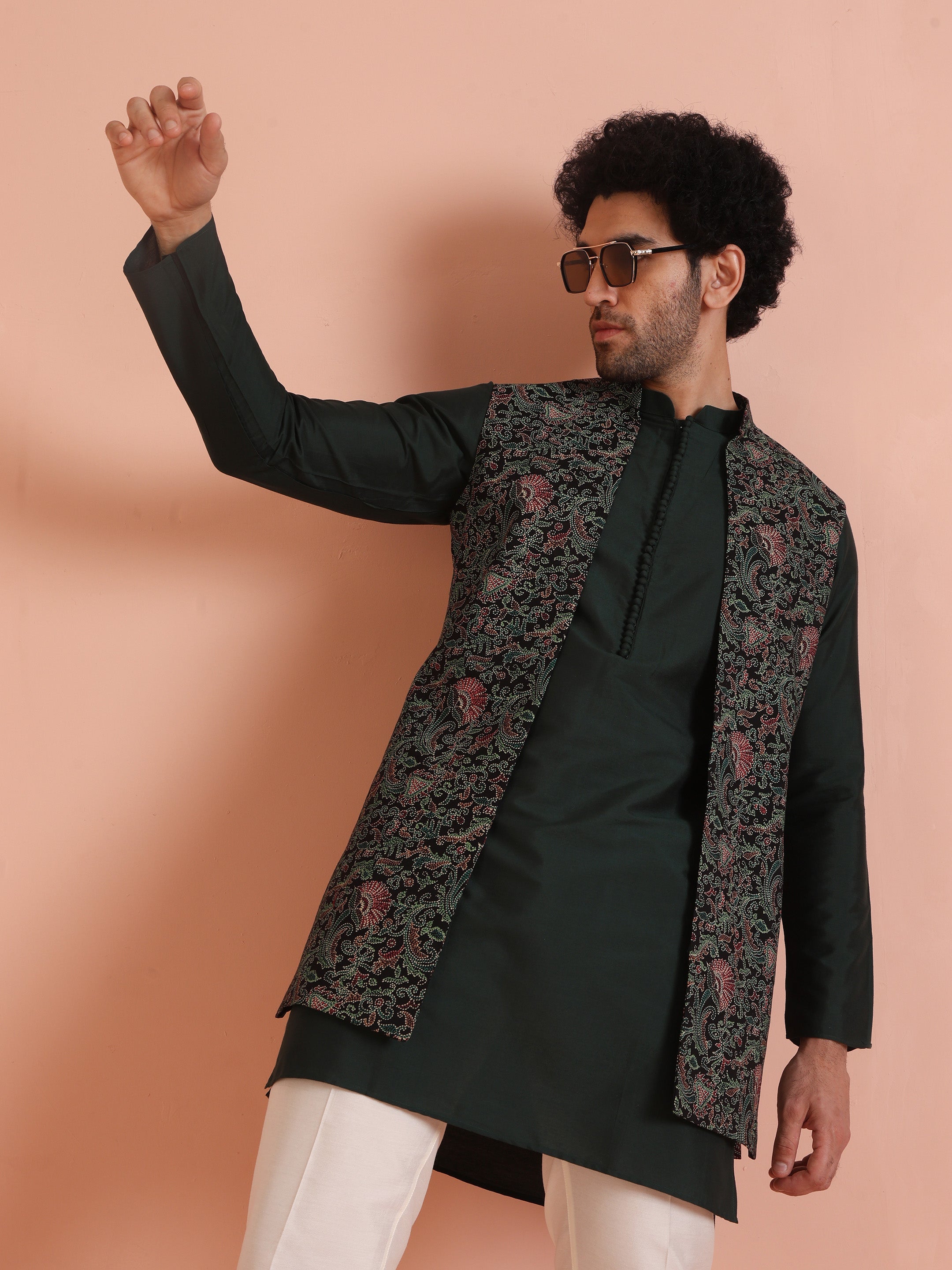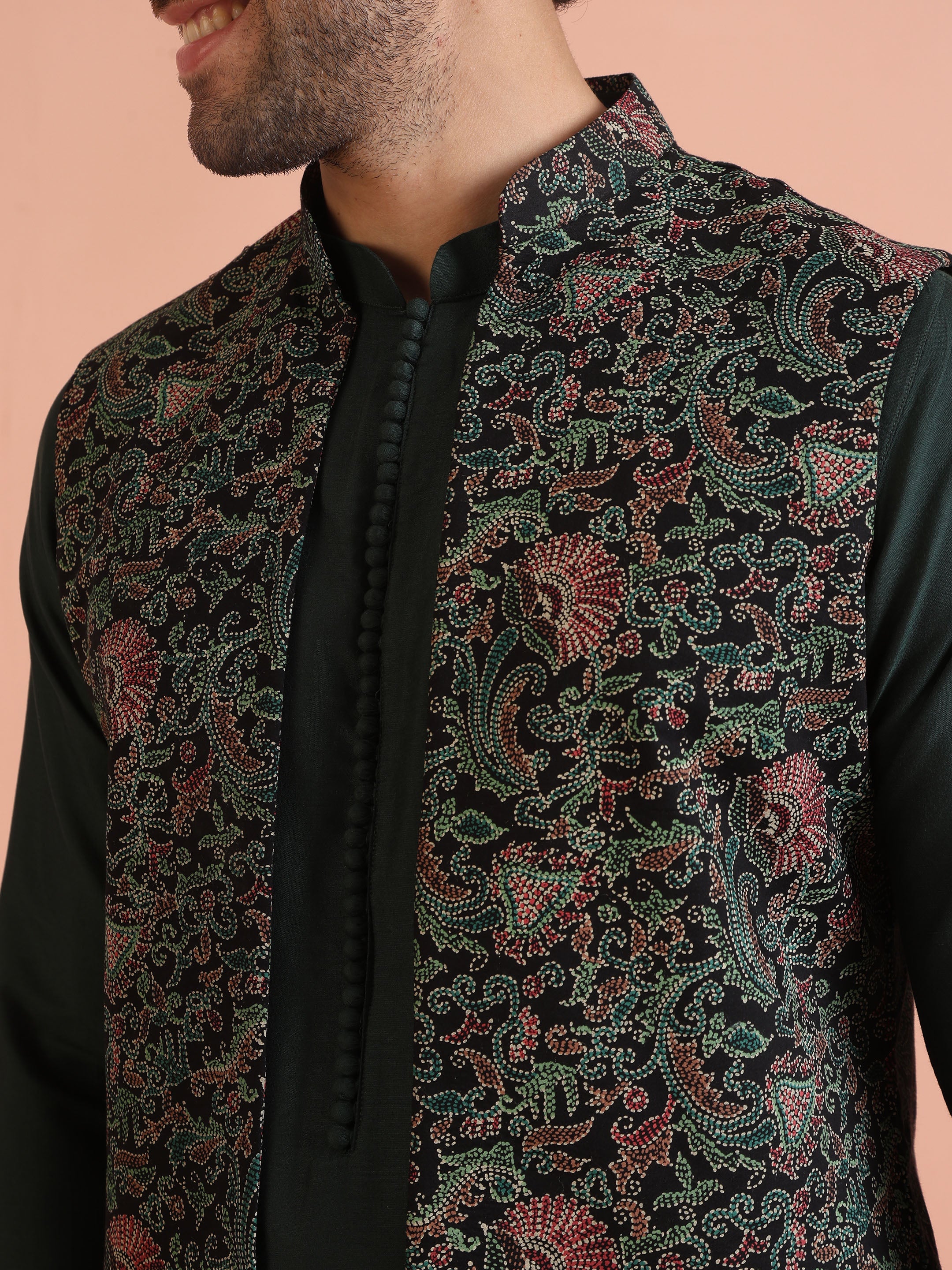 Multicolor printed Nehru jacket set with green kurta & cream trousers. Trendy ethnic wear for weddings, sangeet, and festive occasions.