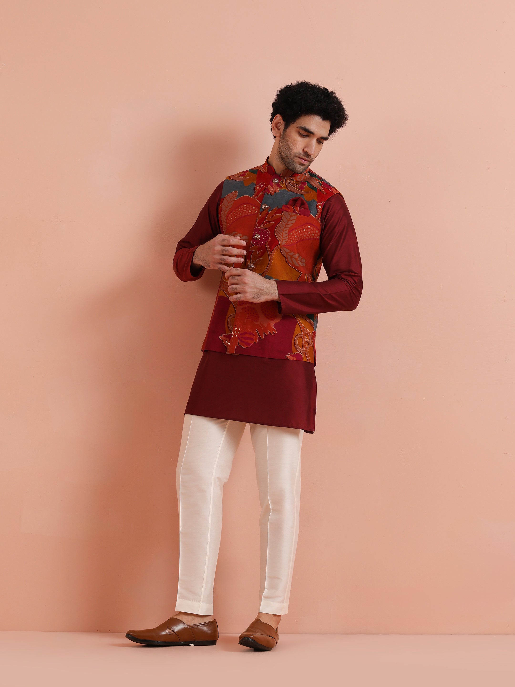 Kisah Menss Multicolor Printed Nehru Jacket bold and vibrant statement piece. Perfect for weddings, receptions, and festive gatherings when paired with kurtas or trousers.