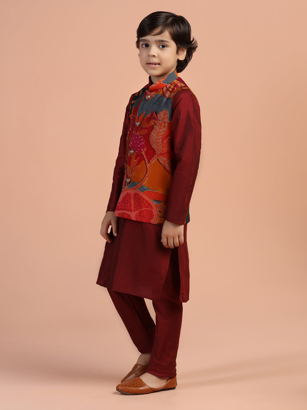 Multicolor printed art silk Nehru jacket for boys – perfect festive layering piece by Kisah Kids.