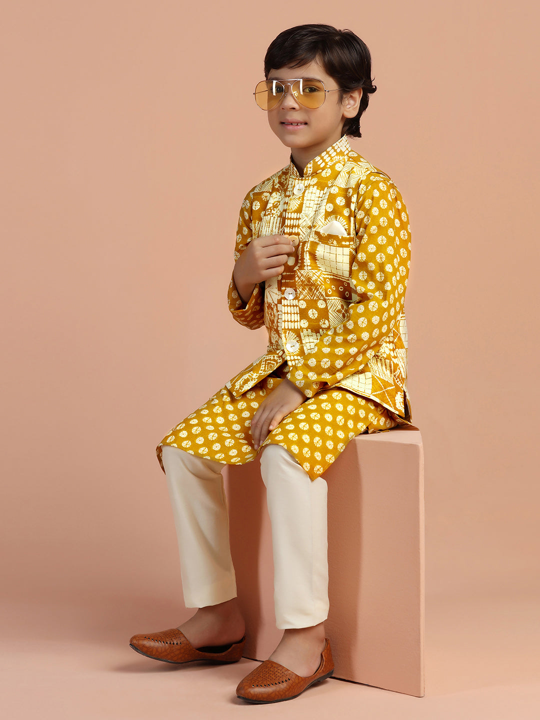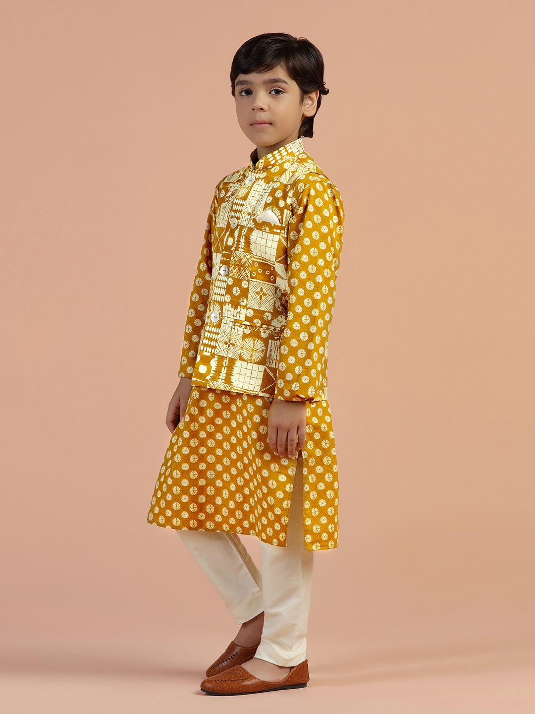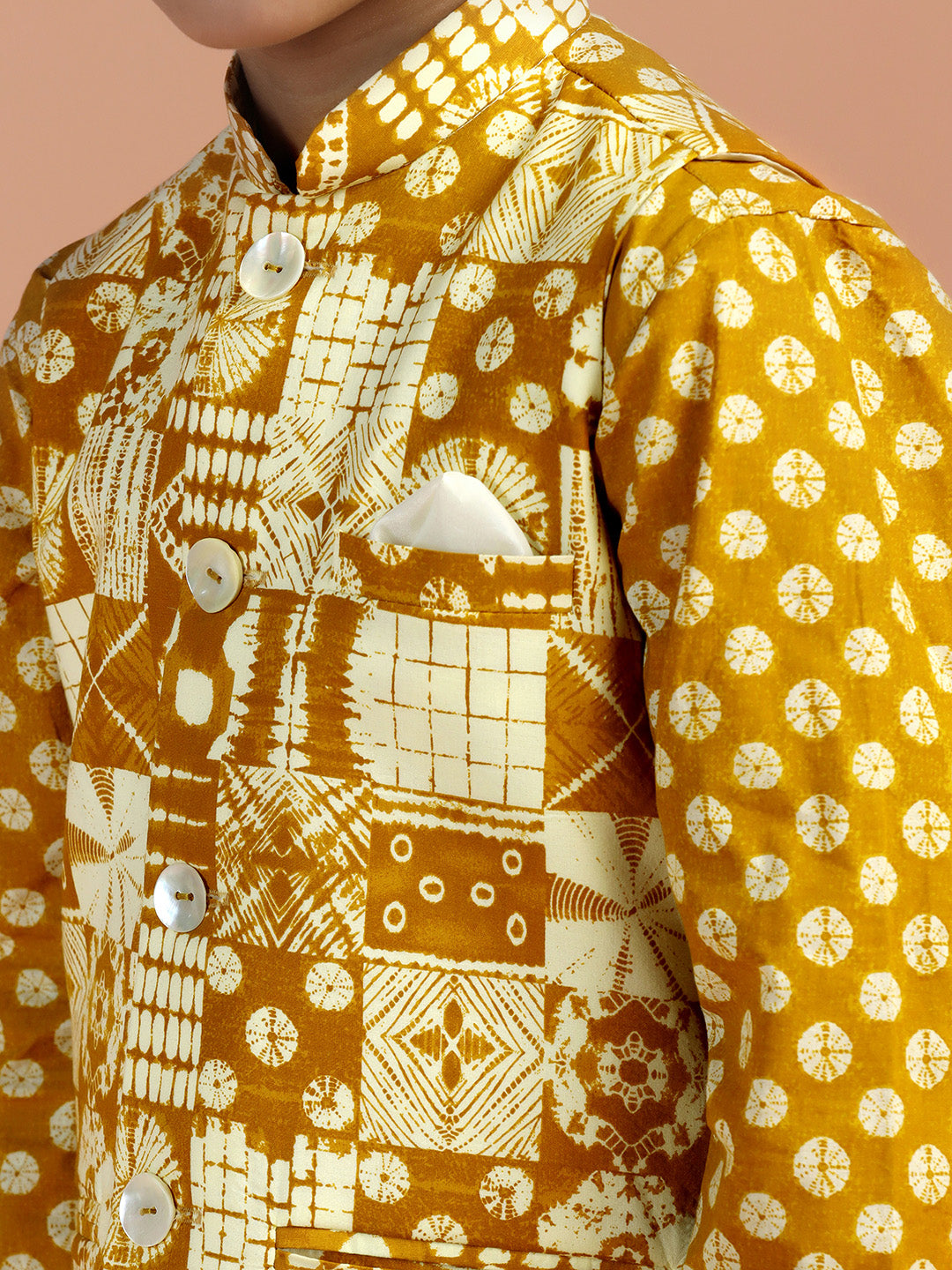 Mustard yellow geometric printed cotton blend Nehru jacket for boys – festive and stylish Kisah Kidswear.