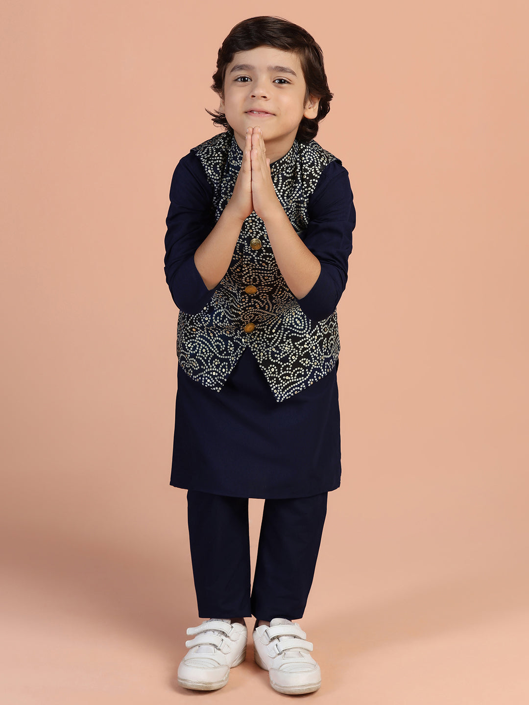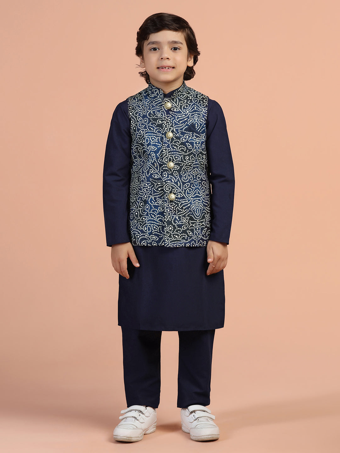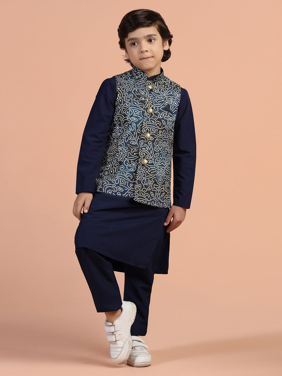 Navy blue cotton-blend Bandhani printed jacket for boys – stylish festive Nehru jacket by Kisah Kids.
