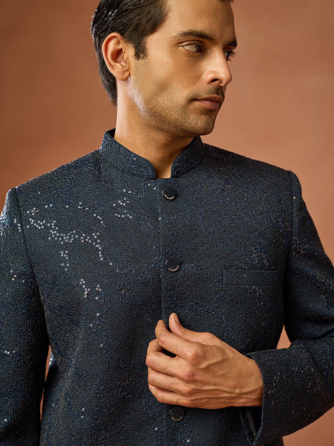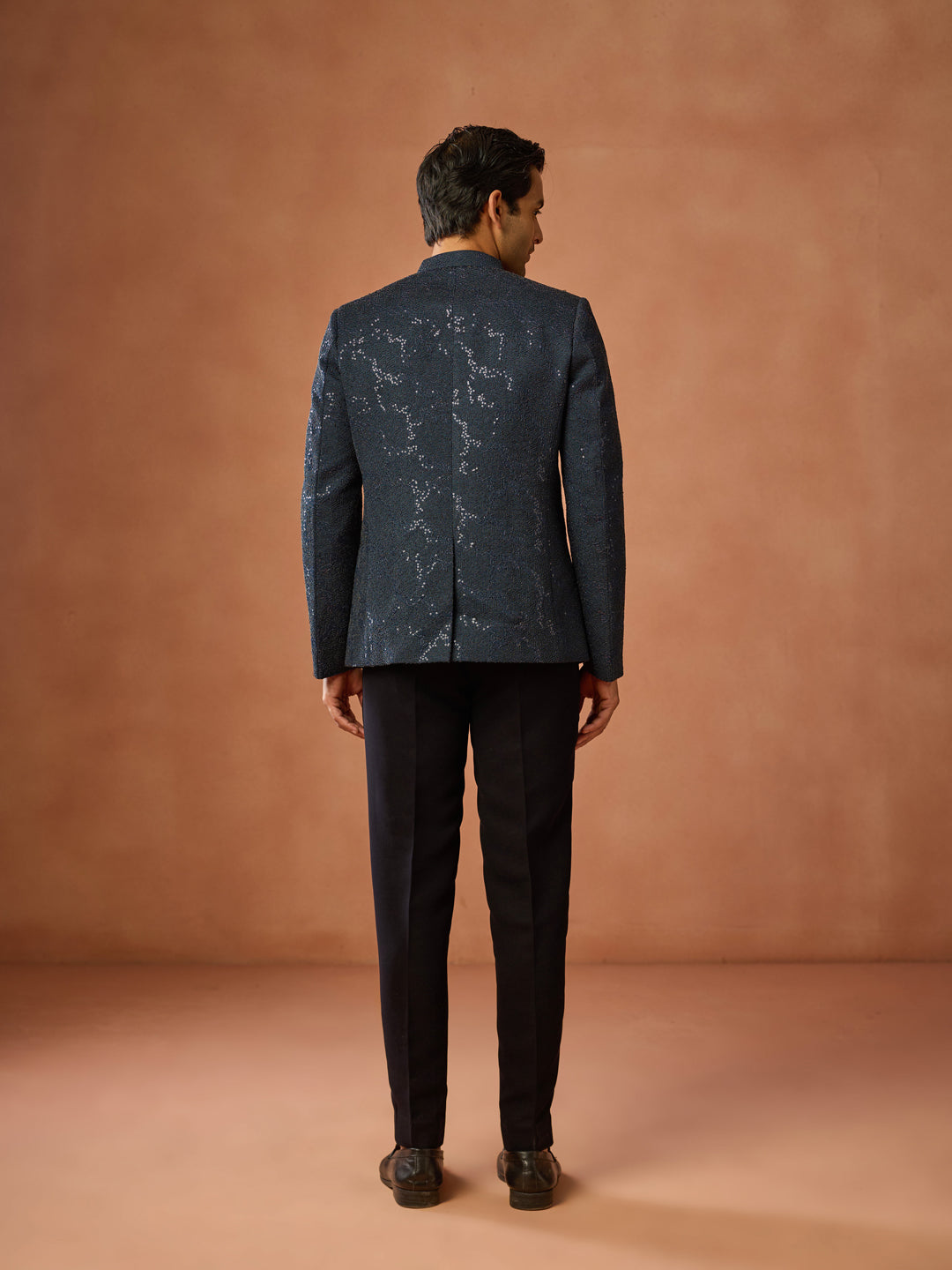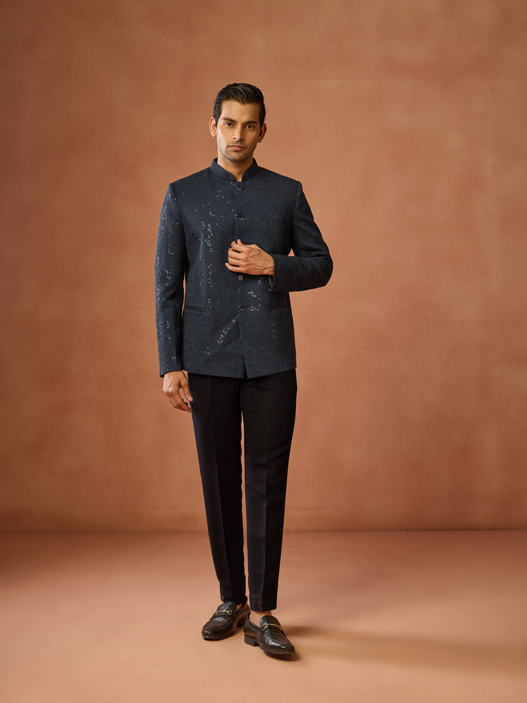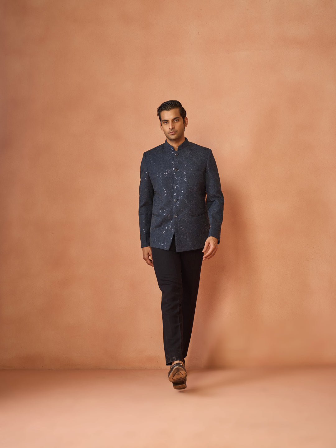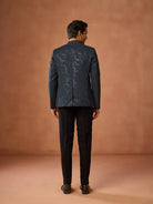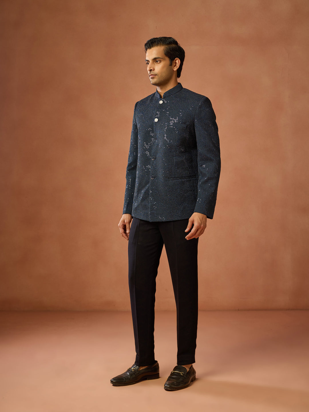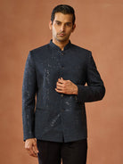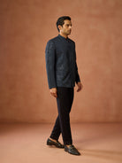 Navy Blue Sequinned Textured Bandhgala Jodhpuri