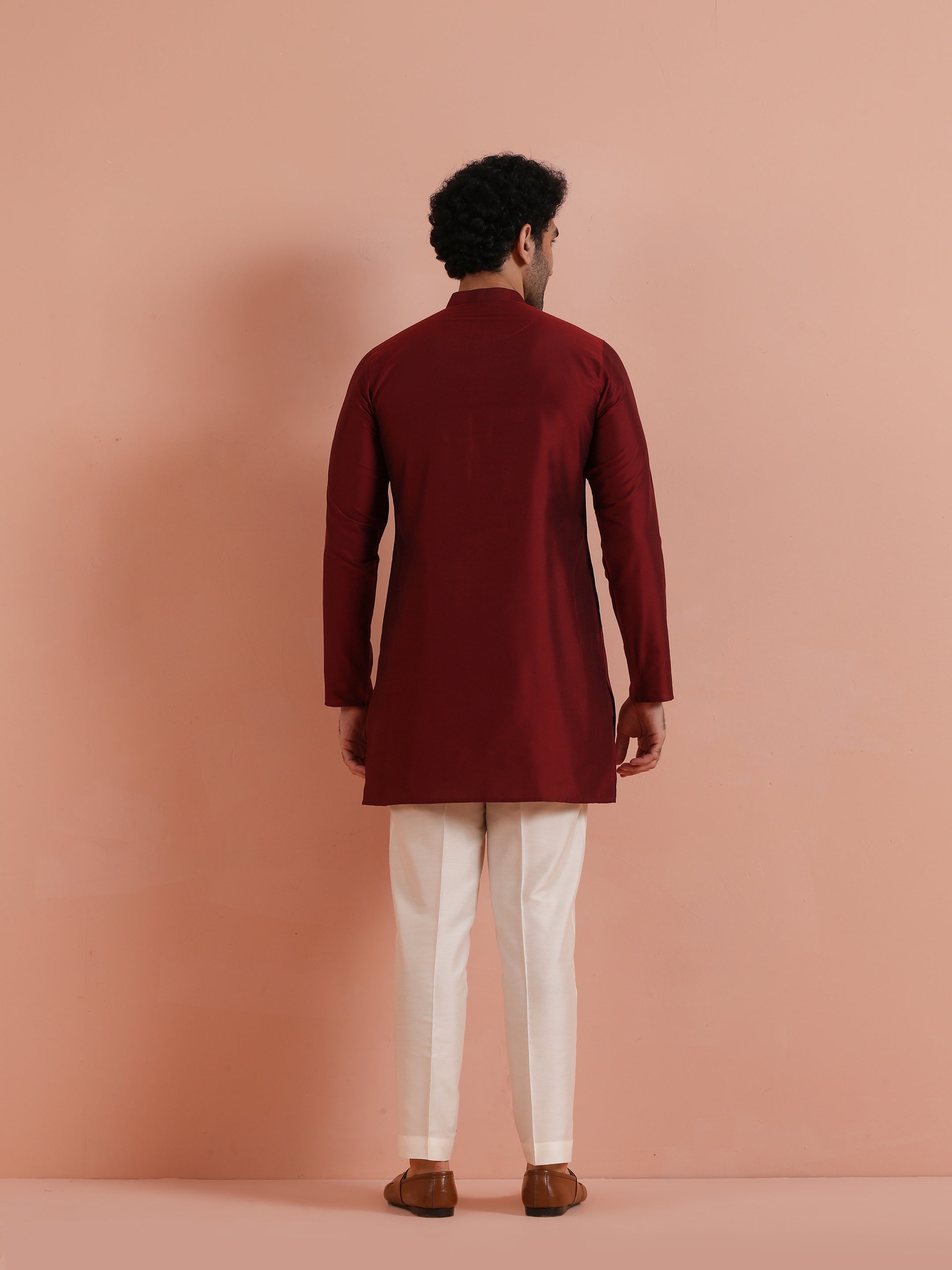 Kisah Menss Maroon Mid Kurta timeless festive wear with a subtle sheen. Ideal for weddings, festive parties, and cultural celebrations.
