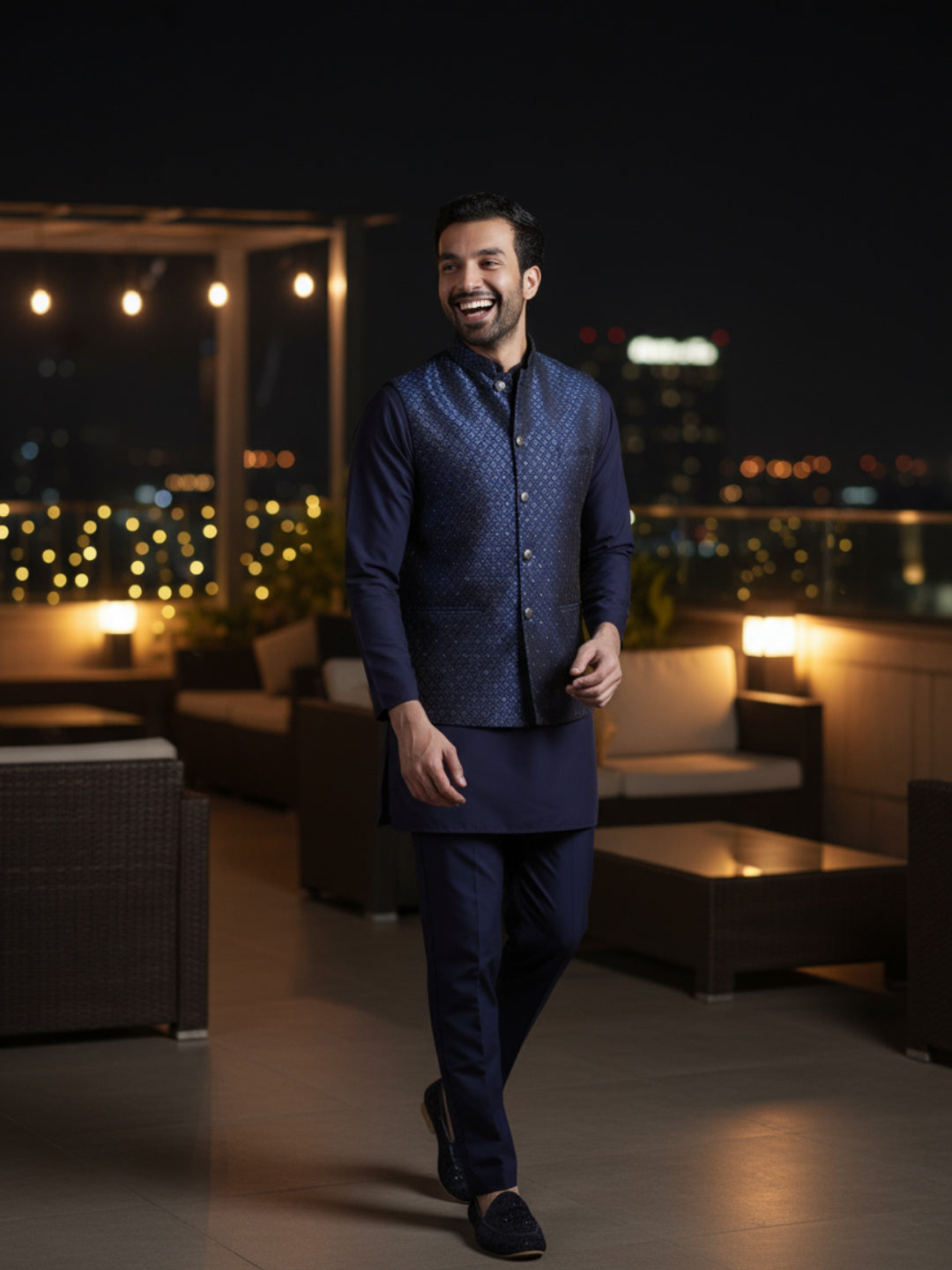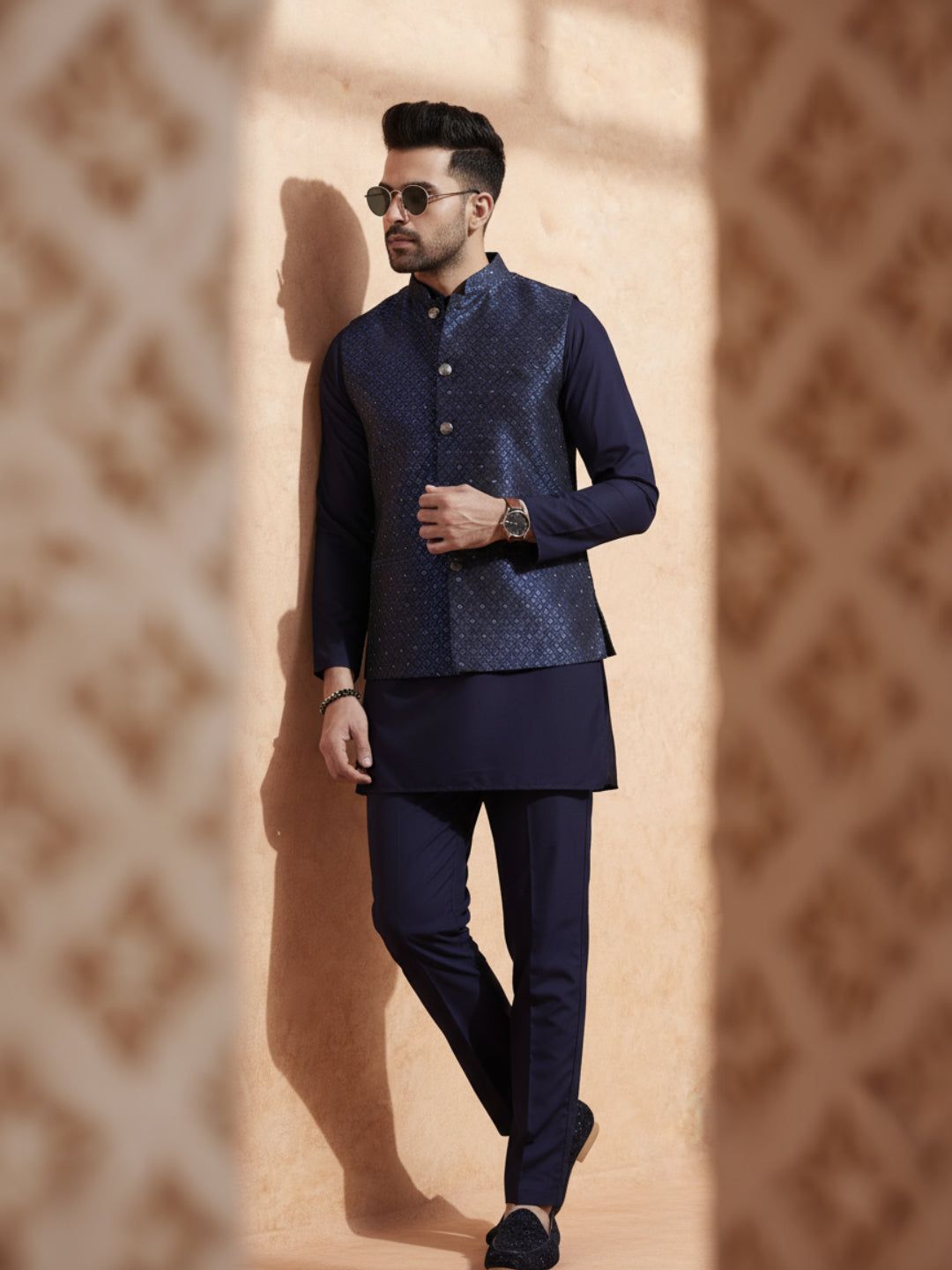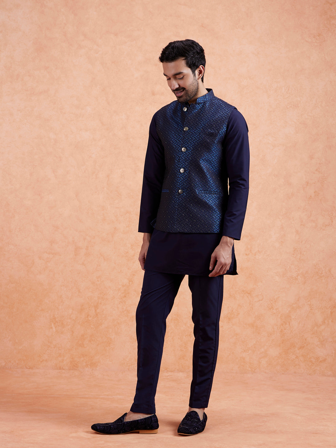 Turquoise Silk Blend Jacquard Mid Kurta Jacket Trouser Set, Perfect festive ethnic wear for men, ideal festive and casual occasions.