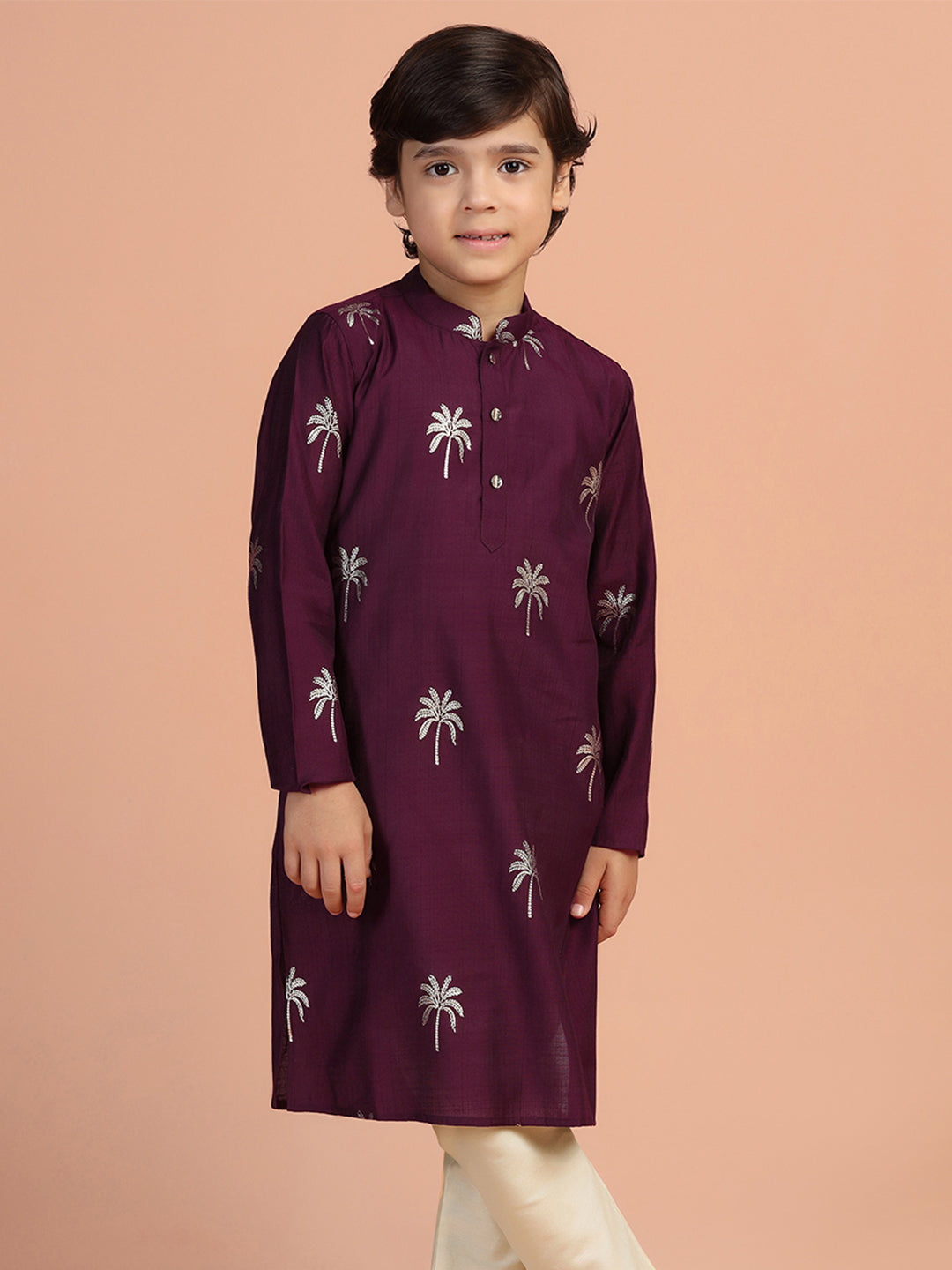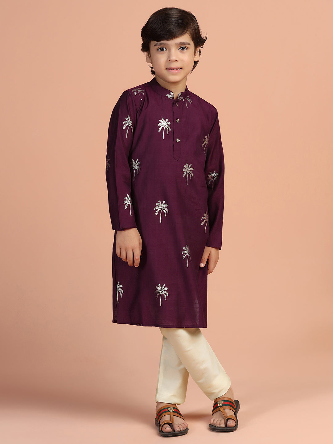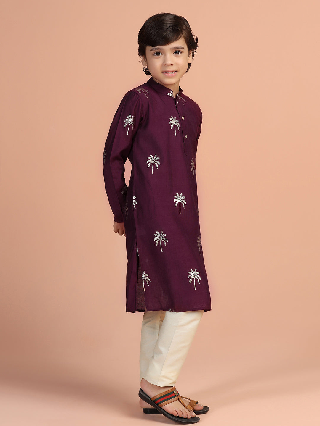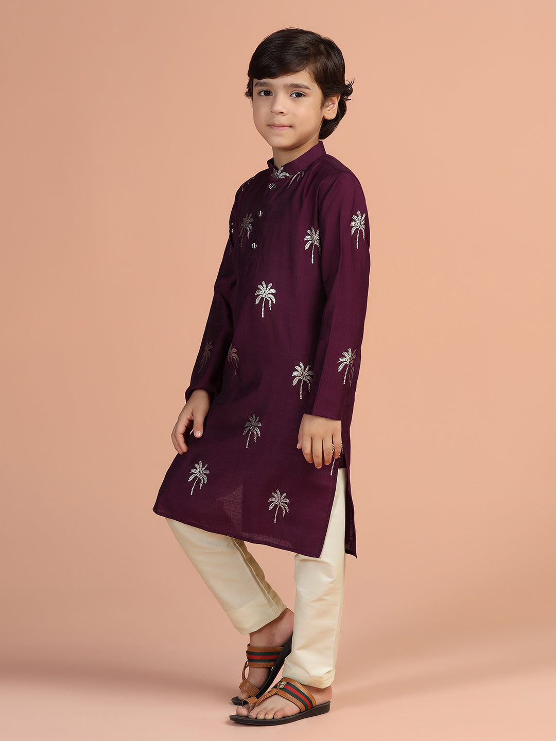 Wine palm print cotton blend kurta for boys – stylish festive wear from Kisah Kids.