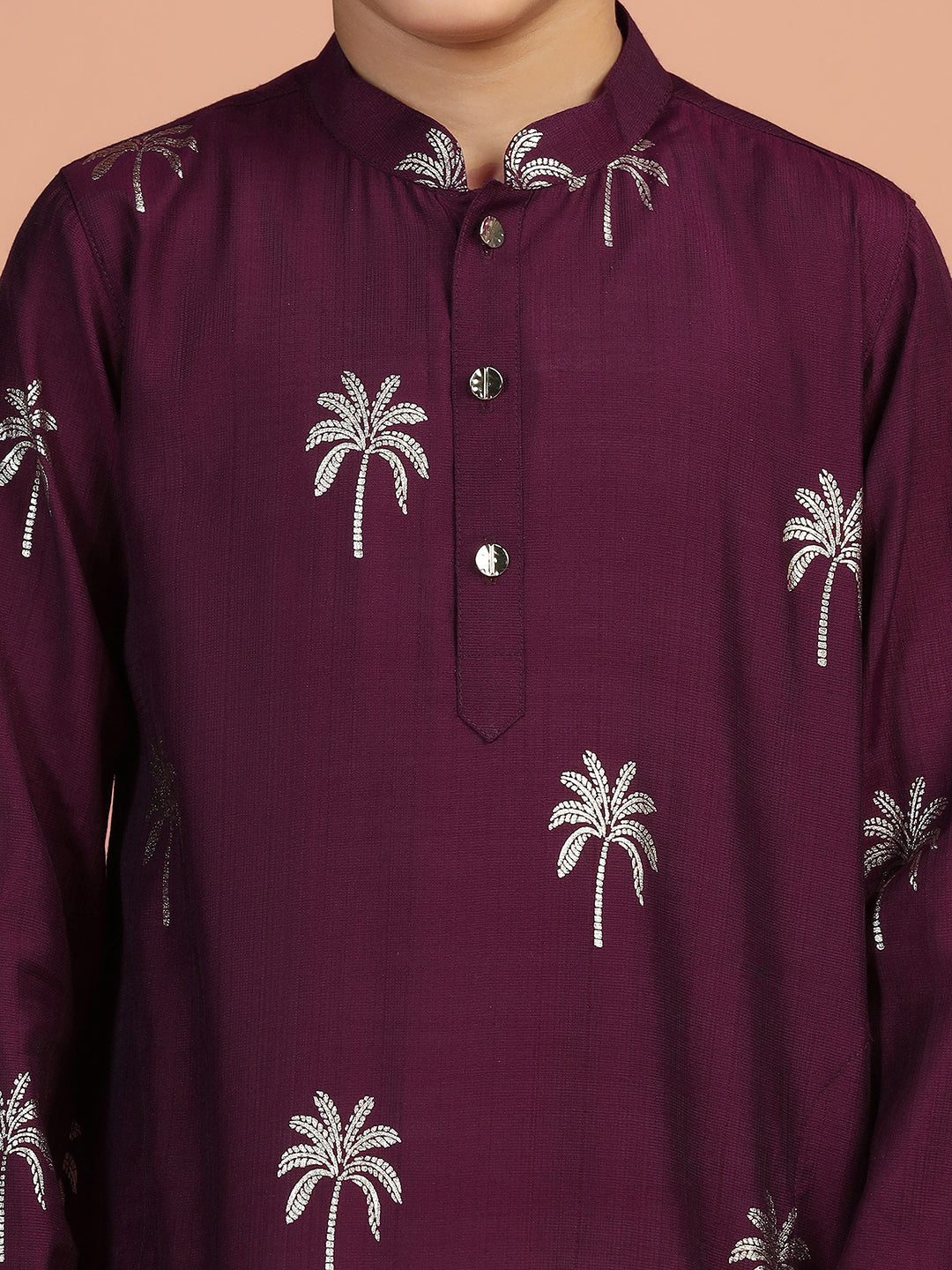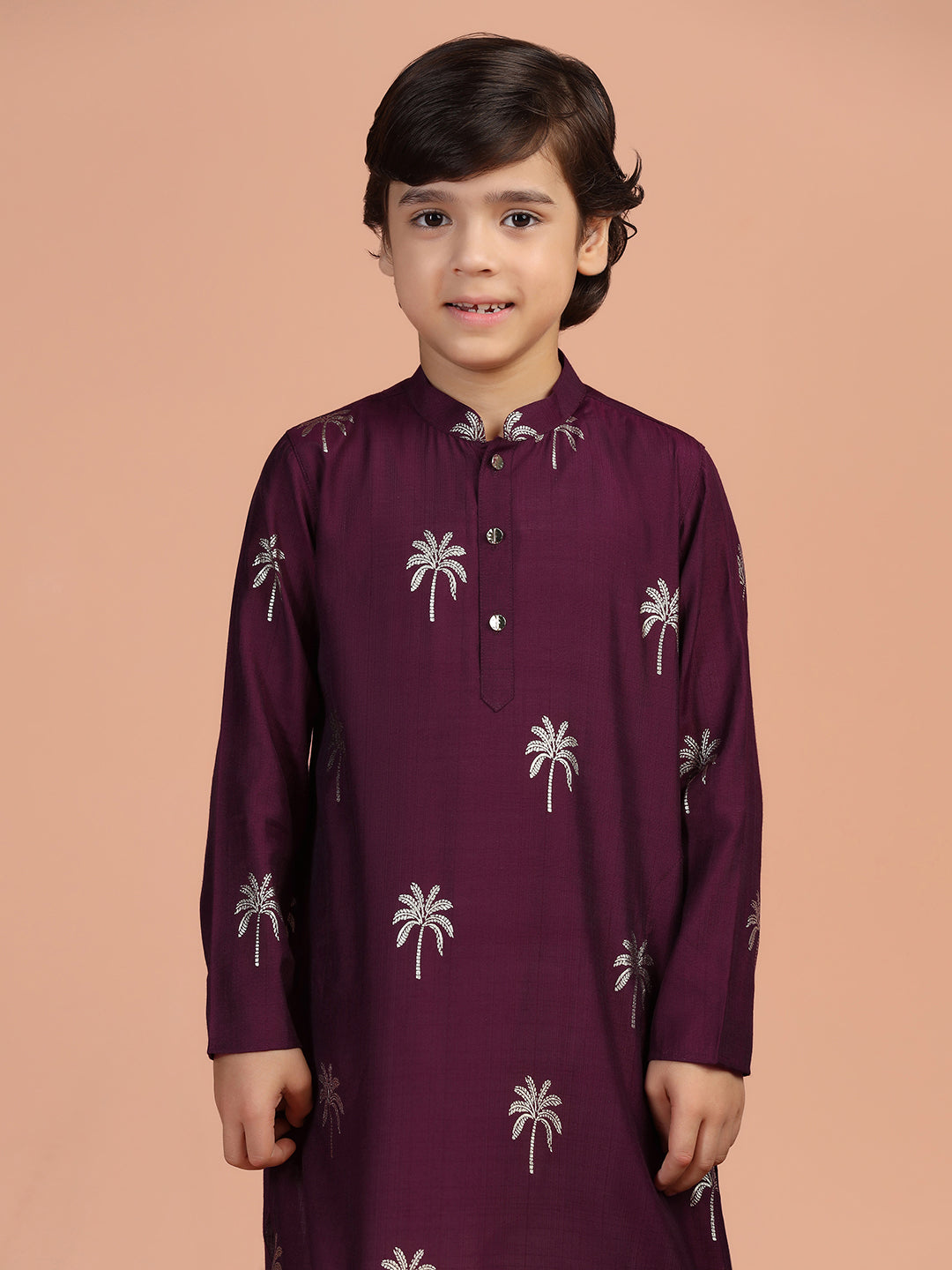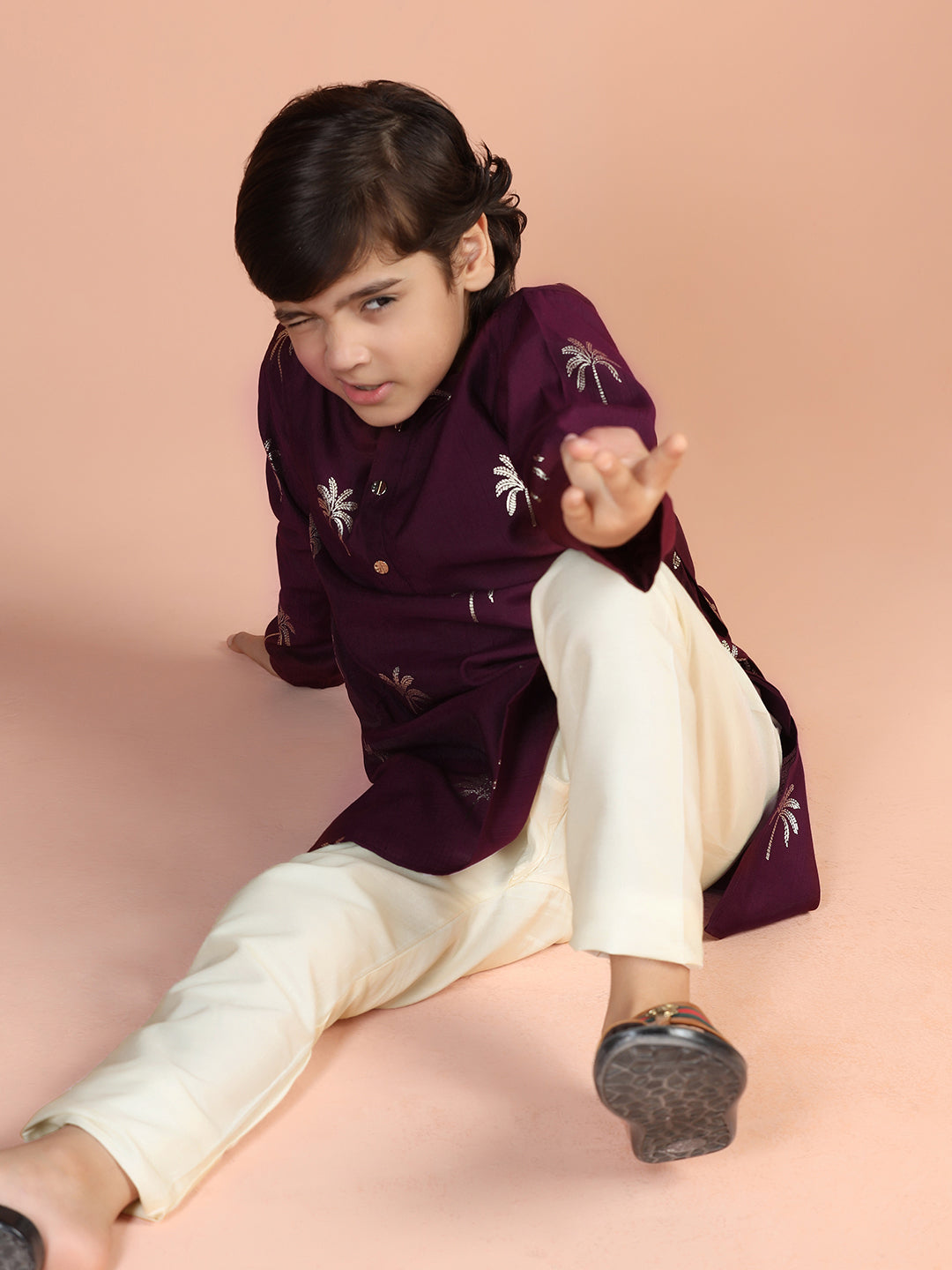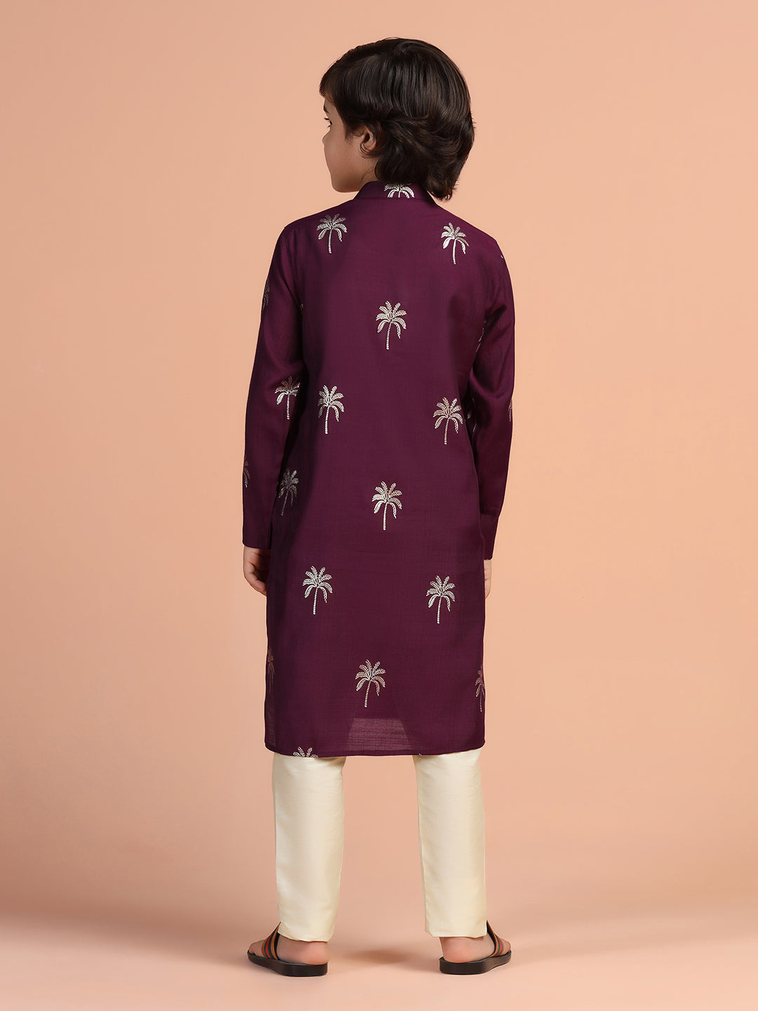 Wine palm print cotton blend kurta for boys – stylish festive wear from Kisah Kids.