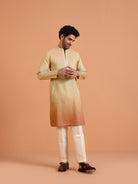 Beige silk blend ombre kurta with zip trouser set for men. Modern festive outfit, perfect for weddings, puja, and celebratory occasions.