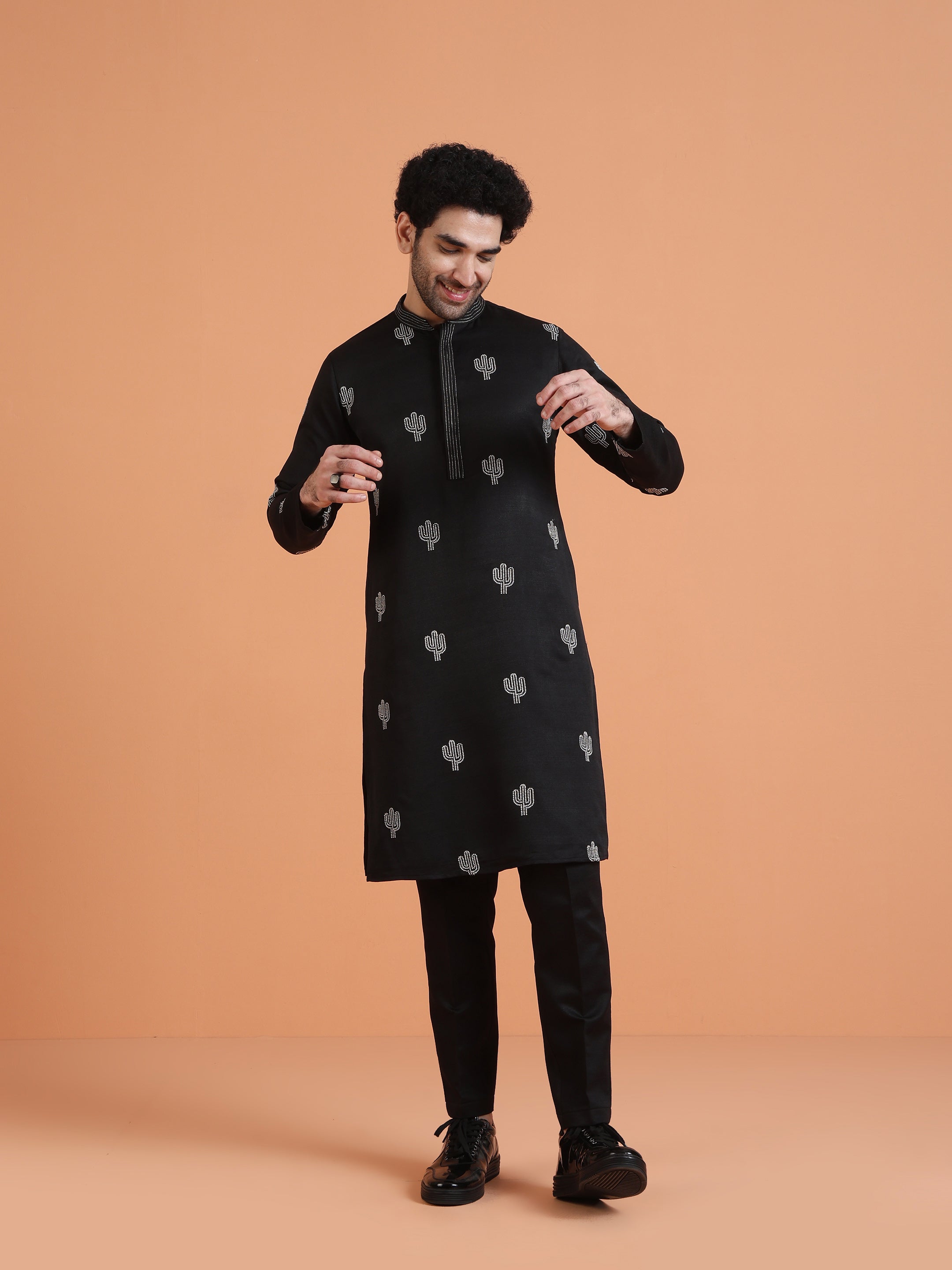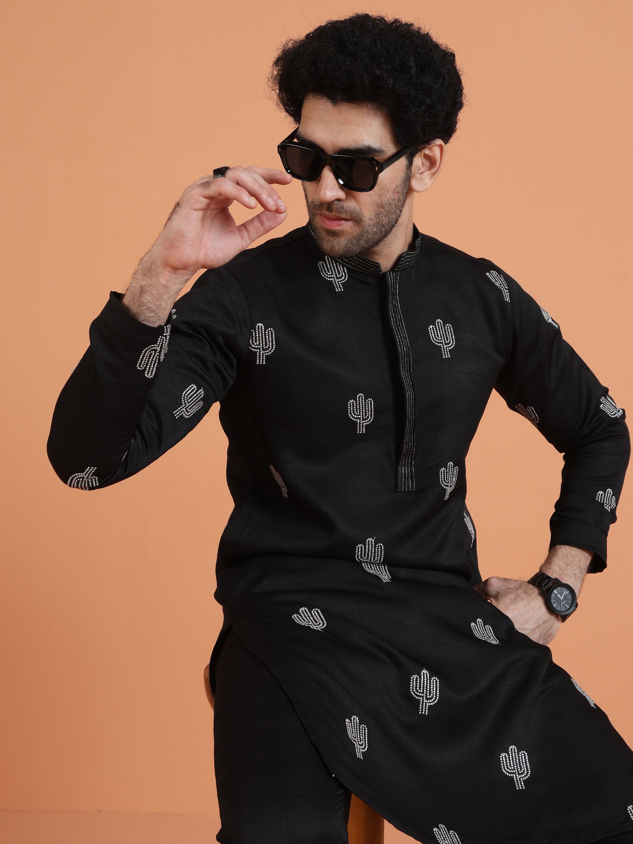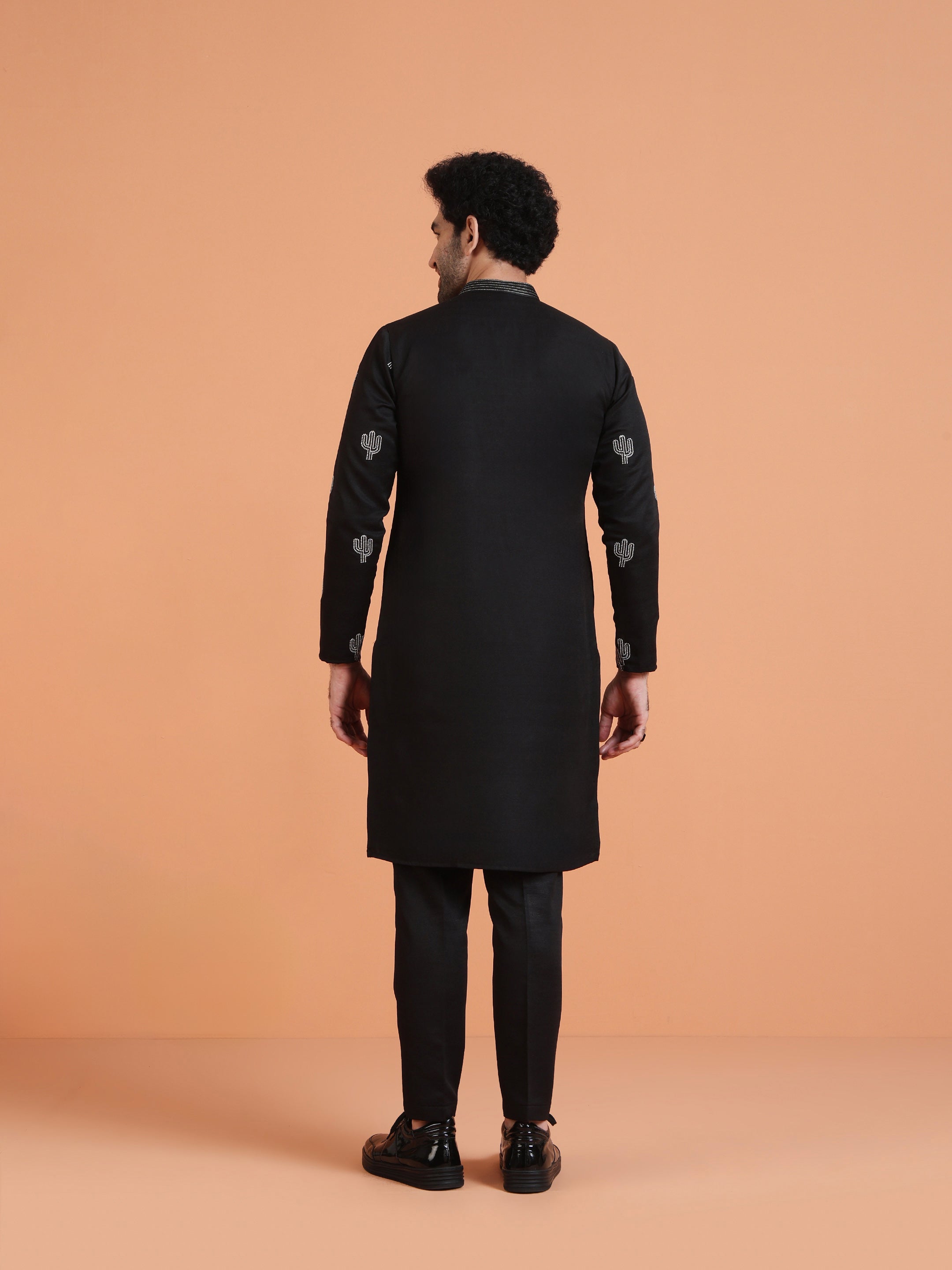 Kisah Black Embroidered Kurta with Black Trouser Set in silk blend with beadwork and pockets. Ideal festive wear for weddings and celebrations.