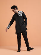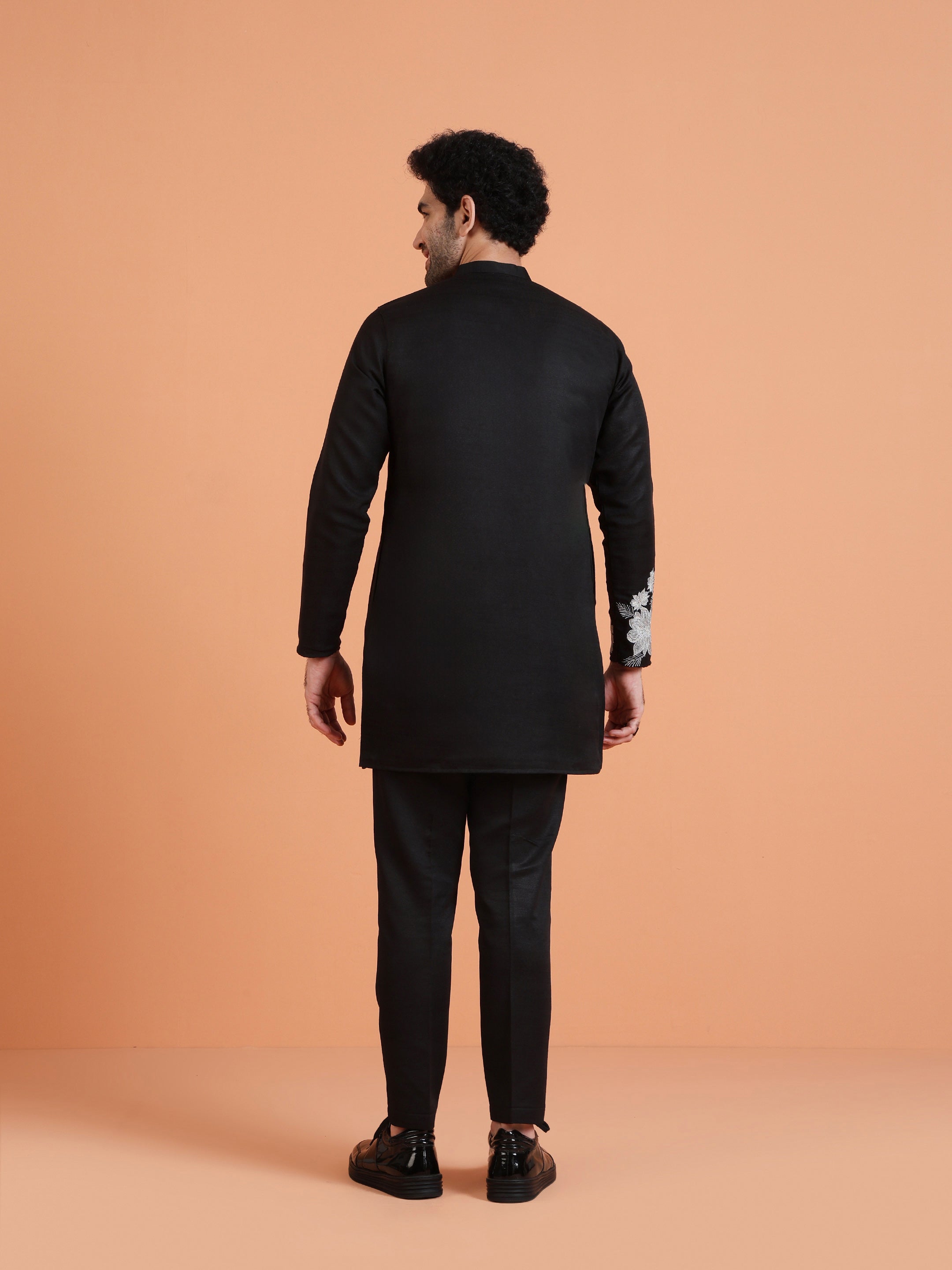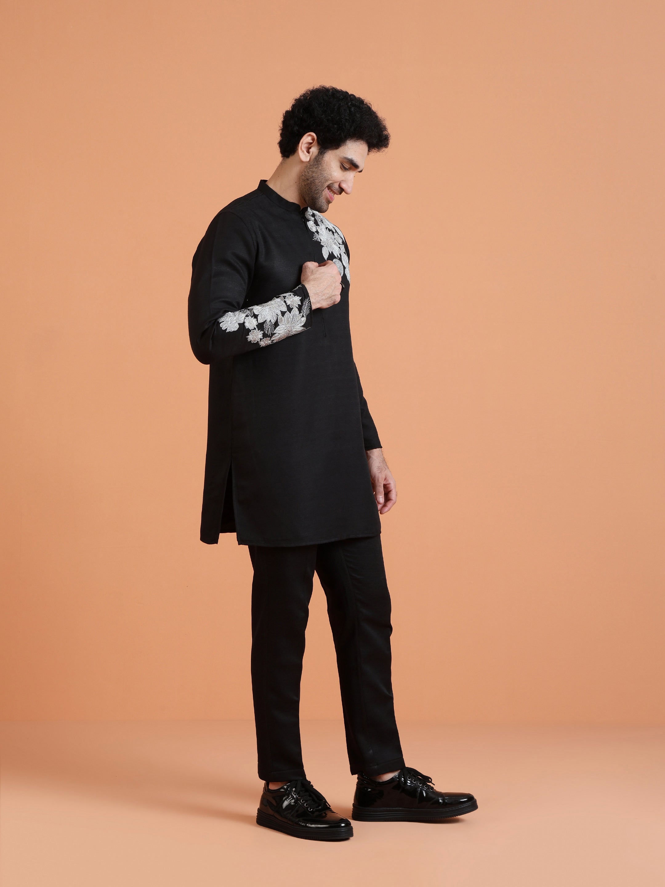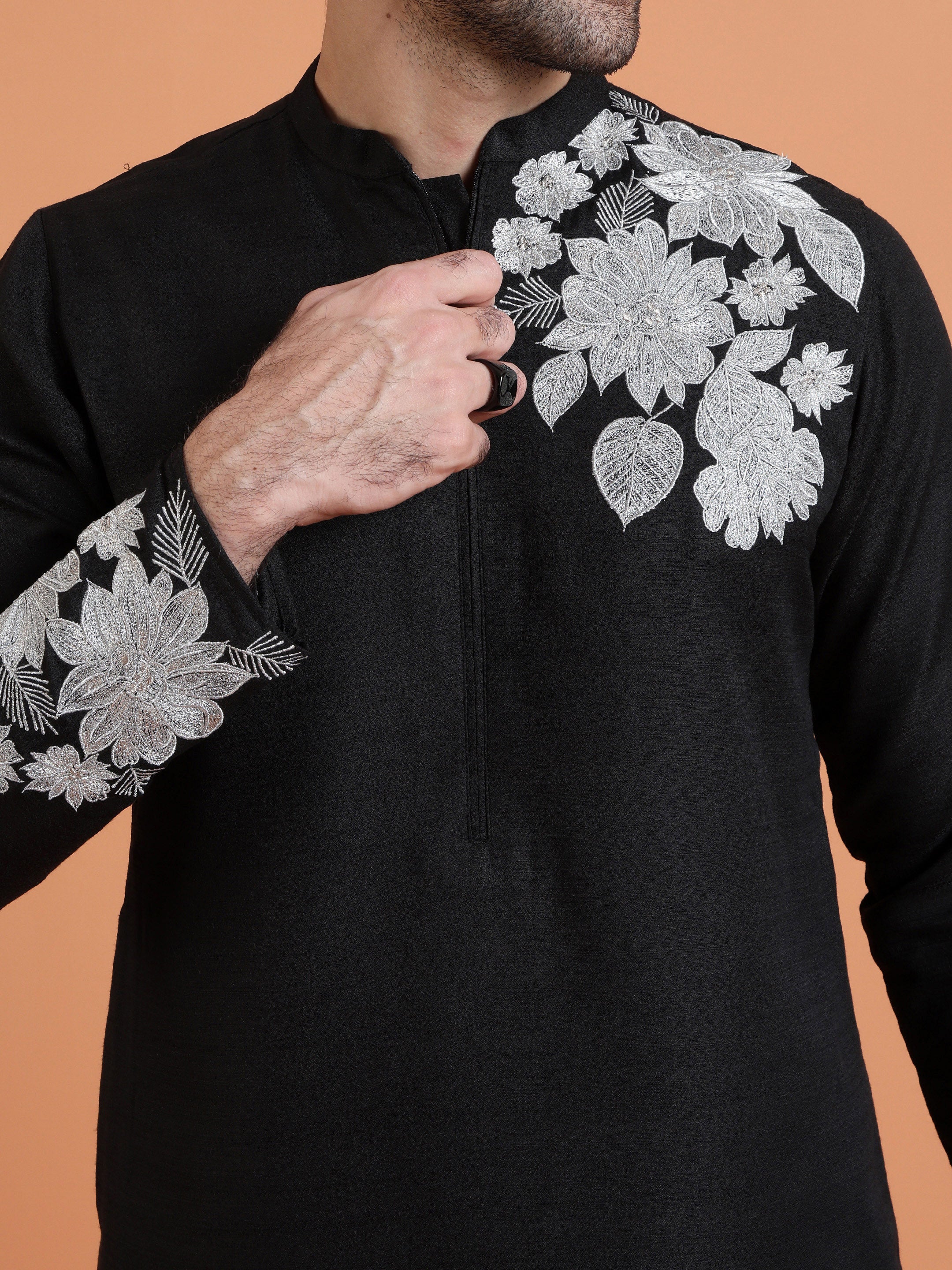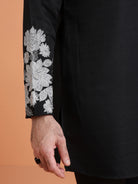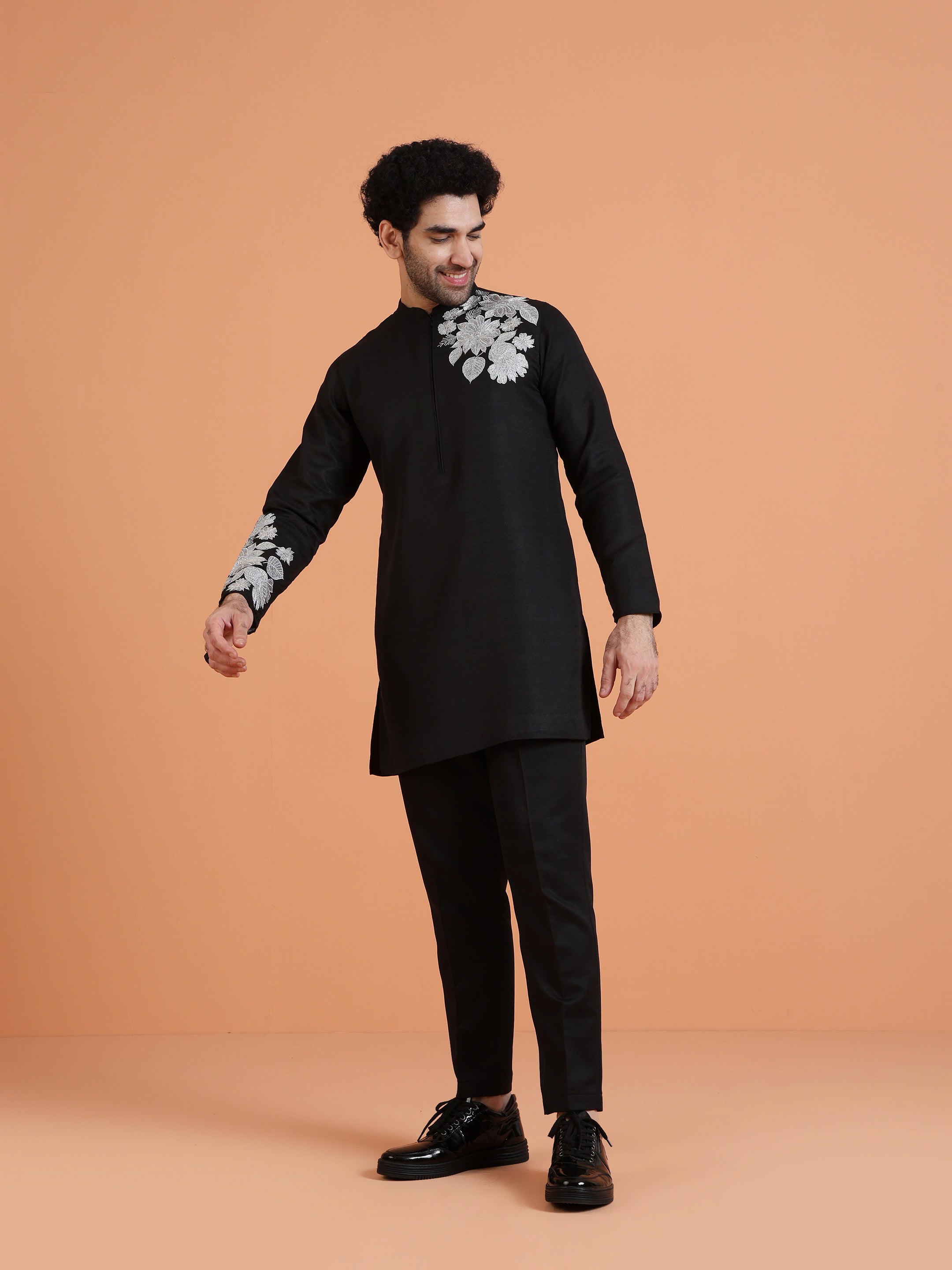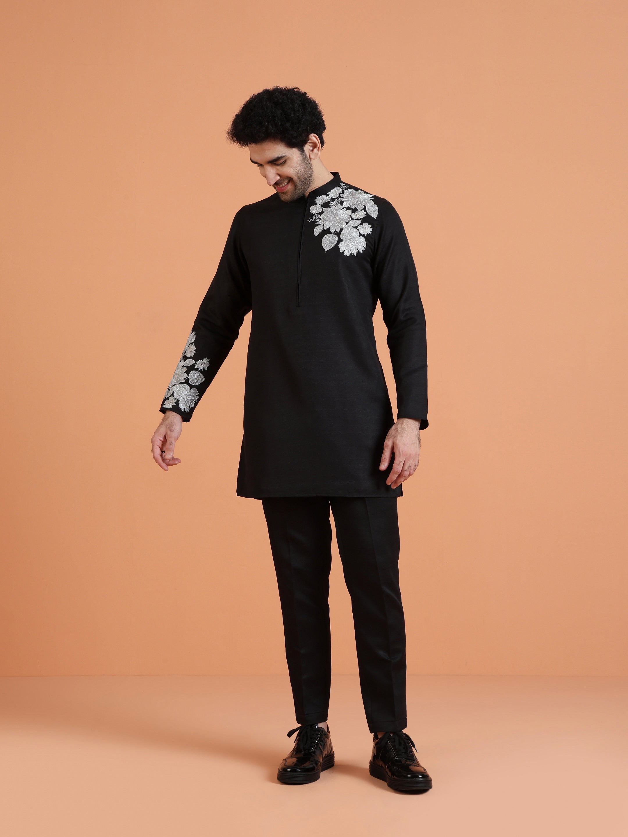 Kisah Black Floral Embroidered Kurta with Black Trouser Set in silk blend. A premium festive outfit with pockets, perfect for weddings and receptions.