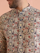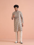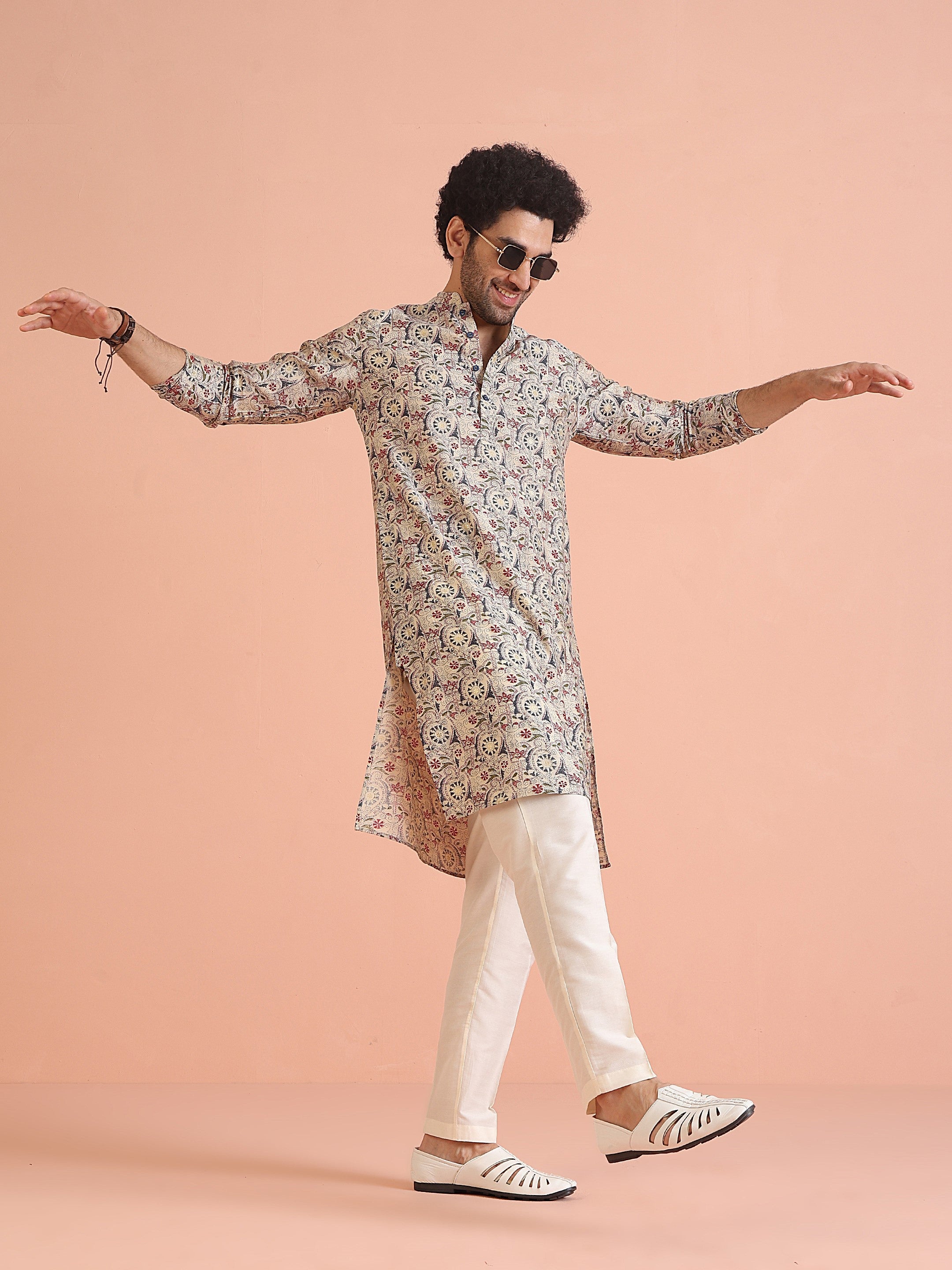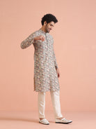 Kisah men’s cream cotton printed kurta trouser set with multicolor ethnic motifs, ideal for festive, puja & casual occasions.