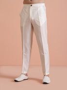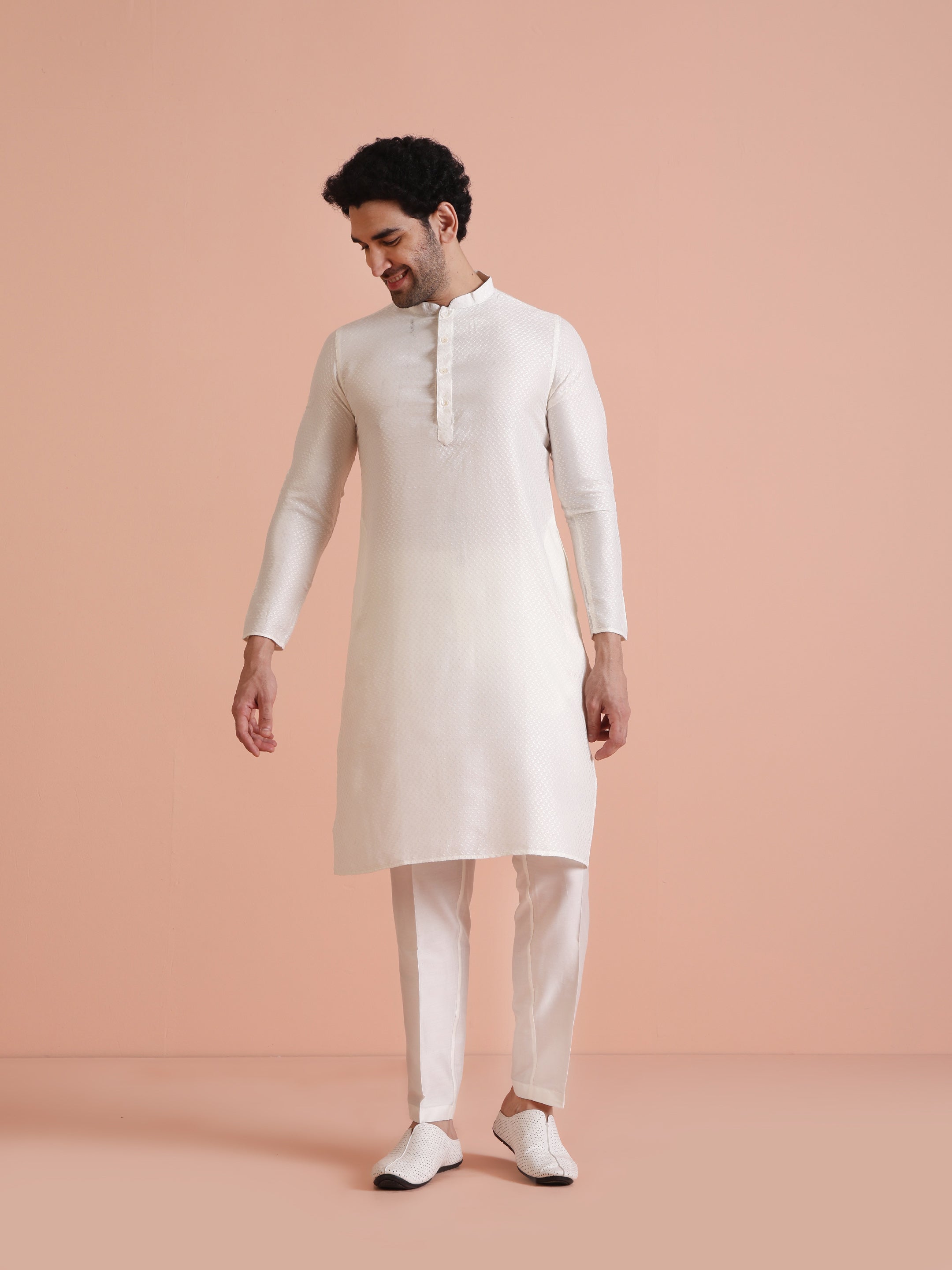 Cream jacquard poly silk kurta trouser set for men. Elegant and comfortable festive wear with subtle self-pattern texture.