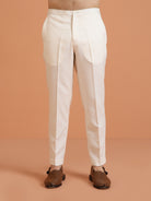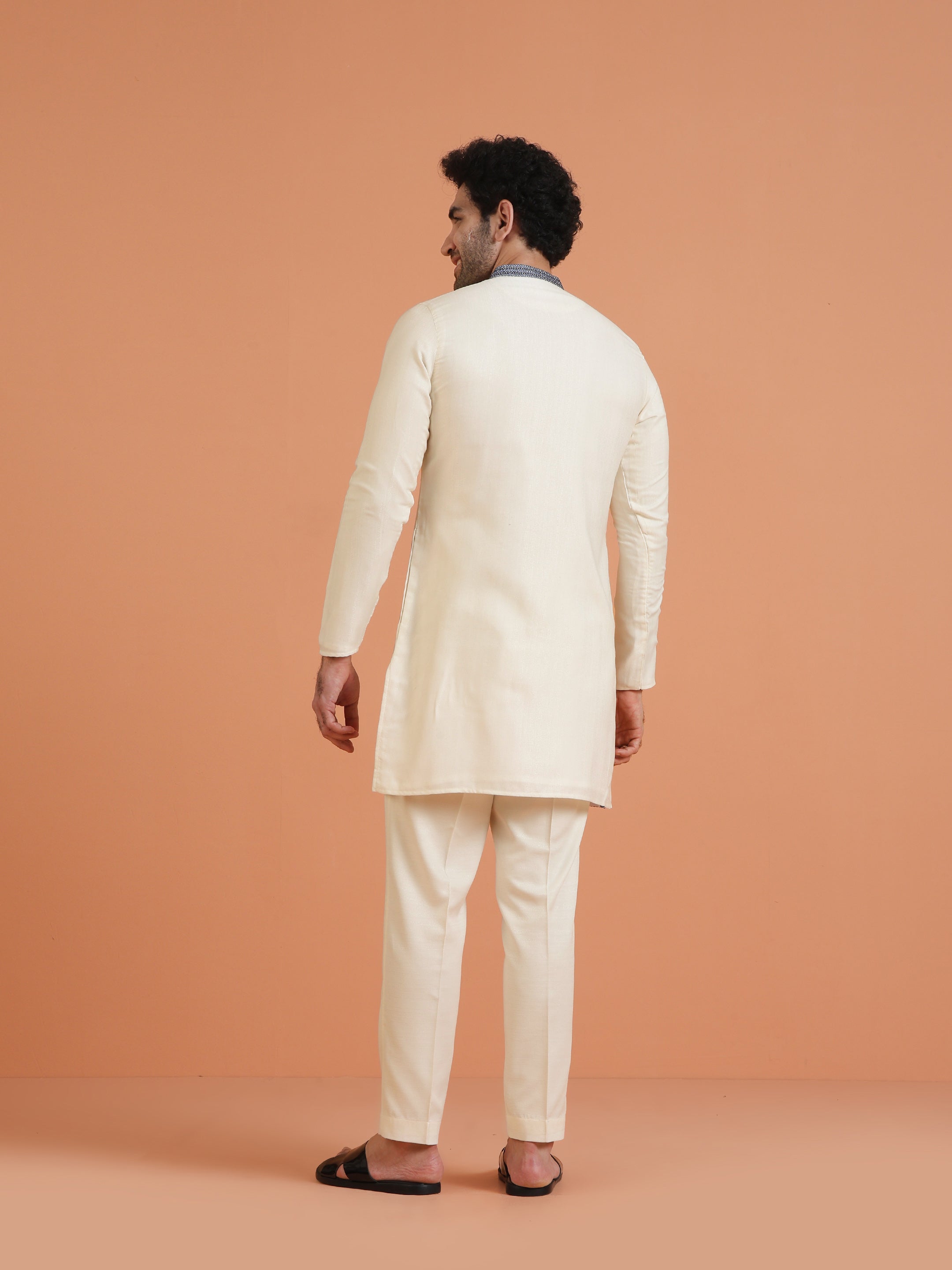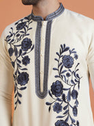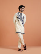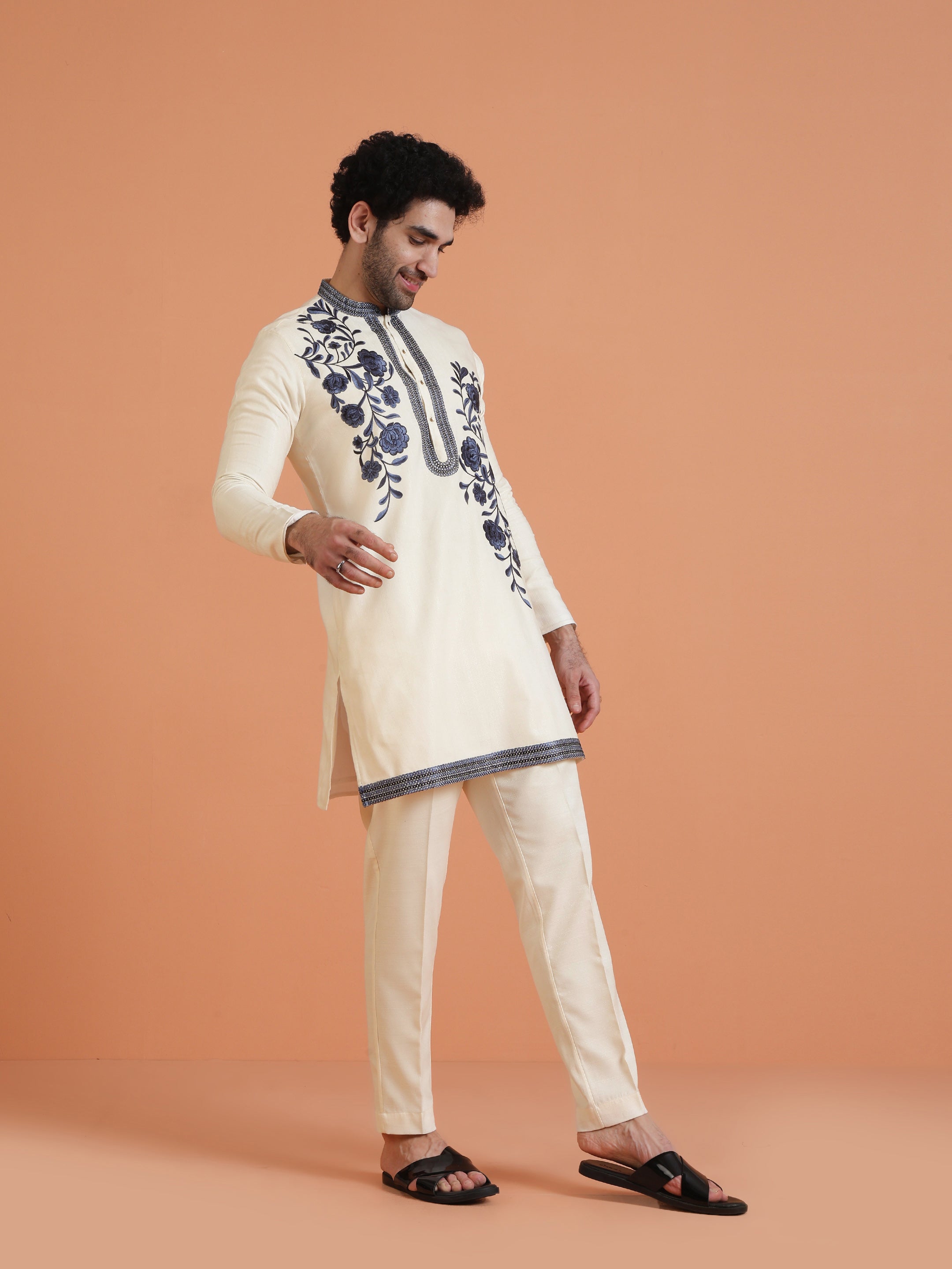 Kisah Cream Kurta with Navy Embroidery & Cream Trouser Set in silk blend. Elegant festive outfit with pockets, ideal for weddings and celebrations.