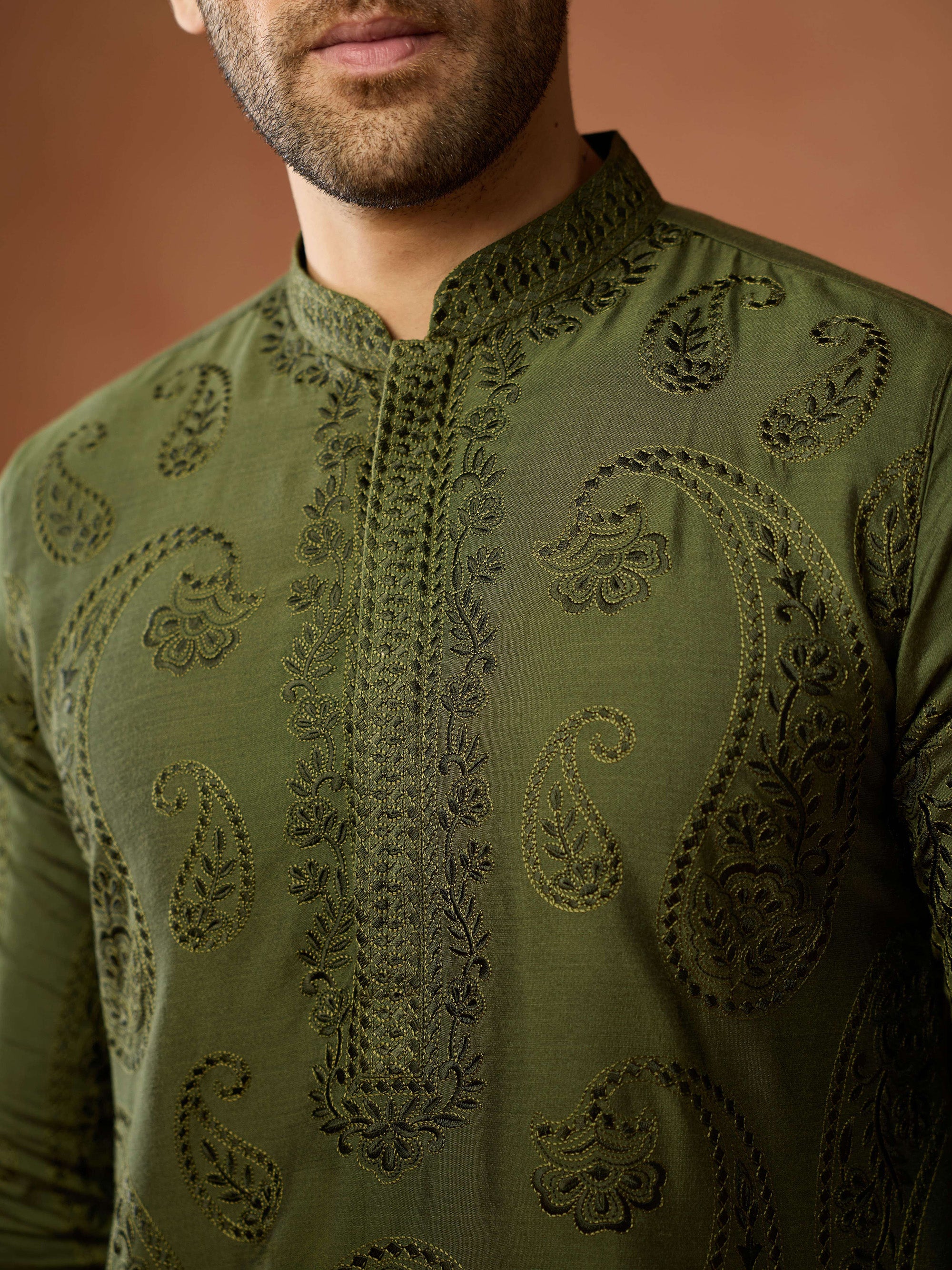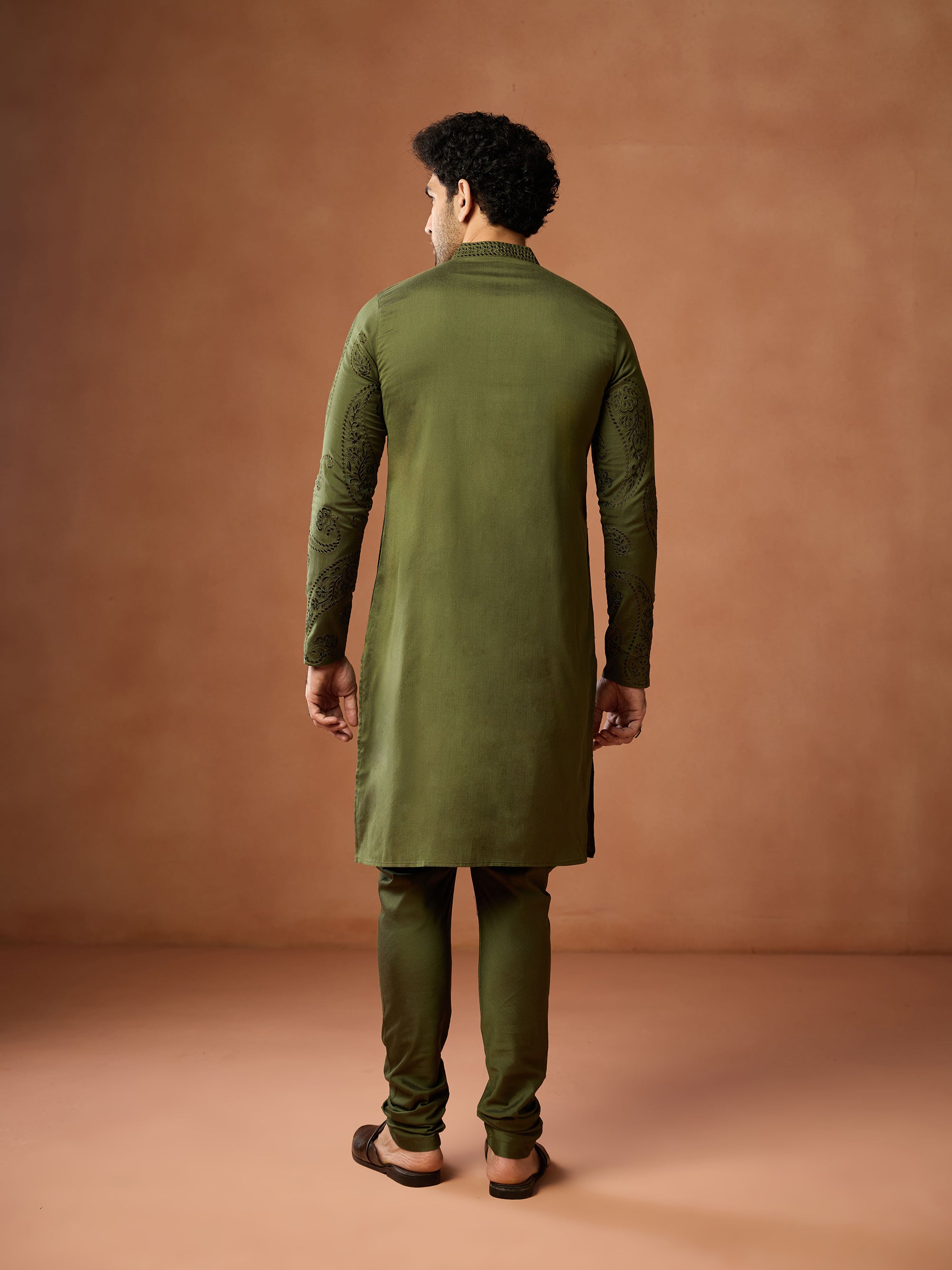 Green cotton embroidered kurta churidar set for men with paisley motifs. Elegant festive outfit for weddings, puja & traditional occasions.