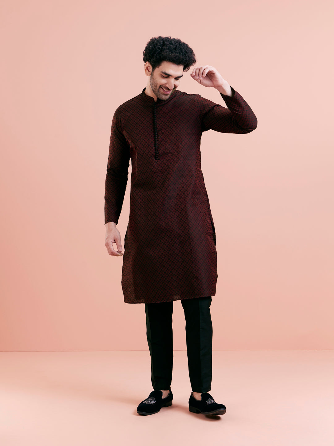 Step out in style with this maroon textured Achkan kurta and trouser set made in silk blend. Perfect for festive gatherings and night functions.