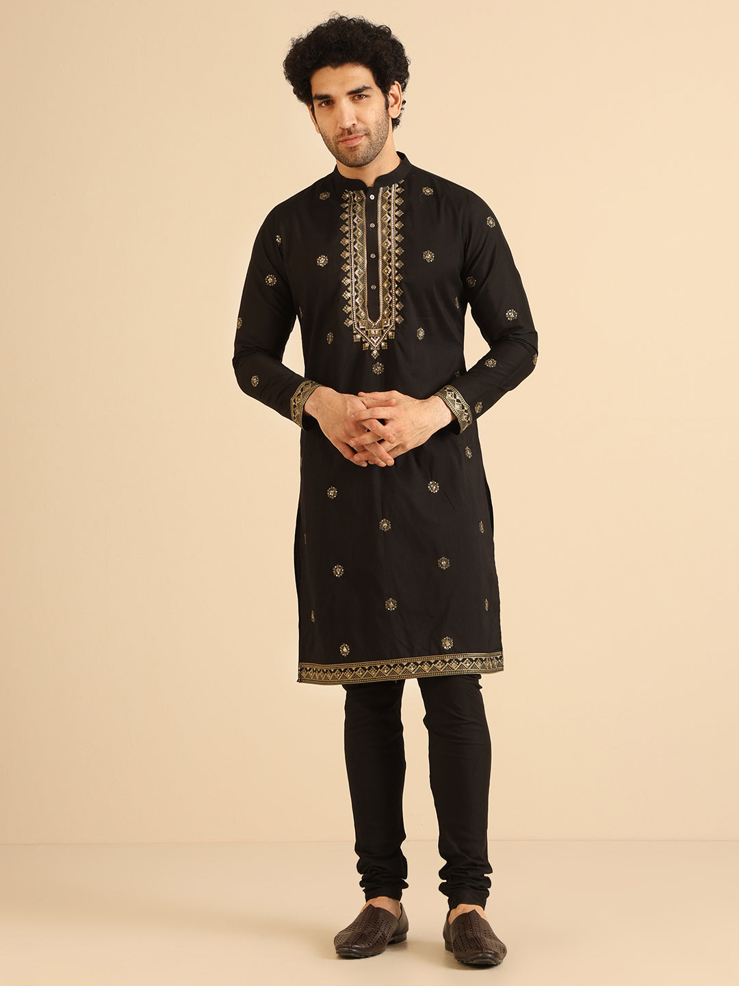 This Black Kurta Churidar Set is a yes for all your casual occasions. The Kurta is of Cotton Blend which adds on to the defined and modern look. This set includes Bottomwear to complete your look
