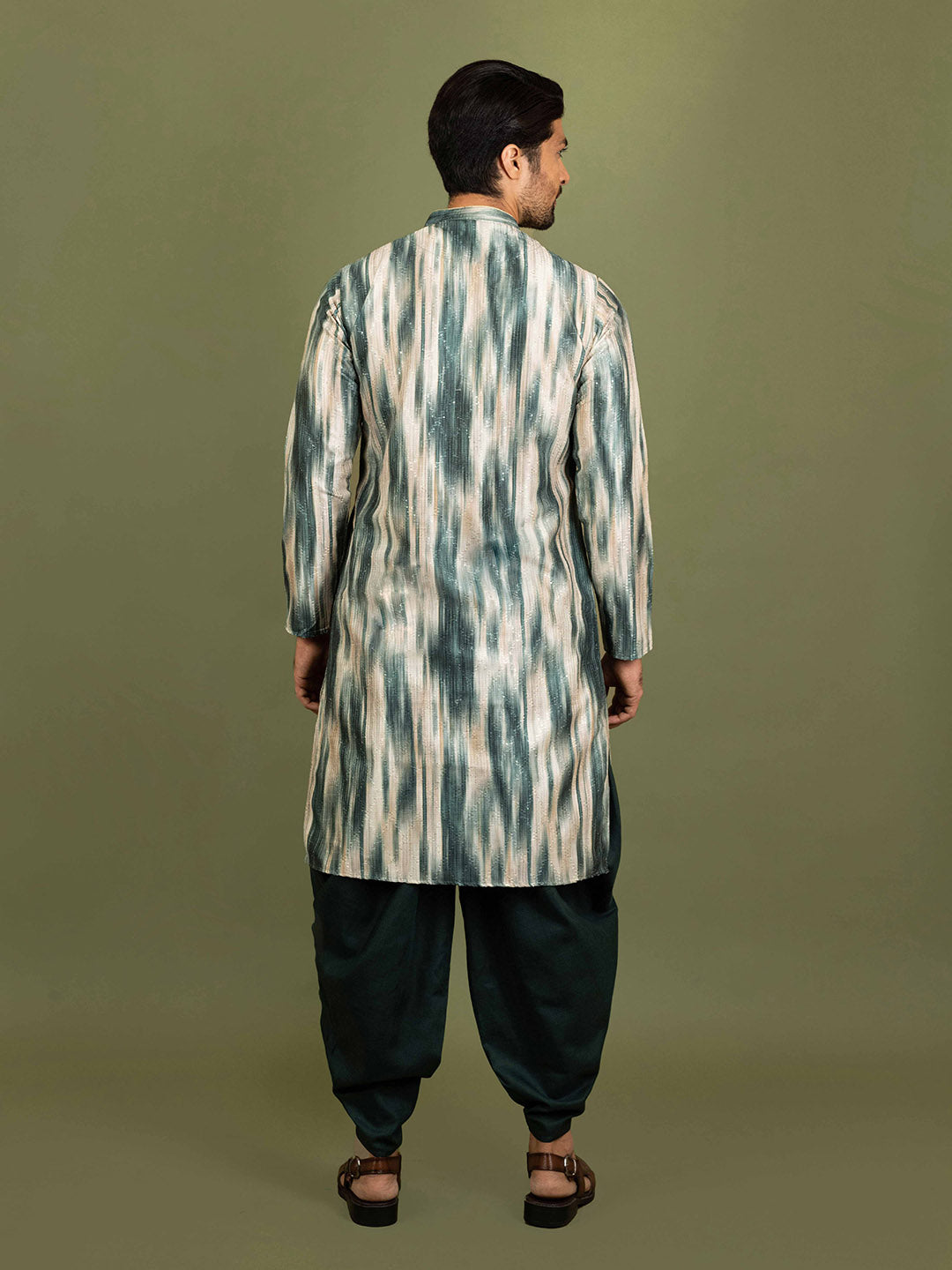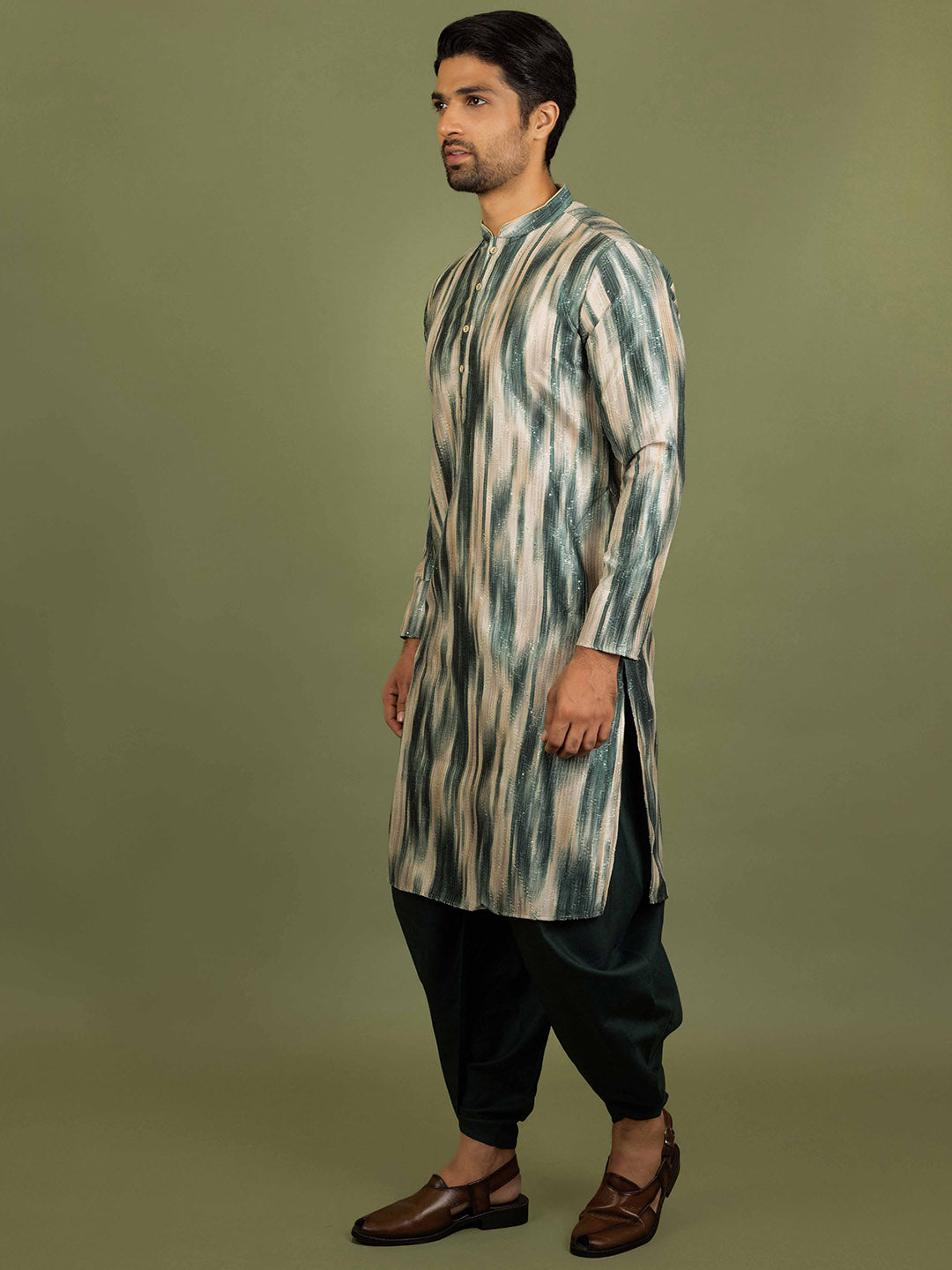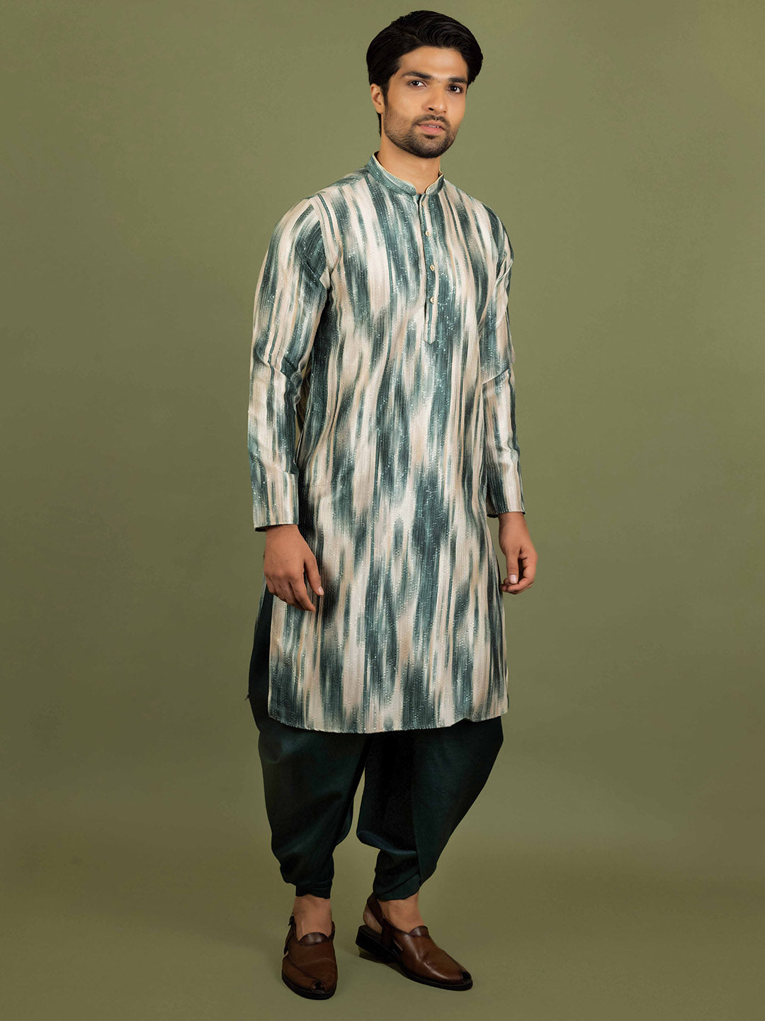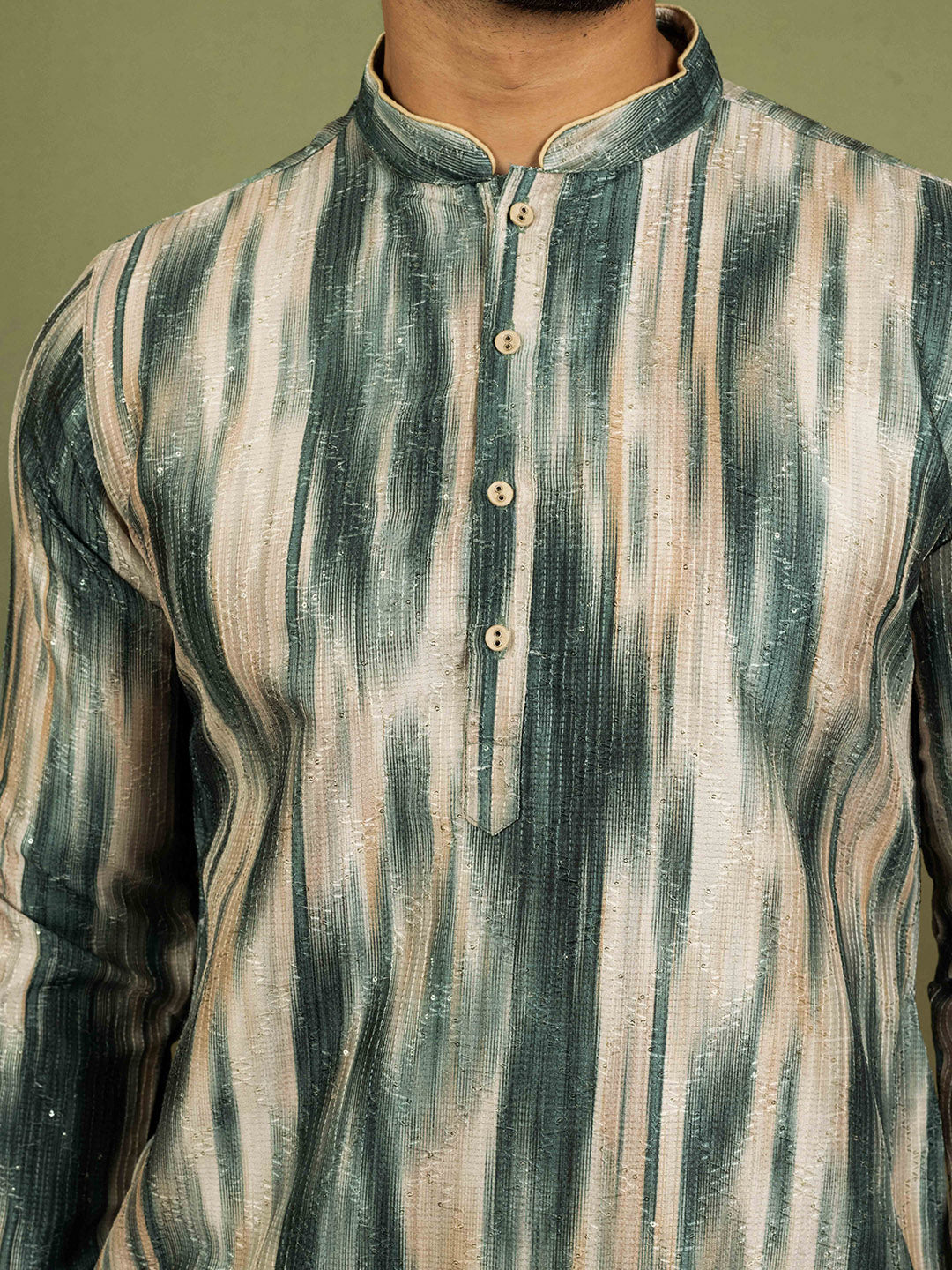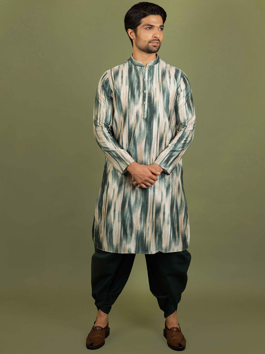 The Kisah Kurta Dhoti Set is ideal for men looking for stylish yet comfortable attire. Crafted from Cotton Silk fabric, Green color, stylish Striped pattern, and comfortable fit make it perfect for festive wear.