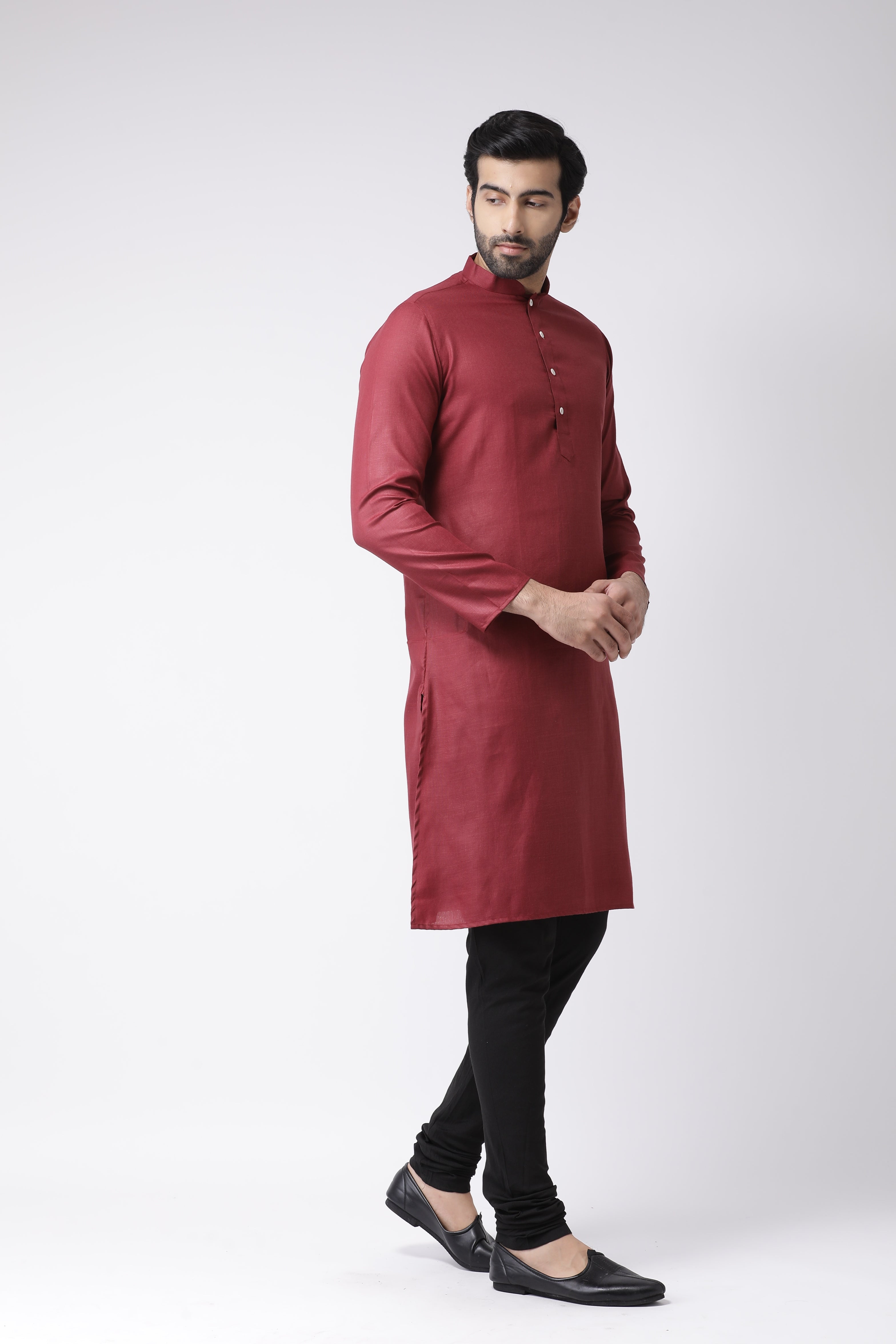 Experience classic elegance with this Men's Maroon Color Cotton Blend Kurta Churidar Set. The Solid Dyed Pattern adds a refined touch, while the breathable fabric ensures comfort throughout the day. Ideal for festive events or casual wear, this Kurta Churidar Set is a wardrobe essential.