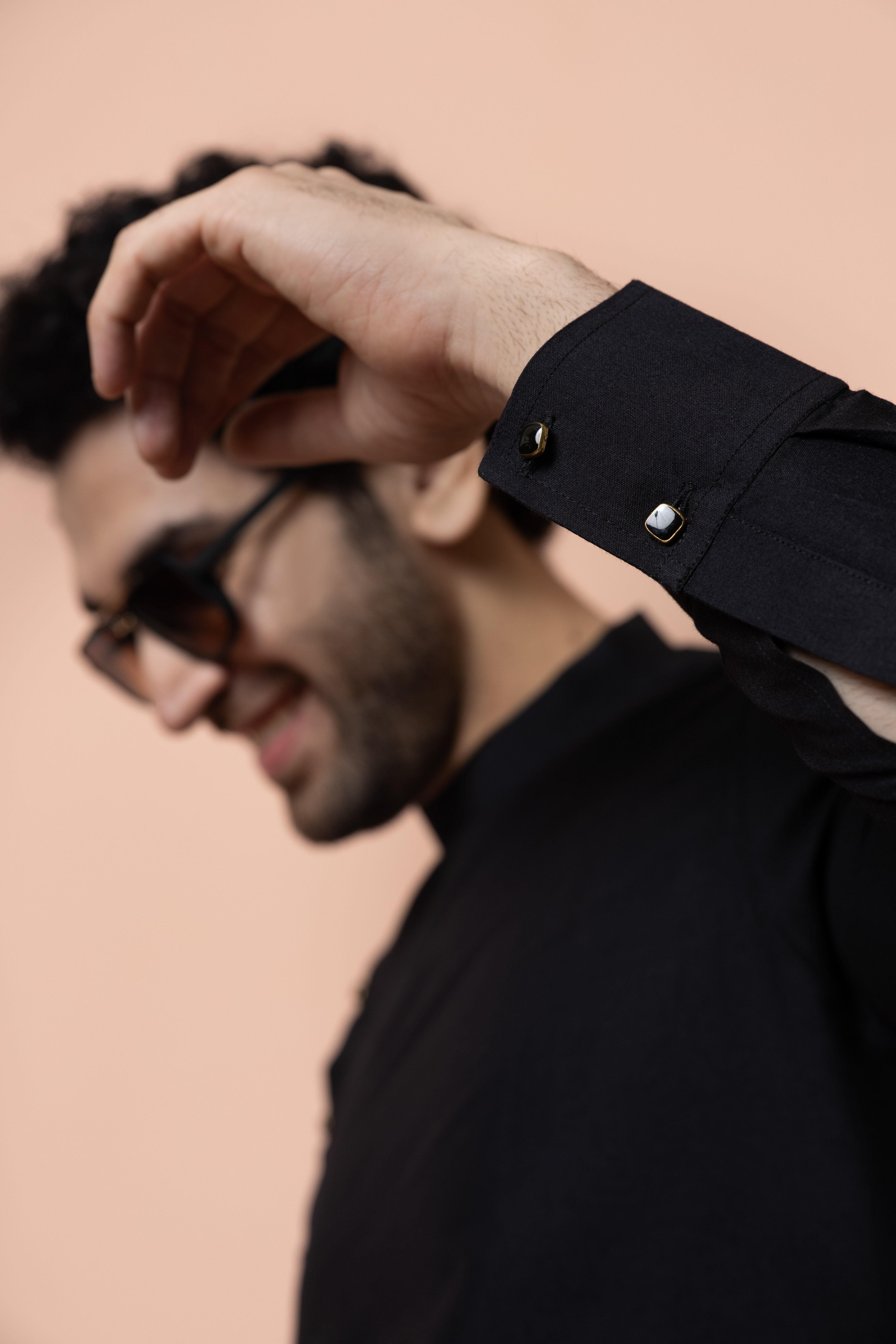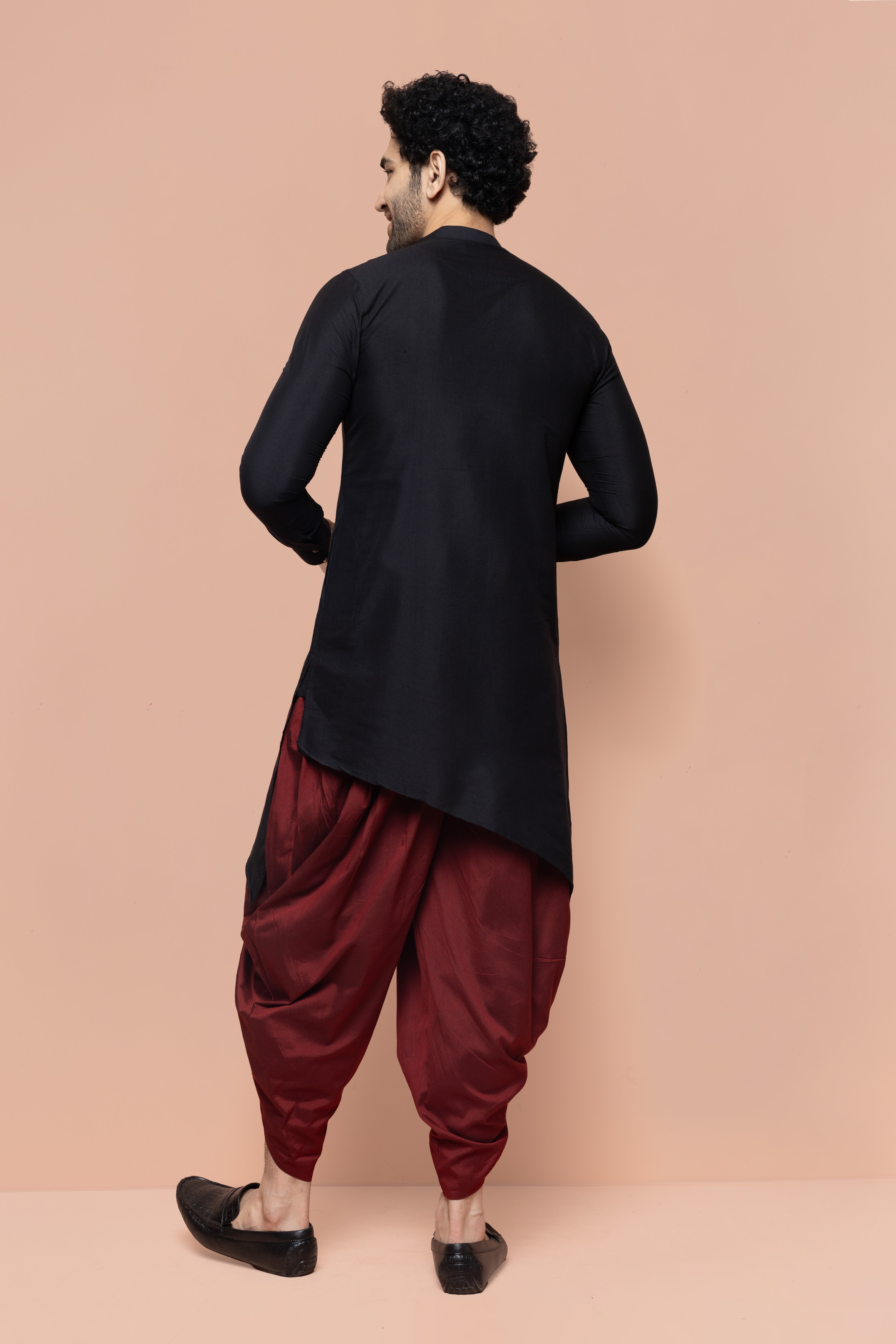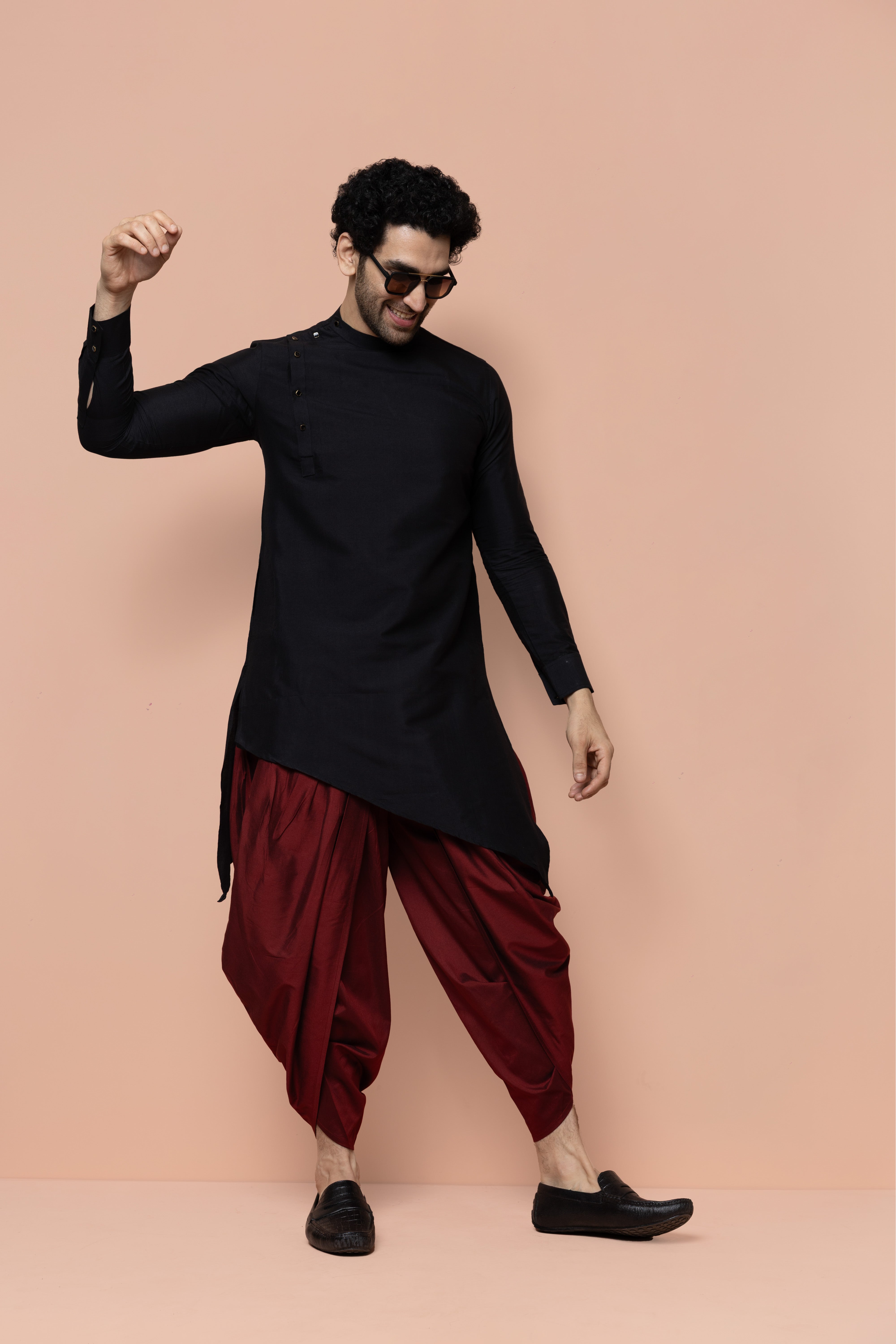 Make a statement with our Black Kurta & Dhoti set. Crafted from a comfortable cotton blend, this solid-colored set offers a regular fit that ensures you look and feel stylish on any occasion.