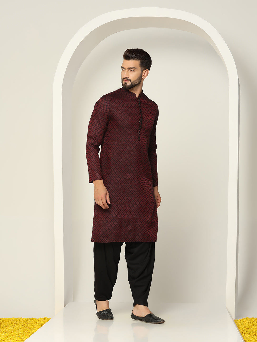 This Kurta Set with Maroon Color is an elegant mandarin collar style that is perfect for occasional wear. With a full sleeve Woven Design design and comfortable fabric, it will make you look stylish.