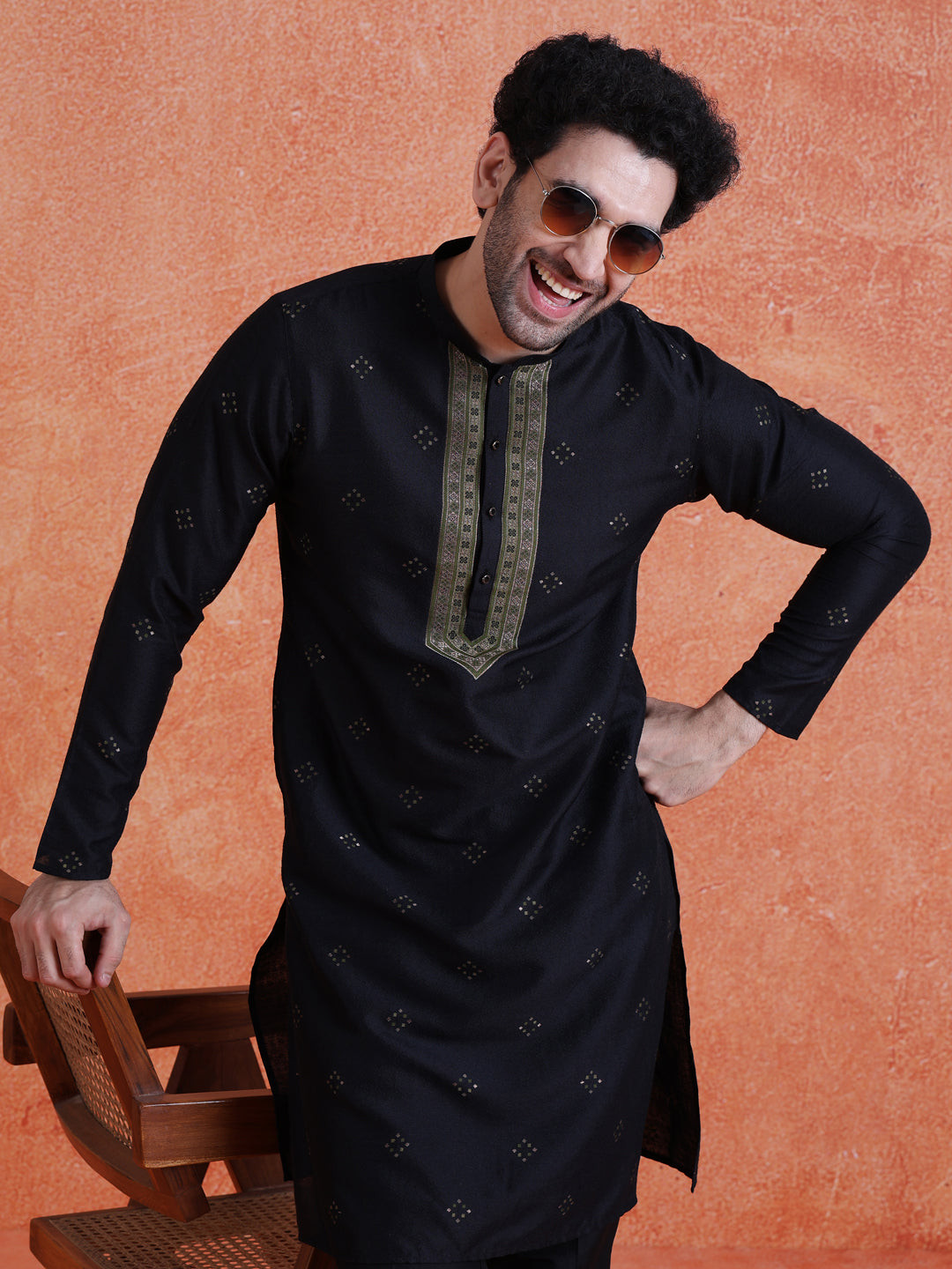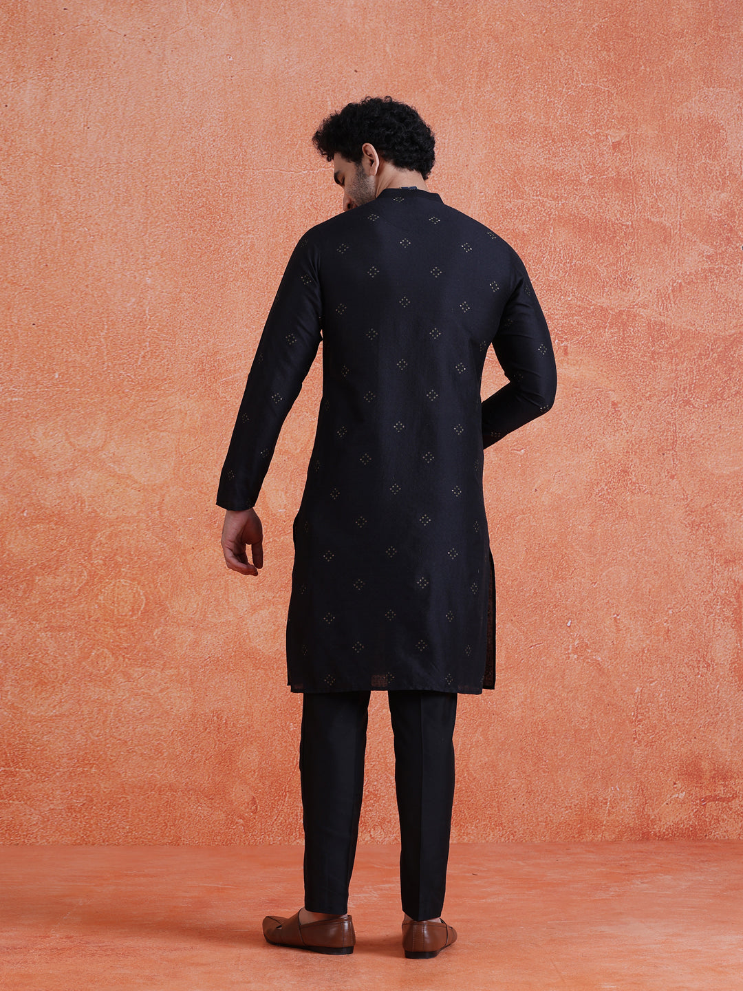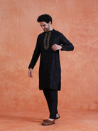 Black Silk Blend Kurta with Jacquard Pattern and Full Sleeves. Perfect for cultural celebrations and festive occasions.