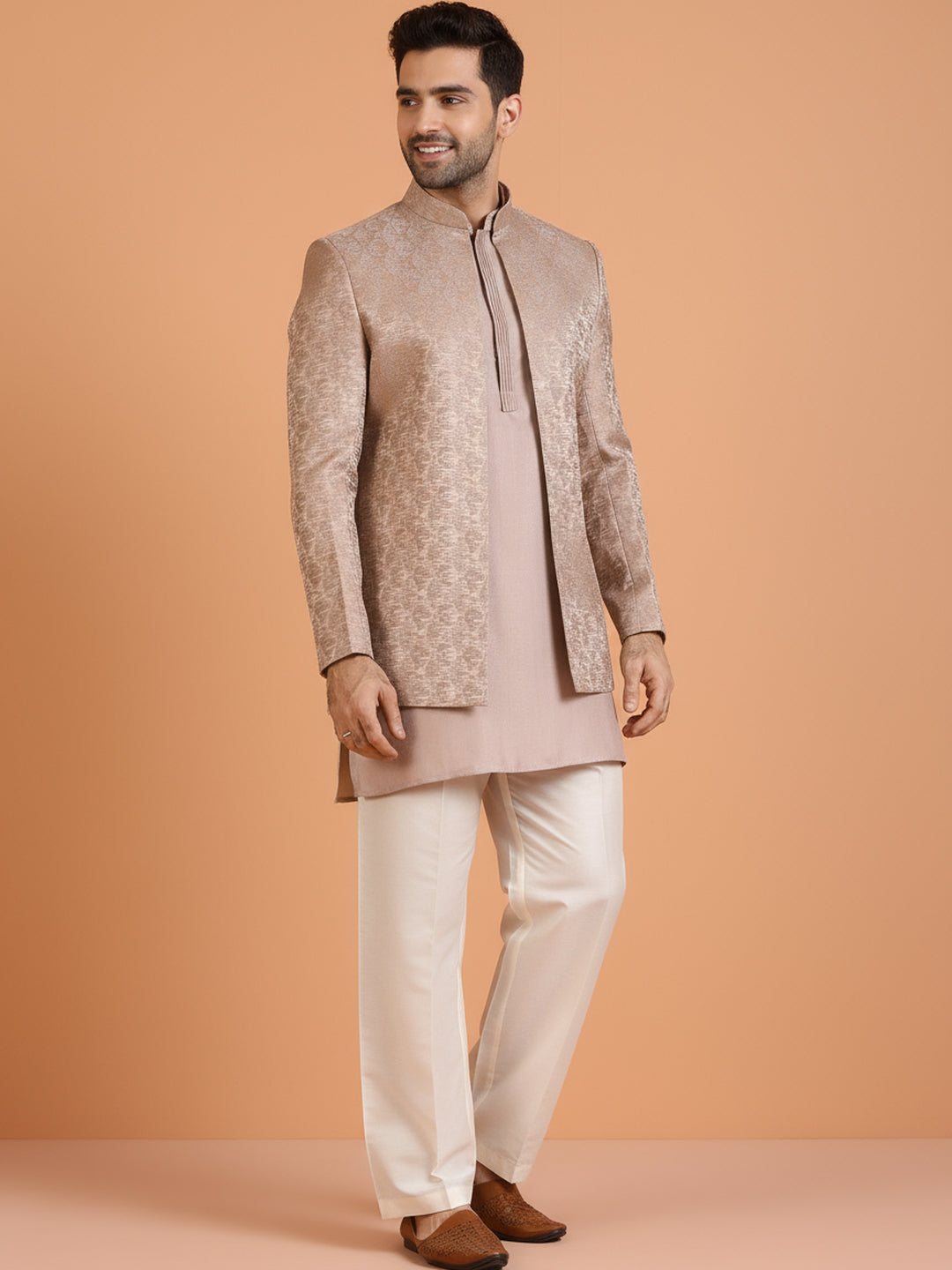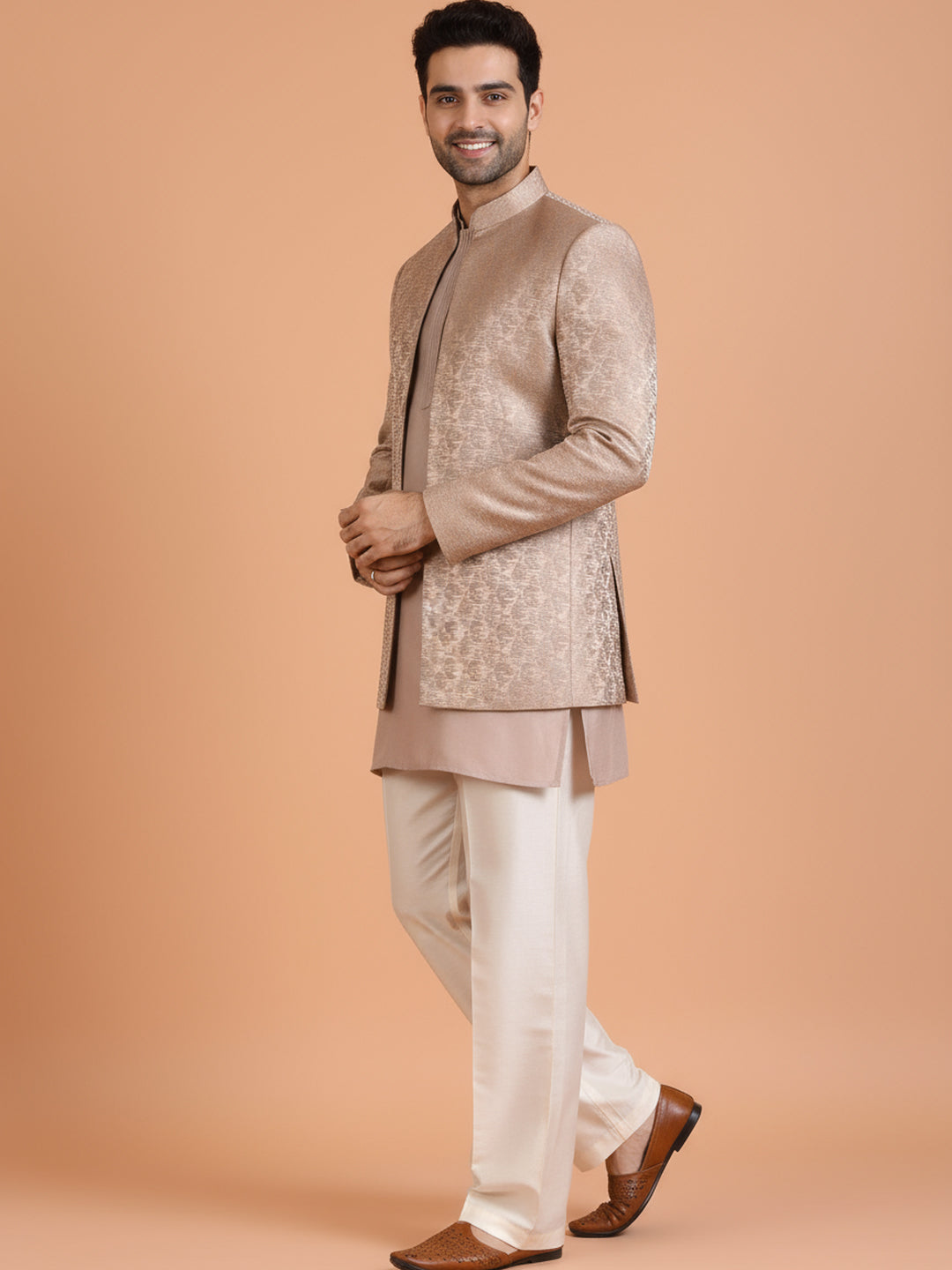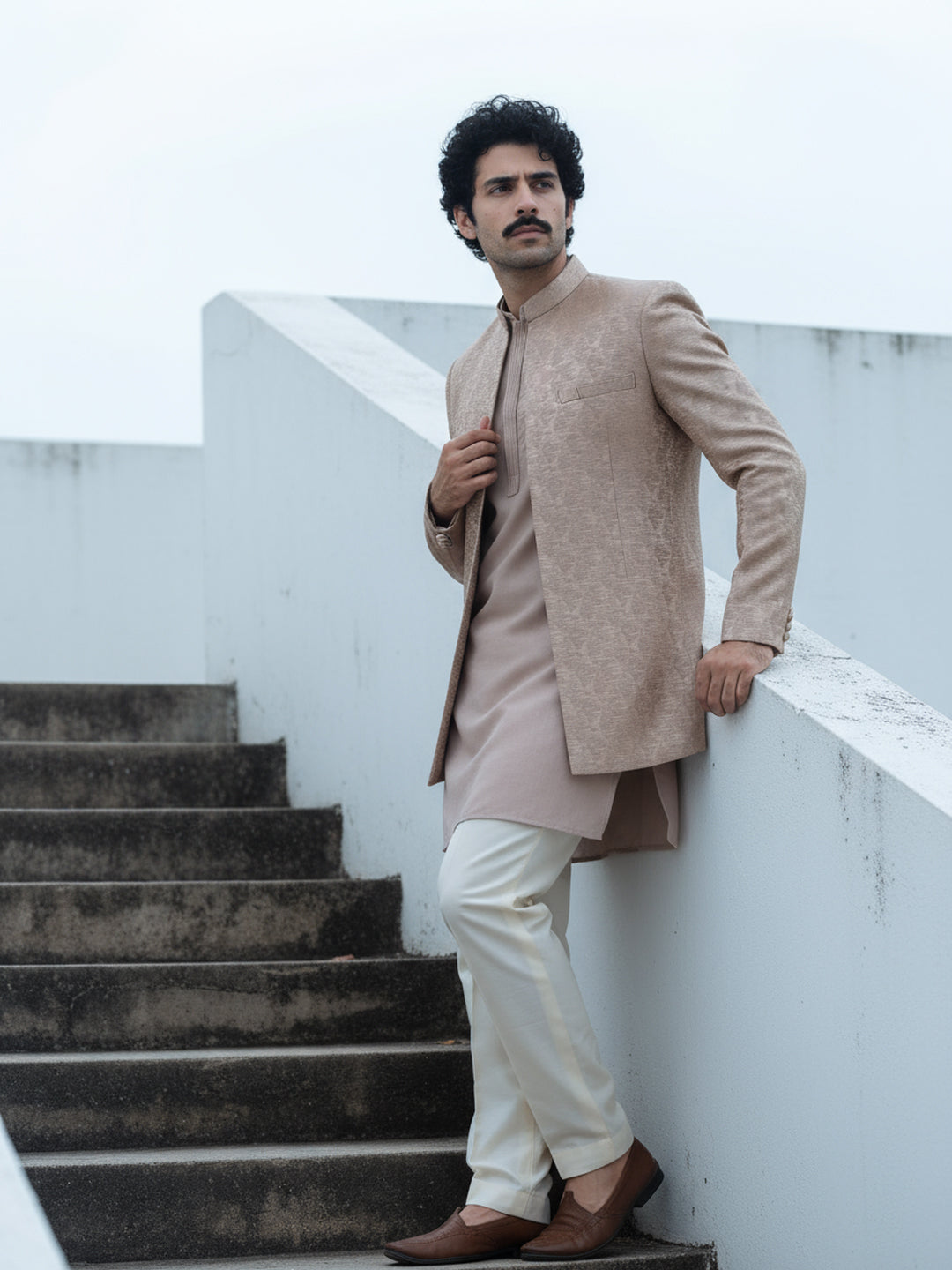 Beige front-open short sherwani with mid kurta and ivory wide-leg trousers — modern, elegant, and perfect for festive occasions.