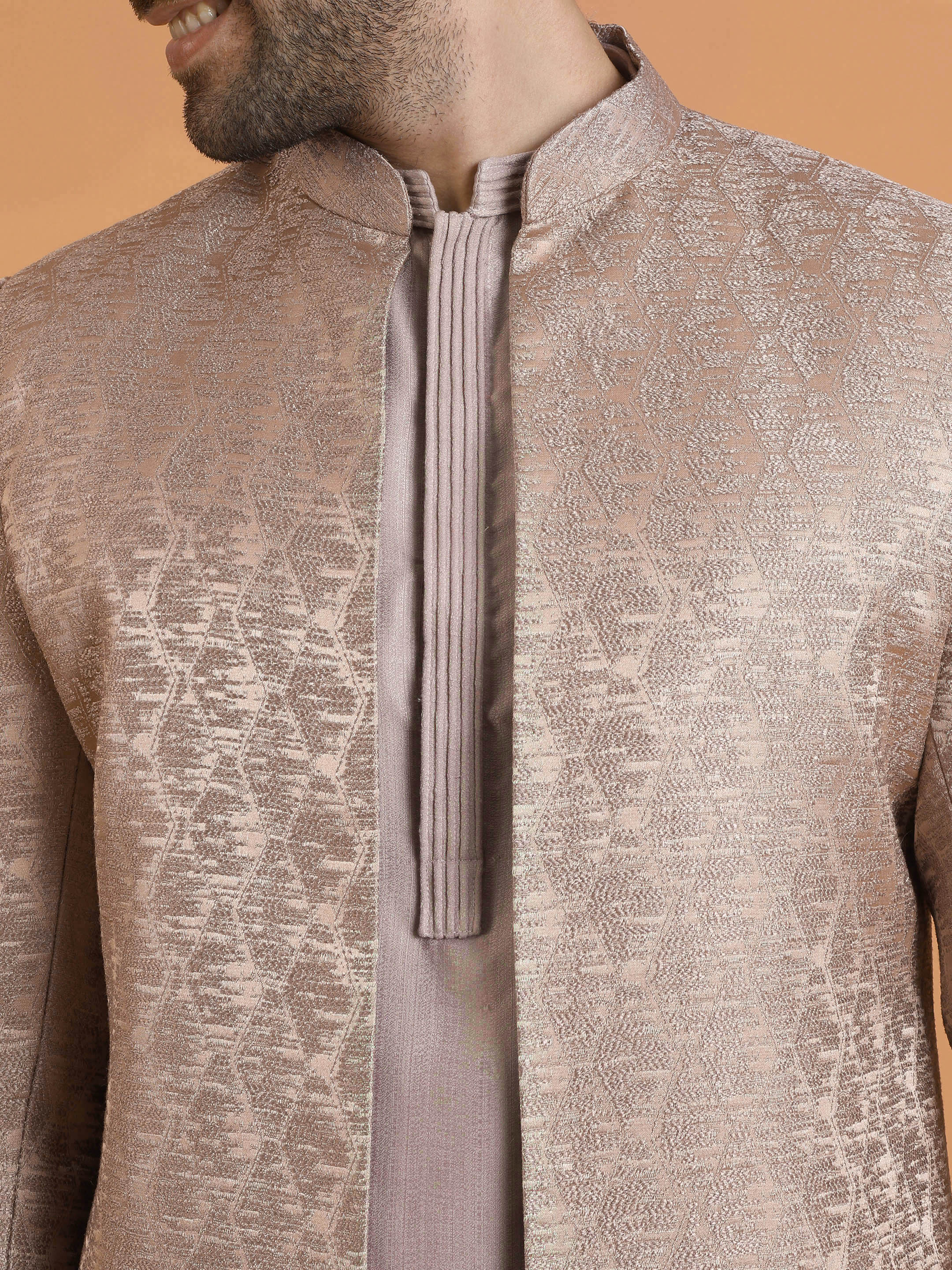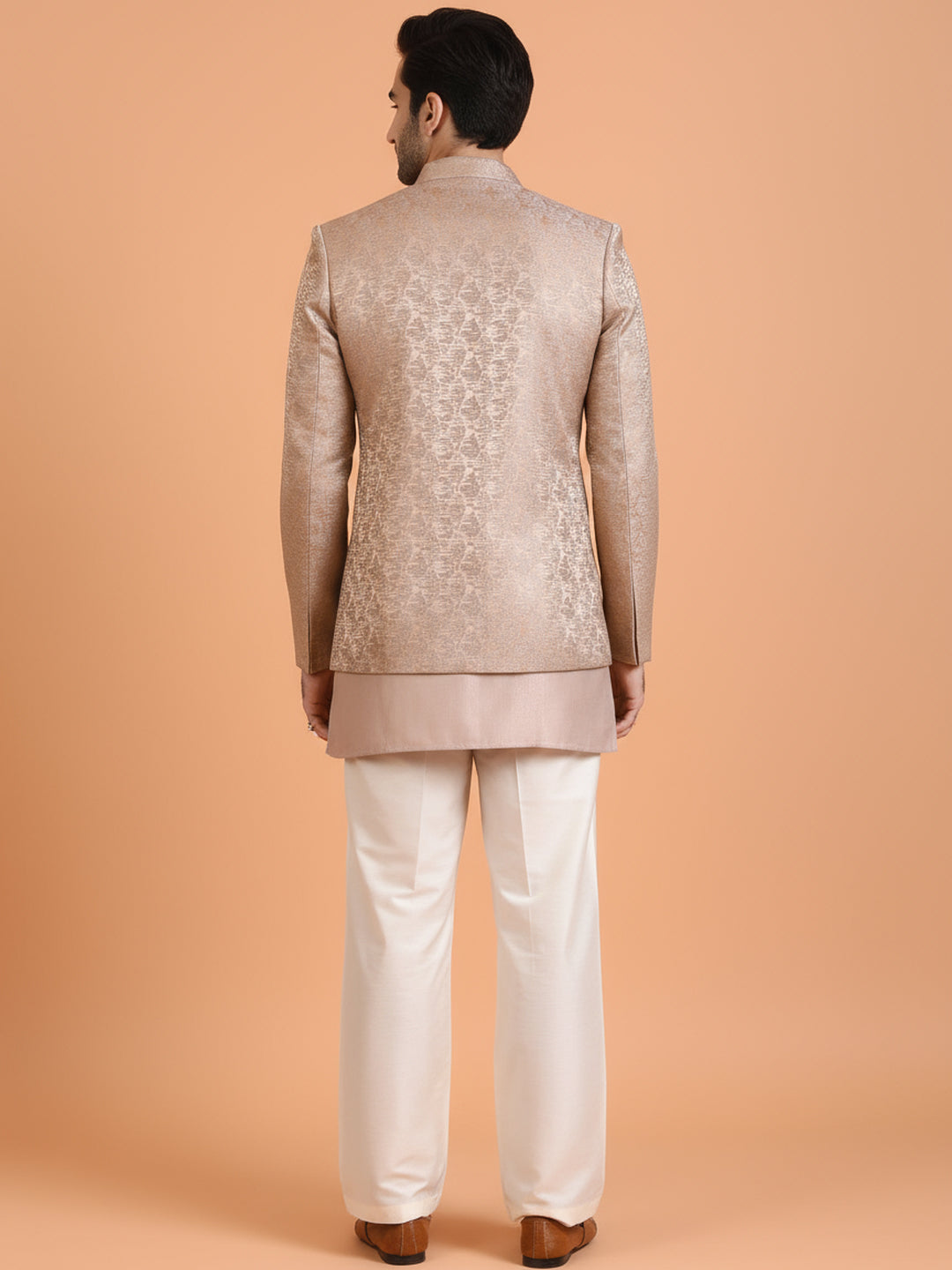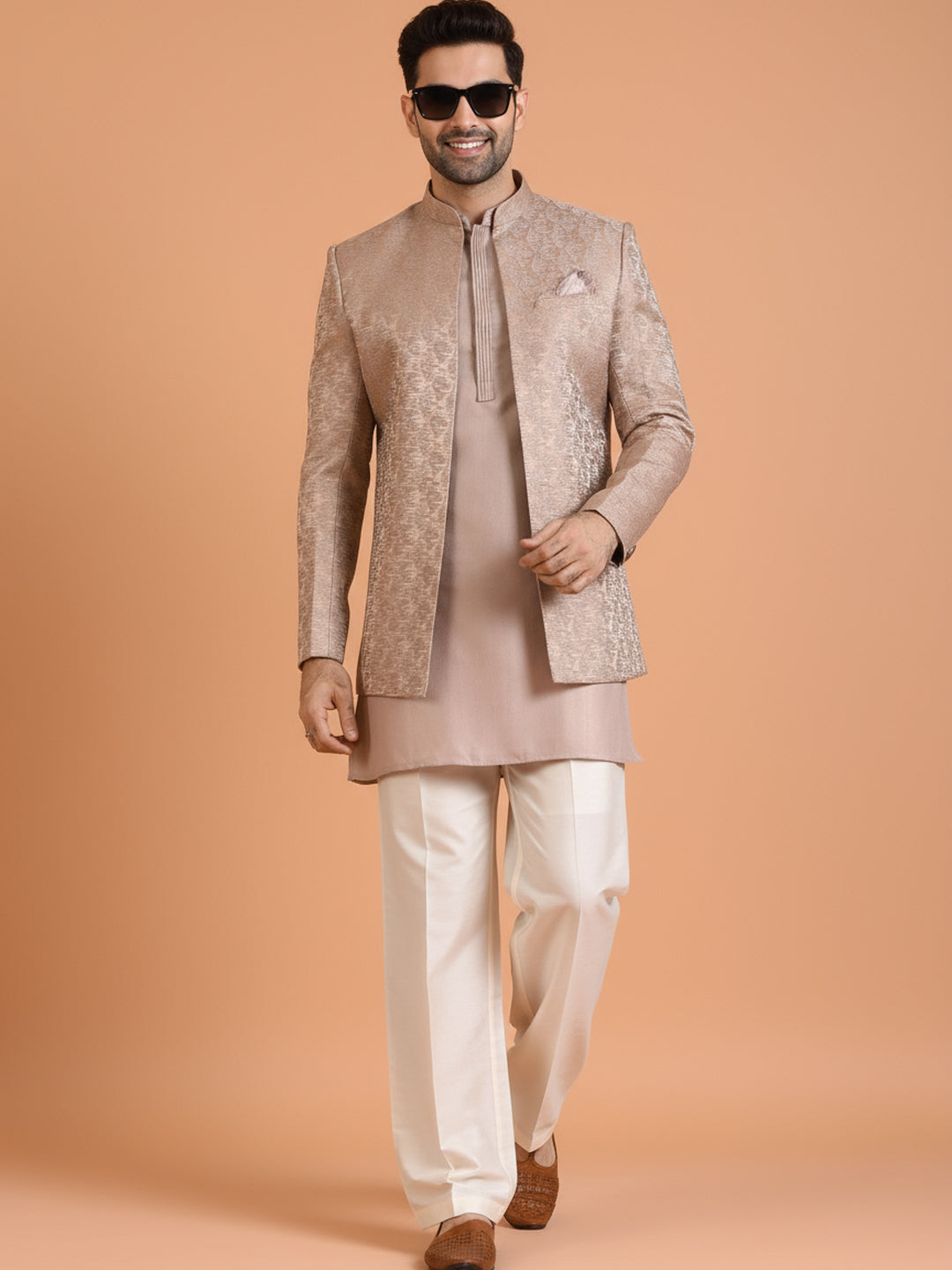 Beige front-open short sherwani with mid kurta and ivory wide-leg trousers — modern, elegant, and perfect for festive occasions.