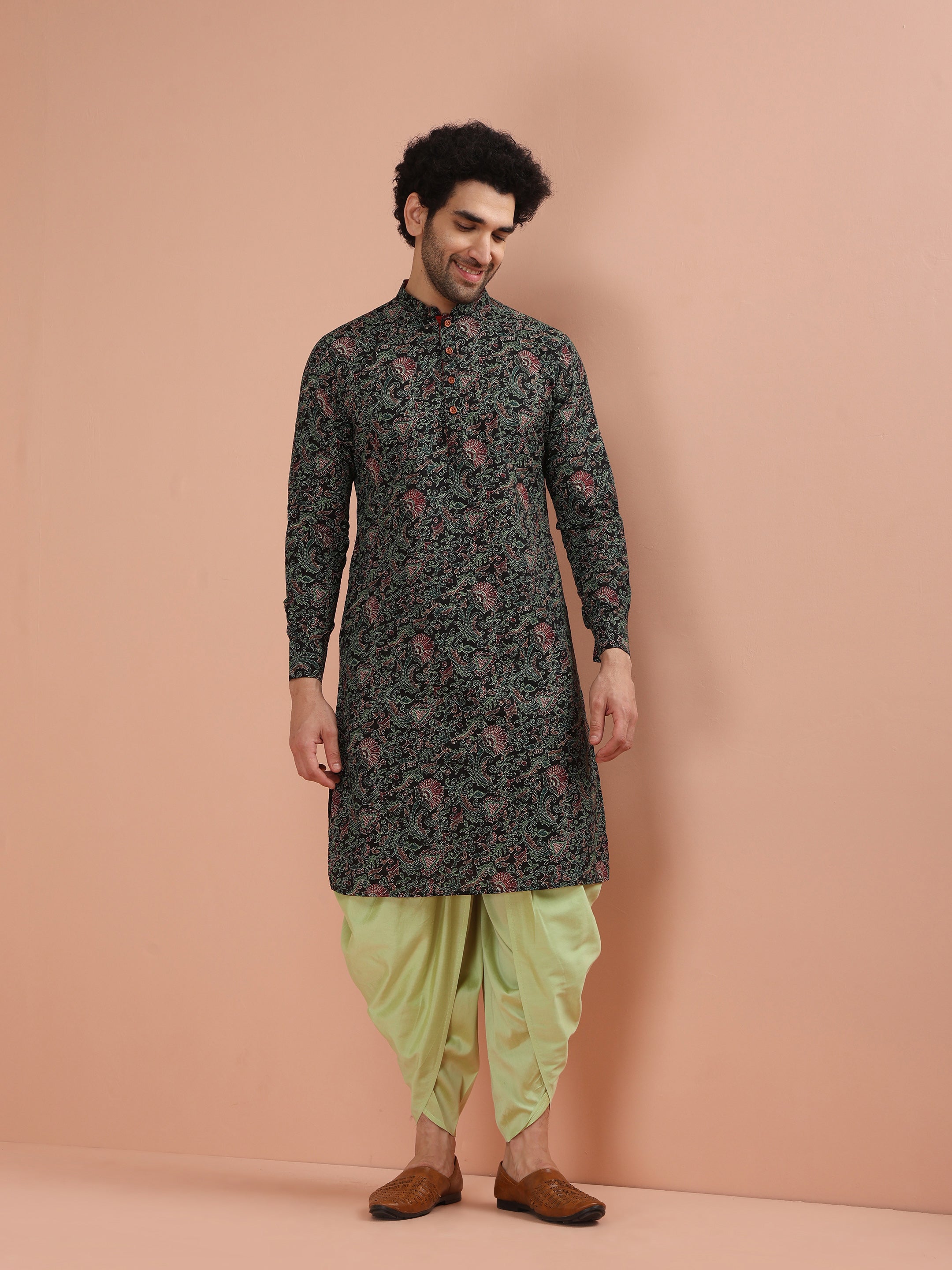 Add a stylish twist to your ethnic wardrobe with our Black Printed Kurta & Dhoti set. Made from a soft cotton blend with a regular fit, this ensemble is ideal for any festive occasion, blending comfort with modern designs.