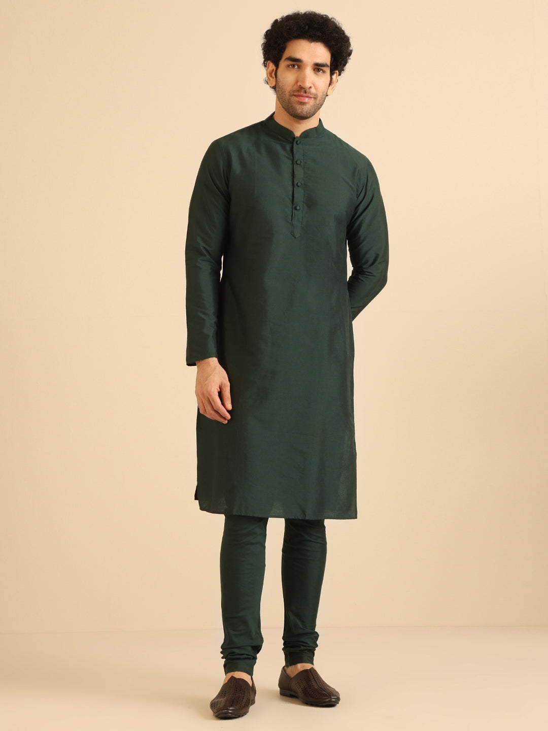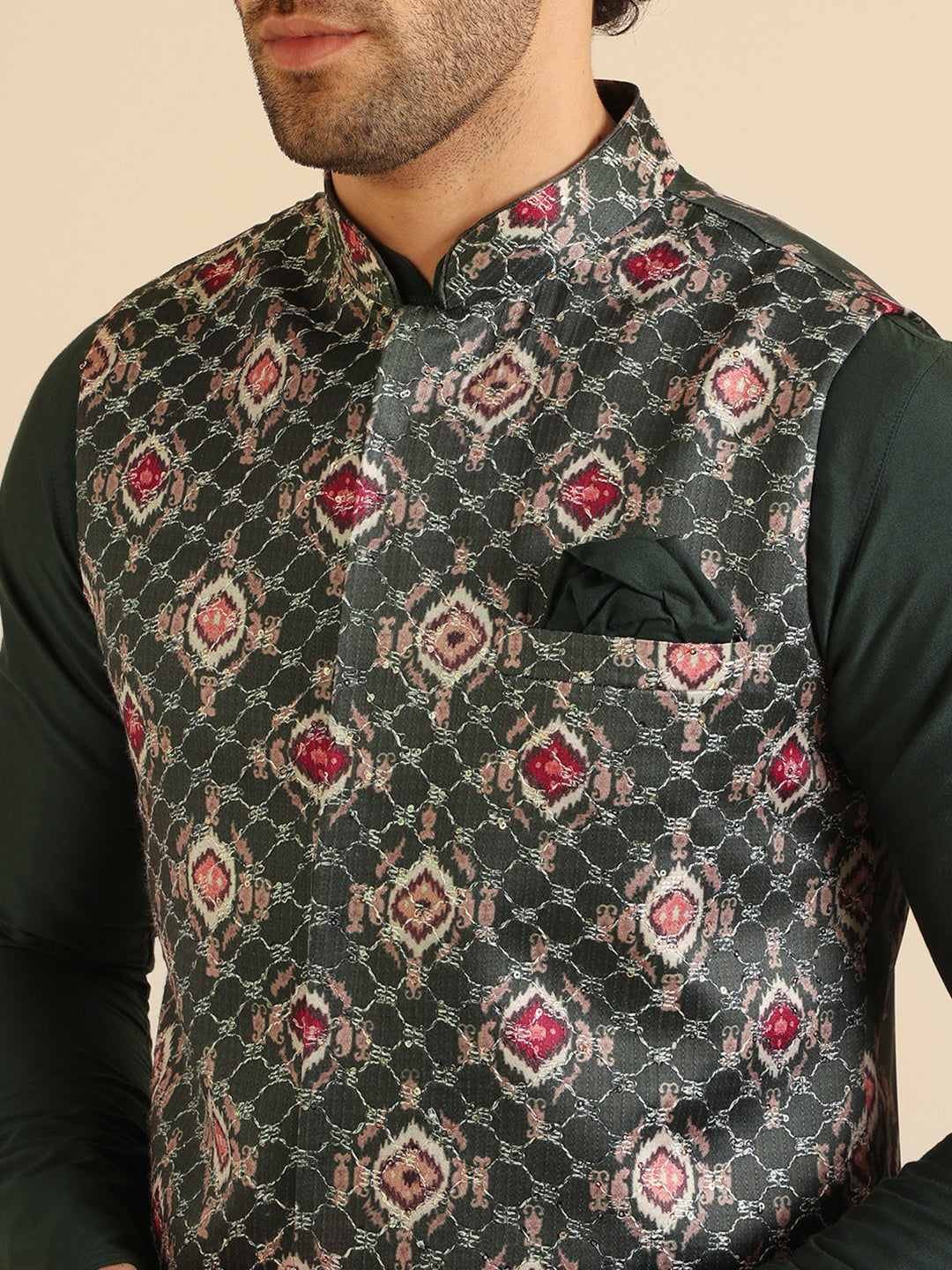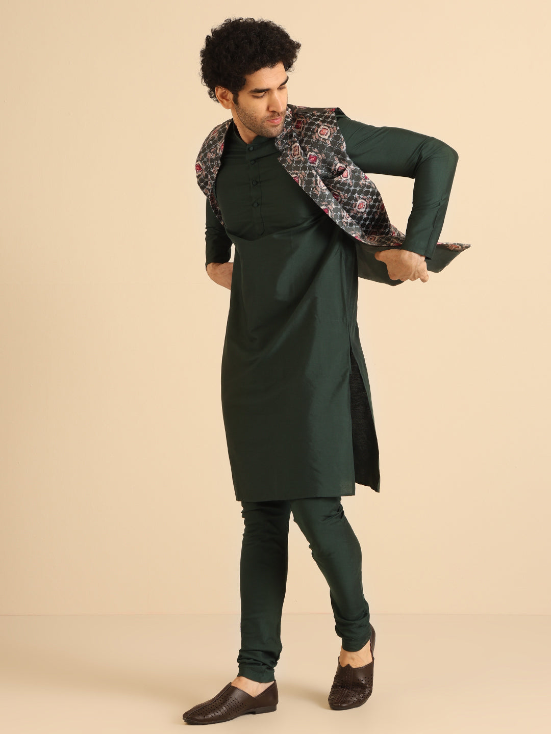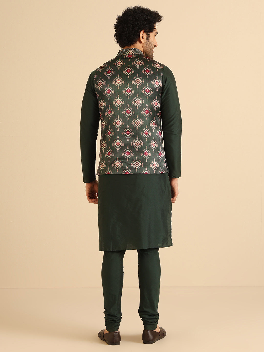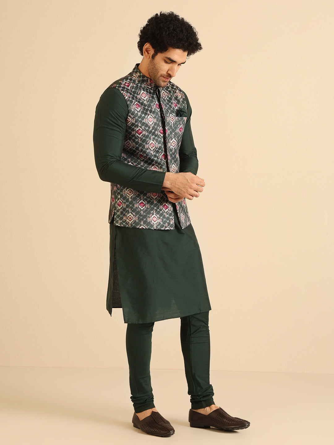 Bottle Green Printed Nehru Jacket Kurta Churidar