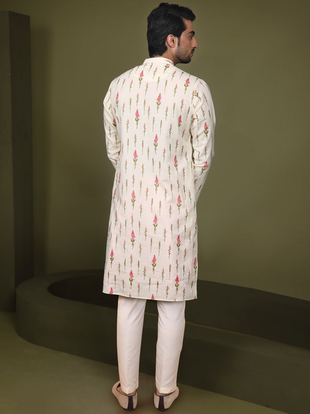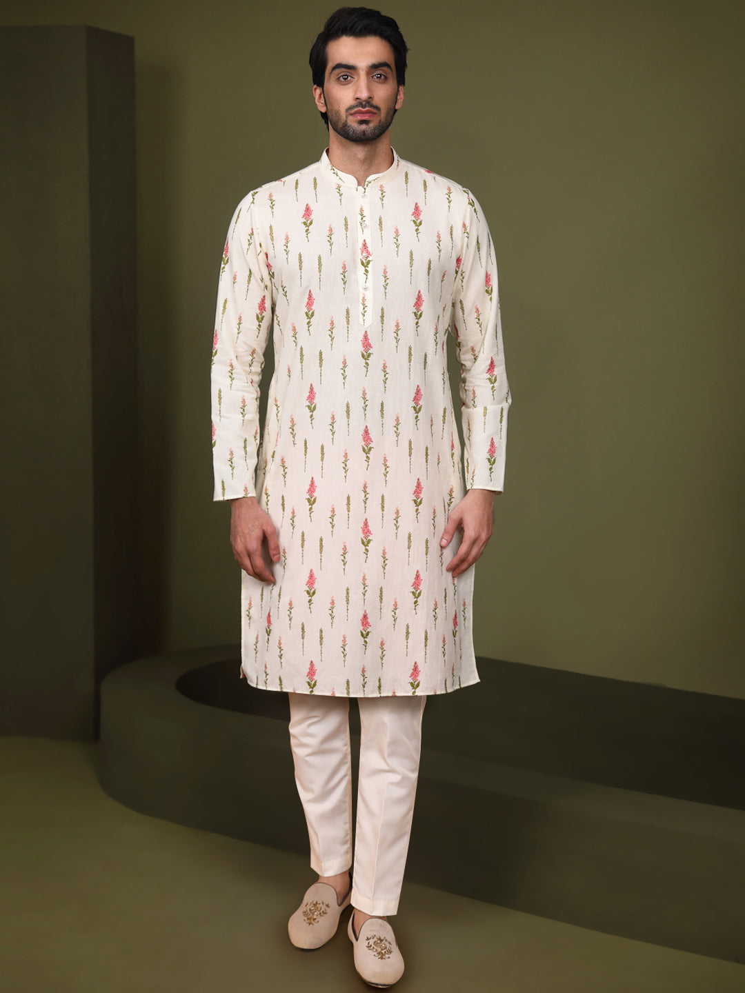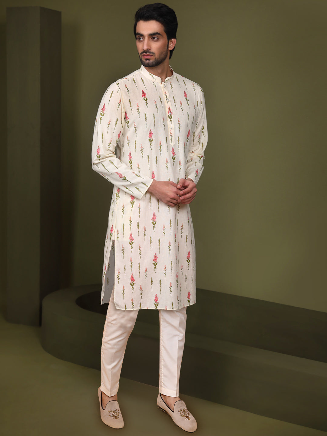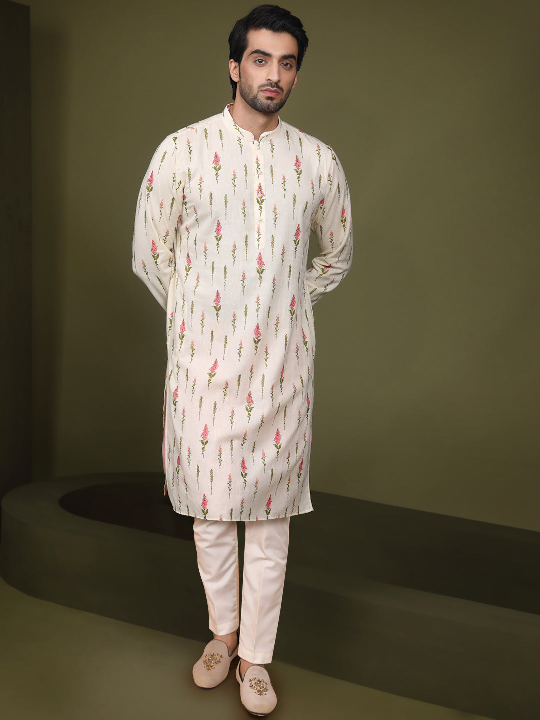 This Kurta Set with Cream Color is an elegant mandarin collar style that is perfect for occasional wear. With a full sleeve Printed design and comfortable fabric, it will make you look stylish.