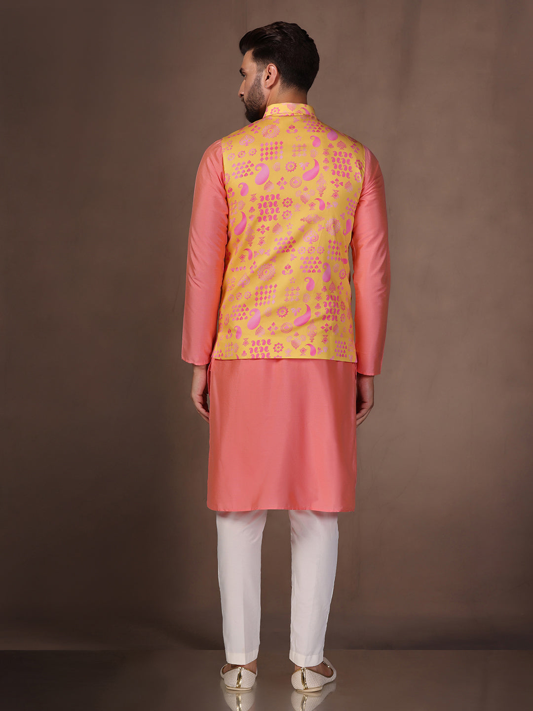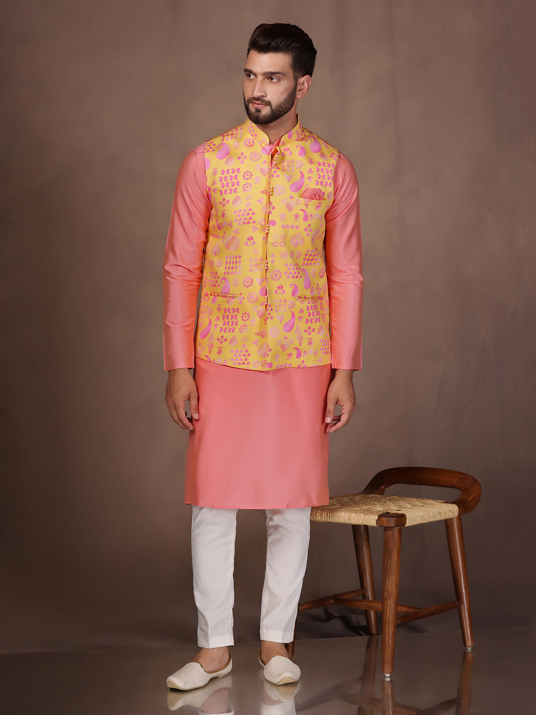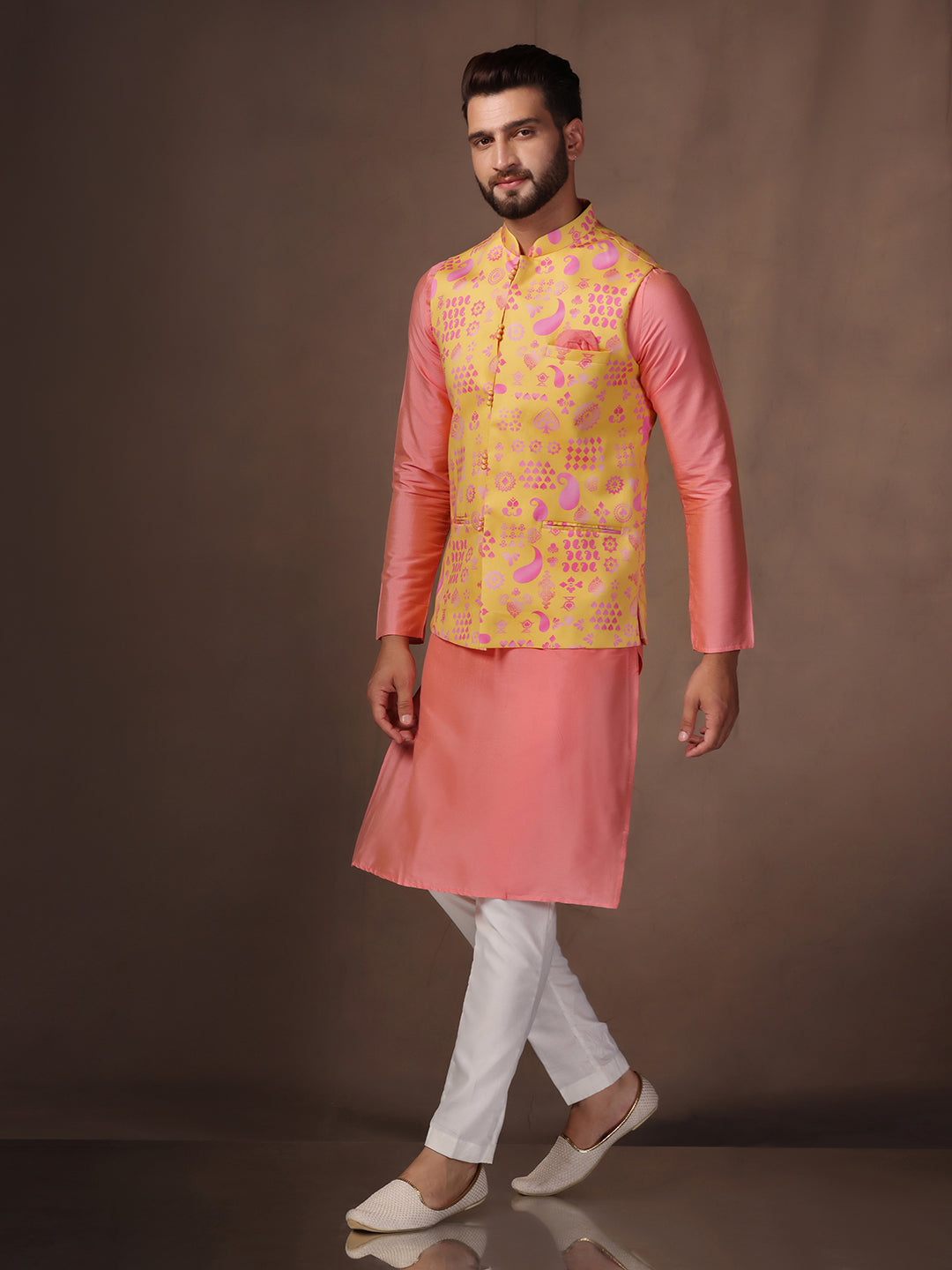 Peach Silk Blend Yellow Printed Nehru Jacket Kurta Set