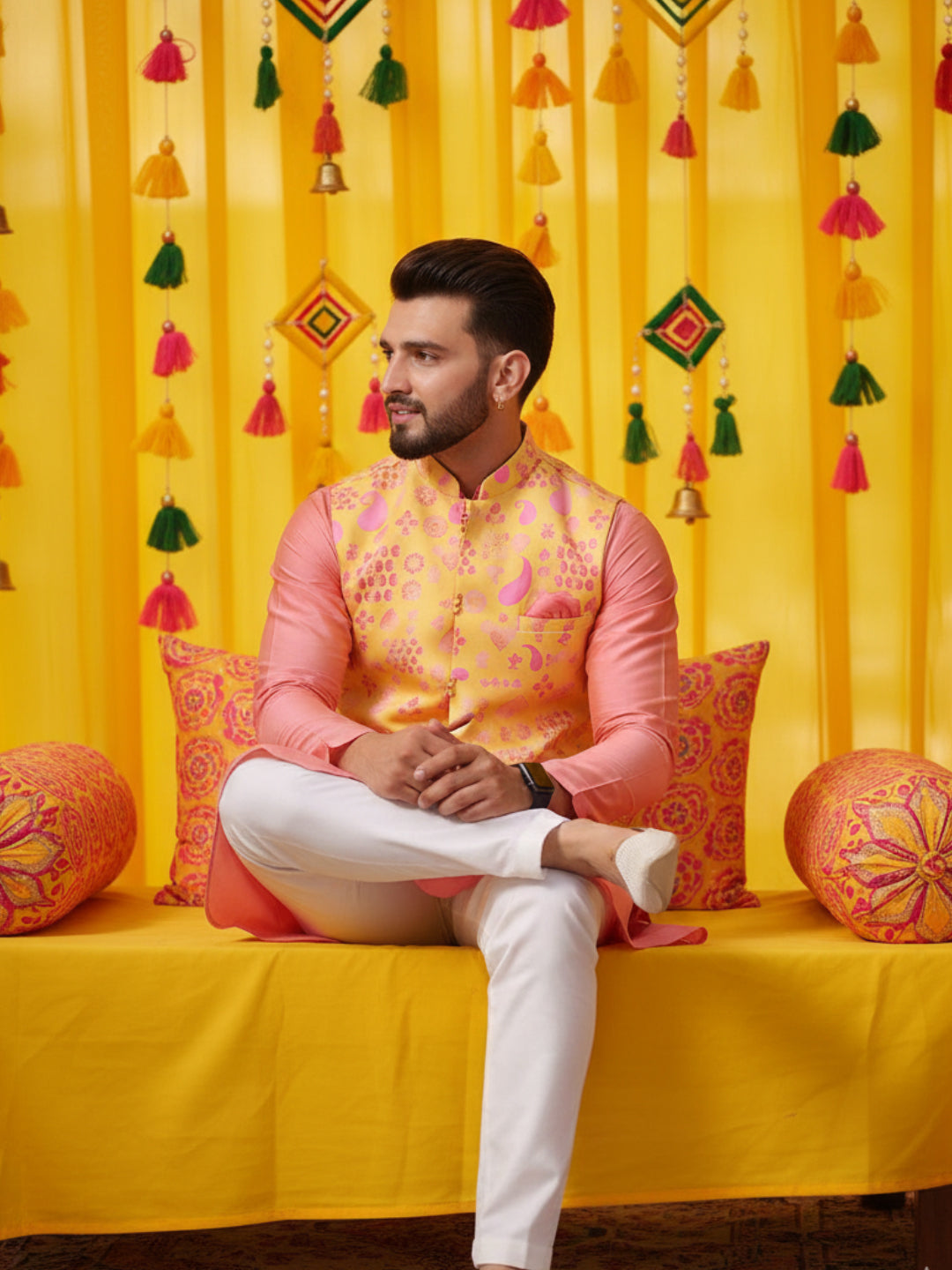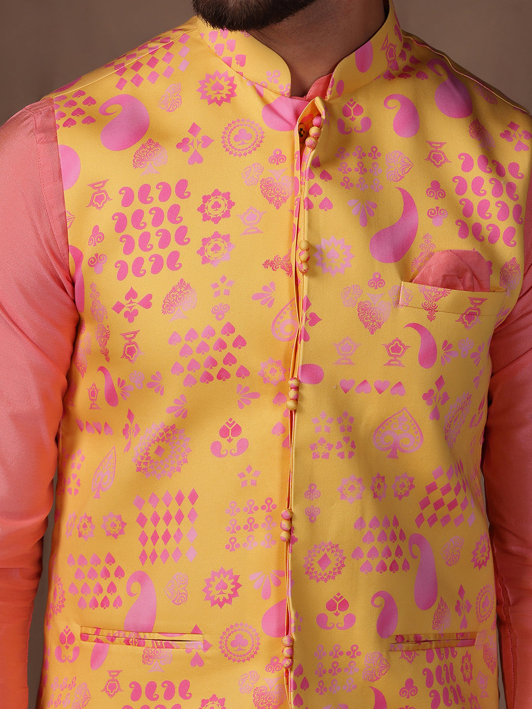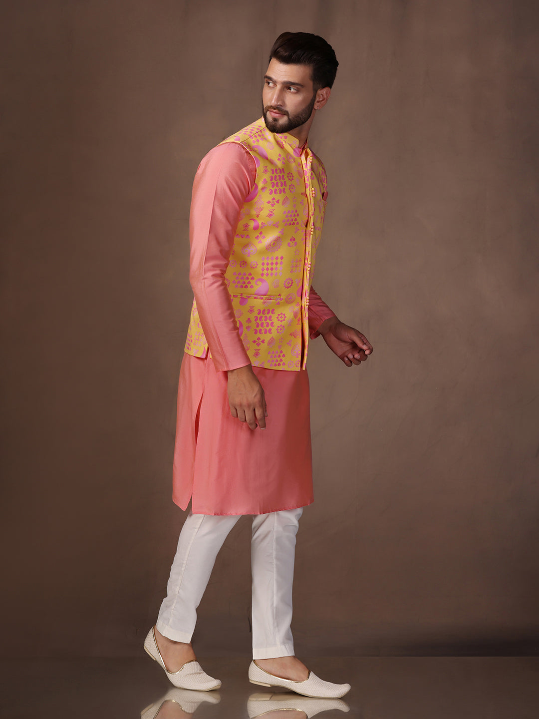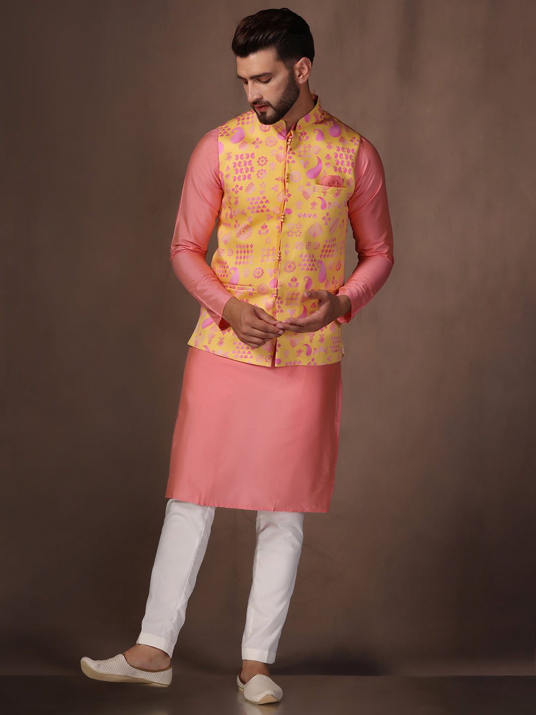Peach Silk Blend Yellow Printed Nehru Jacket Kurta Set